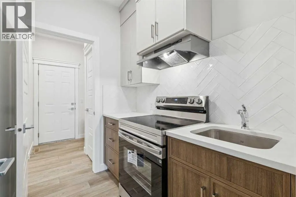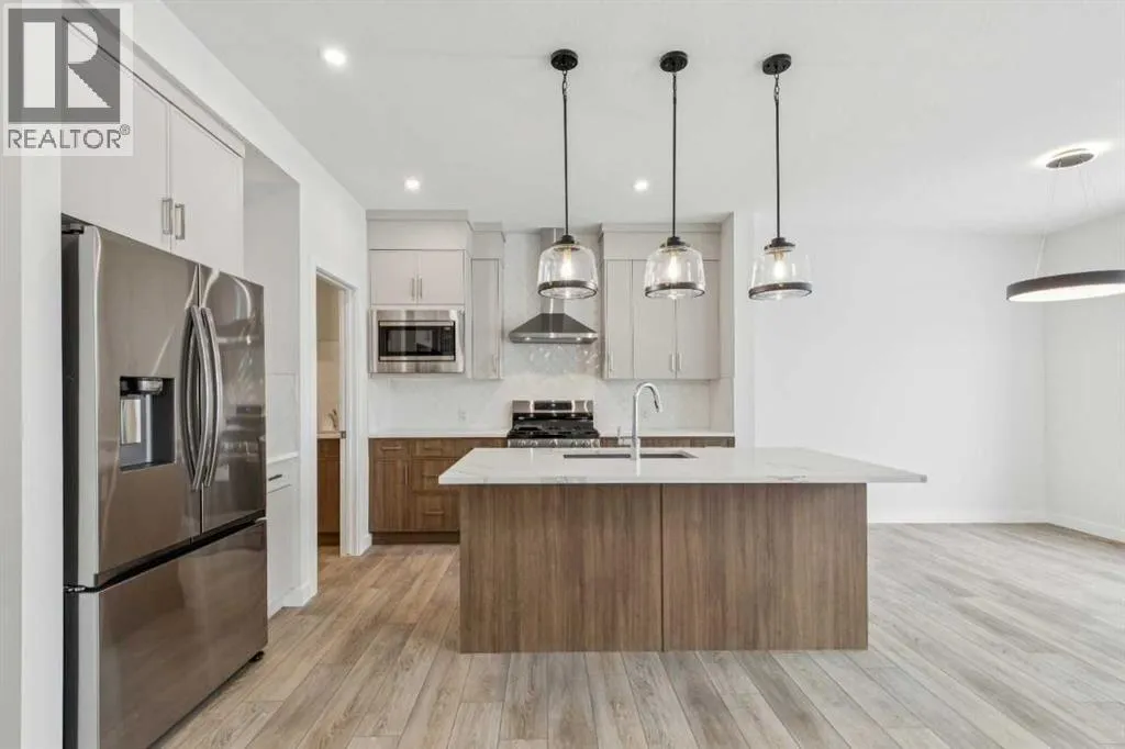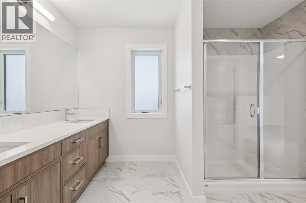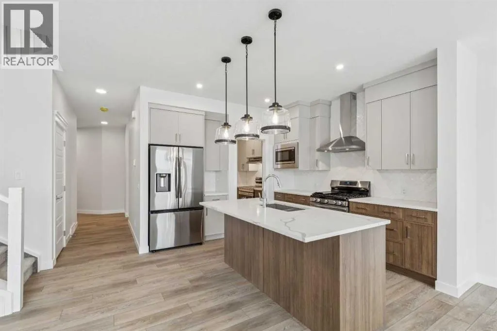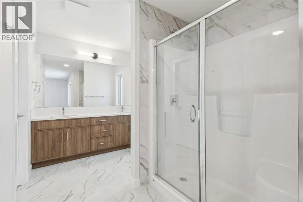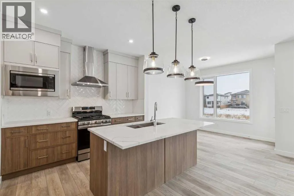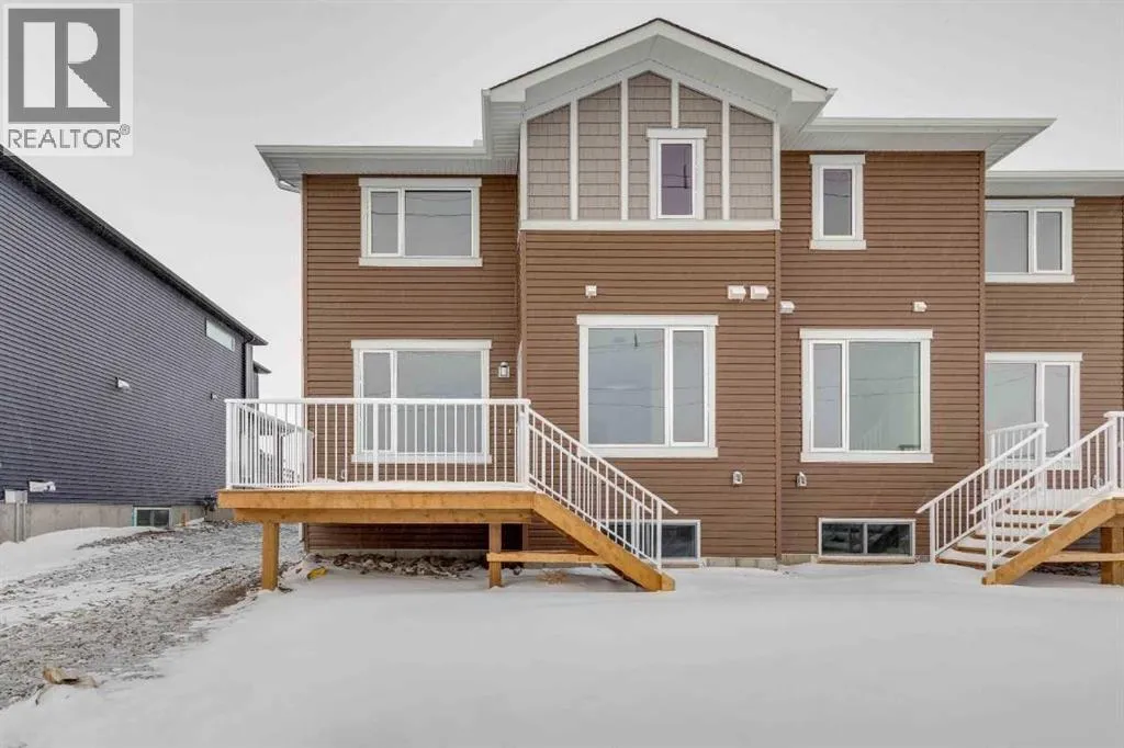 Welcome to The Mitchell by NuVista Homes, located at 257 Dawson Wharf Road in the desirable community of Dawsonâs Landing, Chestermere. This thoughtfully designed 1,874 sq ft home offers 3 bedrooms and 2.5 bathrooms with a functional layout ideal for modern family living. The main floor features 9â foundation and ceiling heights, luxury vinyl plank flooring, a flex room, and a bright great room that flows into a well-appointed kitchen with quartz countertops, taller upper cabinets, and a dedicated spice kitchen. Both the mudroom and front foyer include built-in benches for added everyday convenience. Upstairs, the primary bedroom includes a walk-in closet and private ensuite, complemented by two additional bedrooms, a full bathroom, a media room, and upper-floor laundry. A side entrance provides excellent future basement development potential, while the 12â x 10â rear deck is perfect for summer enjoyment. (id:27476)