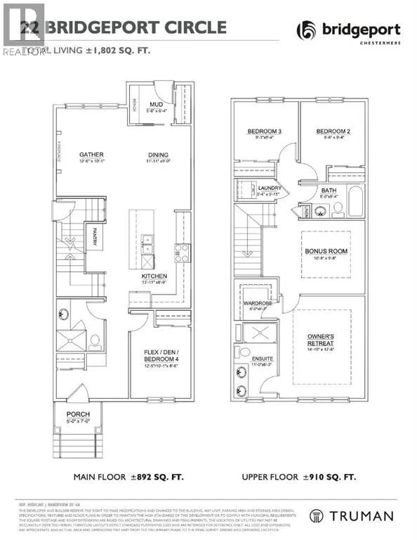 Welcome to this beautifully crafted 4-bedroom + bonus room, 3-full-bath home by Truman in the desirable community of Bridgeport, Chestermere. Thoughtfully designed for modern living, this home offers style, space, and functionality.The open-concept main floor features a bright living and dining area, complemented by a contemporary kitchen with quartz countertops, full-height cabinetry, stainless steel appliances, and ample prep space. A main-floor bedroom and full bathroom provide ideal flexibility for guests or multi-generational living.Upstairs, enjoy a spacious bonus room, convenient laundry, and three well-appointed bedrooms, including a private primary retreat with ensuite. The unfinished basement with separate side entrance offers excellent future development potential.Located close to parks, schools, shopping, and Chestermere Lake, this home combines suburban comfort with easy access to Calgary. *Photo gallery of similar home, finishes will vary* (id:27476)