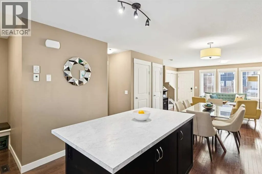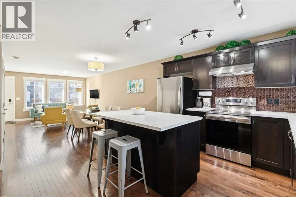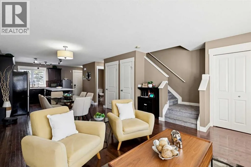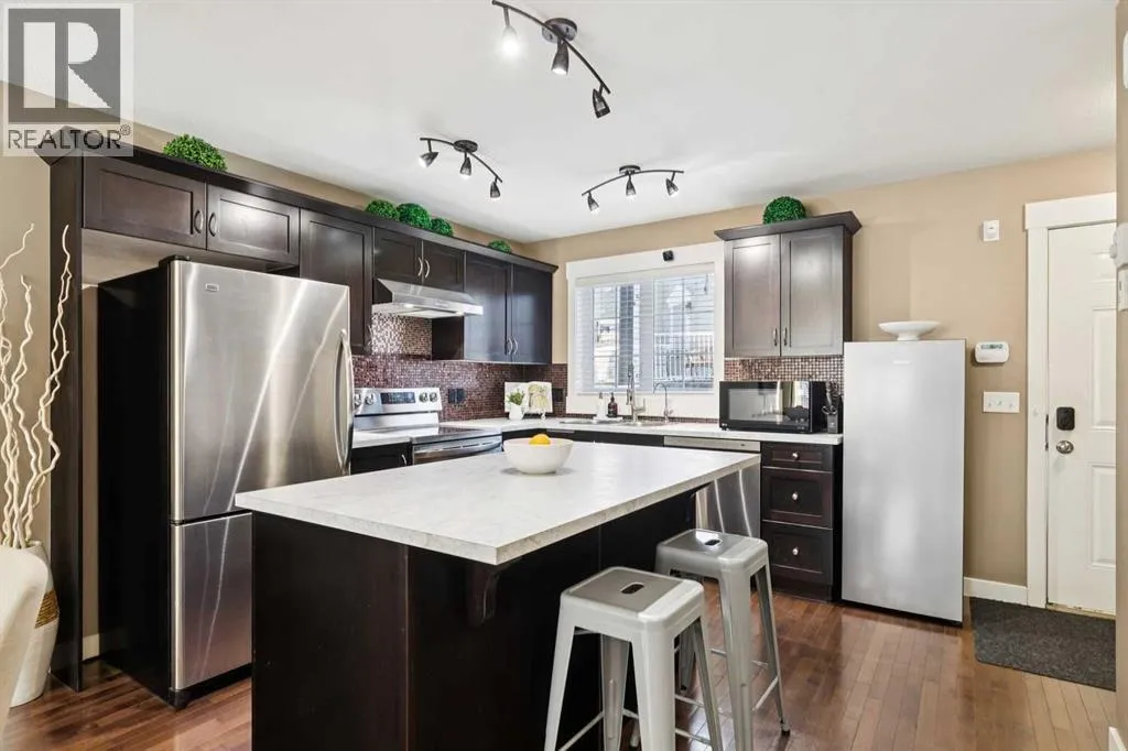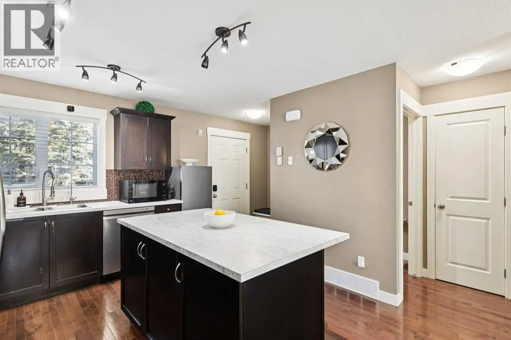 END-UNIT | 3 BEDROOMS | FINISHED BASEMENT | 2 PARKING SPOTS | Welcome to this BRIGHT 3 bedroom end-unit townhome in the established community of RAINBOW FALLS. The main floor offers an OPEN CONCEPT layout designed for everyday living. Large windows bring in NATURAL LIGHT, and the spacious living and dining areas flow seamlessly into the kitchen â creating a layout that works beautifully for both quiet evenings and entertaining. The kitchen features STAINLESS STEEL APPLIANCES, a CENTRAL ISLAND with seating, PANTRY storage, and plenty of cabinetry to keep everything organized. Upstairs, the PRIMARY BEDROOM is a generous size and offers a WALK-IN CLOSET. Two additional bedrooms and a FULL 4-PIECE BATH provide flexibility for family, guests, or a home office. The FINISHED BASEMENT adds valuable living space with a LARGE REC ROOM â ideal for movie nights, a playroom, home gymâ¦whatever you need. Laundry and storage are neatly tucked away with rough-in there if you want to add a future bathroom. UPDATES: Kitchen Countertop (2026), Carpet Basement Stairs (2026), Washer, Stove and Dishwasher (2023), Dryer and Hot Water Tank (2022). Step outside where you can enjoy morning coffee or summer BBQs. Two ASSIGNED PARKING STALLS are located directly out front, with ample VISITOR PARKING nearby. Set within walking distance to schools, playgrounds, pathways, shopping, and the OFF-LEASH DOG PARK â and just minutes to CHESTERMERE LAKE â this home offers the lifestyle buyers are looking for. Whether youâre a FIRST-TIME BUYER, young family, or investor, this MOVE-IN READY townhome checks the boxes. (id:27476)