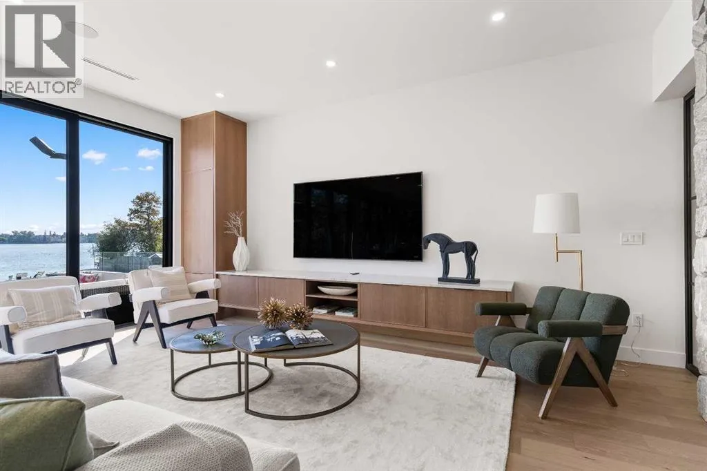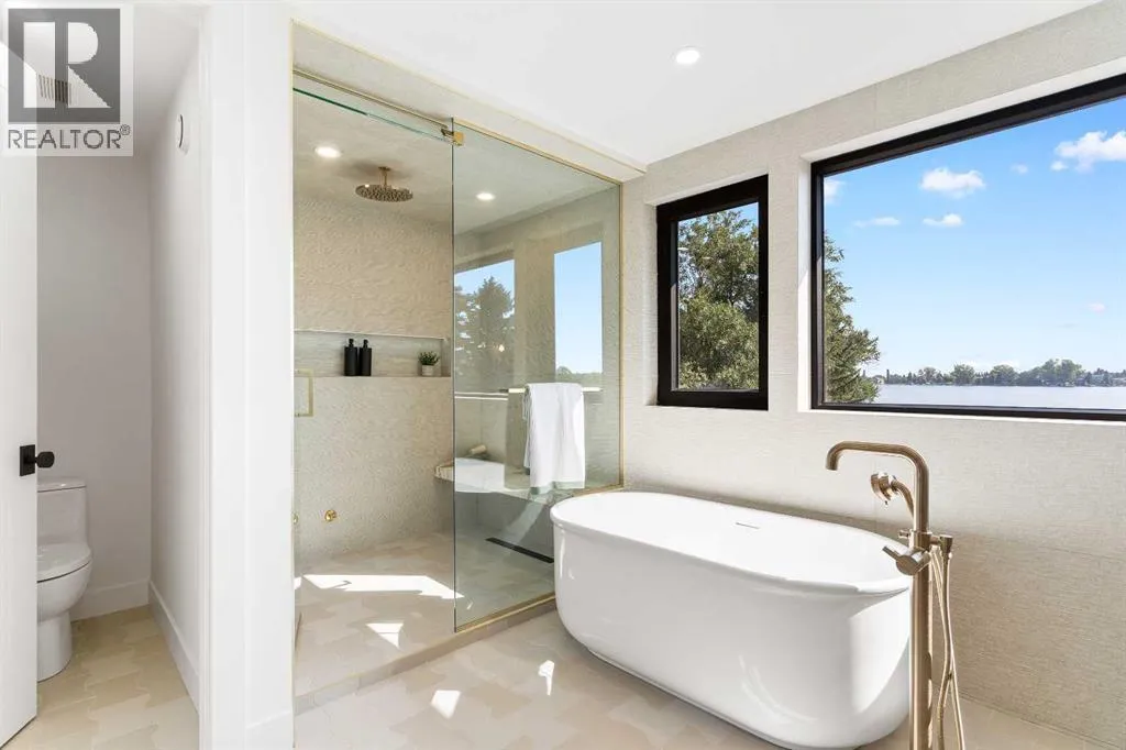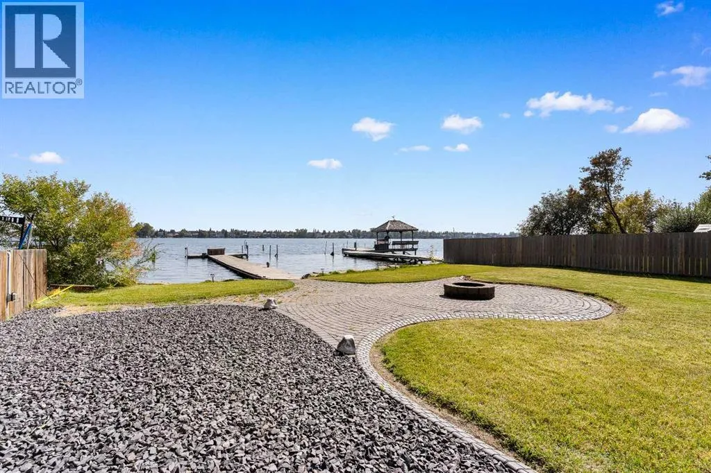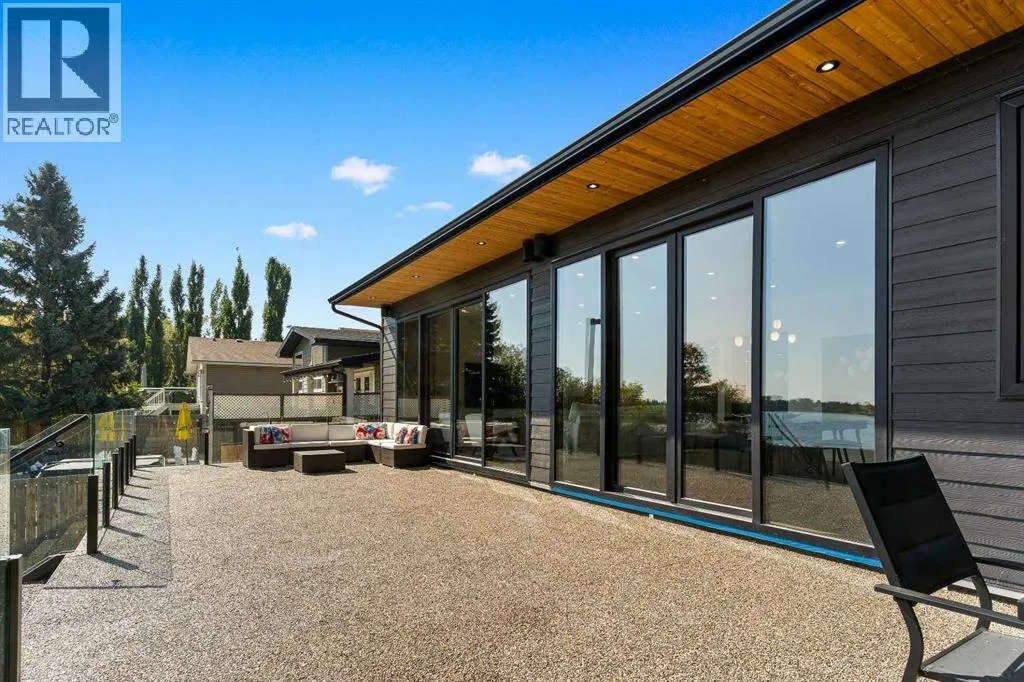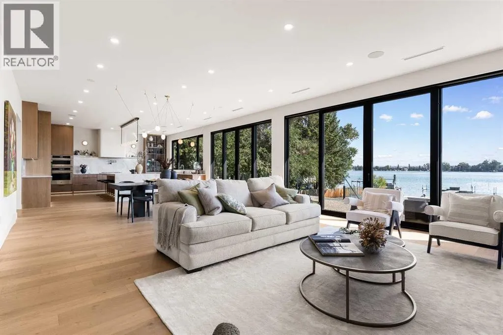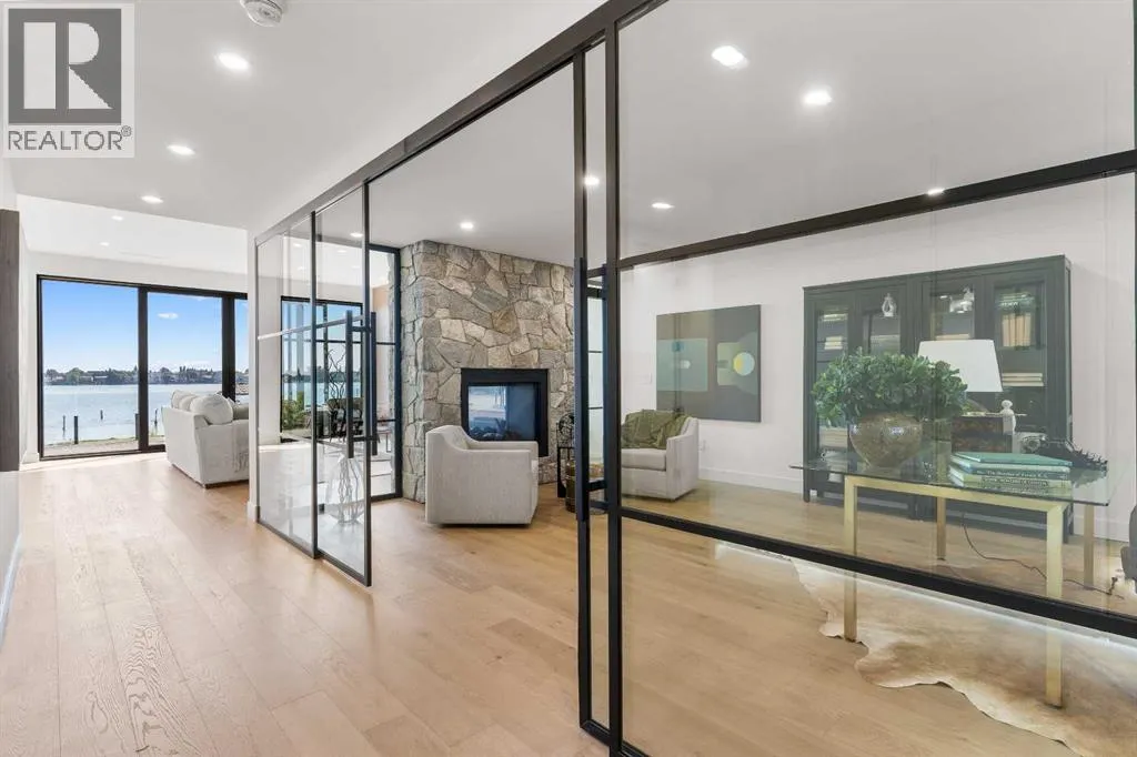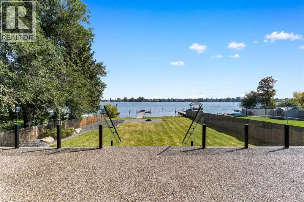 *Welcome to Lakeside Luxury on Chestermere Lake* With 4,482 sq. ft. of fully reimagined living space, this lakefront estate blends architectural sophistication with modern comfort on one of Chestermere Lakeâs most exclusive stretches of shoreline. This complete renovation and design is an intricate remodel + extension, showcasing soaring 10â ceilings, bespoke finishes, and walls of glass that capture sweeping water views. The foyer, framed by a 4 ft. Lux custom glass door, makes a bold first impression with a glass~encased home office and a see~through fireplace leading into the stunning living room. Floor~to~ceiling windows and European sliding doors create seamless flow to the outdoors, where a massive backyard, fire pit, and private dock invite year~round entertaining. At the heart of the home, the chefâs kitchen is a masterpiece ~ anchored by a Taj Mahal natural quartzite island, complemented by JennAir appliances, a butlerâs pantry, and a limewashed plaster custom hood fan that compliments the natural stone backsplash. Brizo plumbing fixtures in champagne bronze + matte black, Lo & Co + Emtek hardware; and custom~designed lighting elevate every detail, while white oak cabinets and hardwood floors add warmth and texture throughout the home. A spacious mudroom that rivals the aesthetic of any competing luxury home, leads to the 4~car garage with a tucked~away workshop. The garage floor was transformed with a stunning, heated, metallic epoxy finish, providing both beauty and durability. LED sensors throughout the home create an unrivalled nighttime ambiance, and an exposed epoxy rear deck extends the entertaining space. Upstairs, a vaulted bonus room with the homeâs original fireplace nods to its heritage, while a dual~desk workstation in the hallway adds functional elegance. Two secondary bedrooms and two larger master waterfront retreats capture lakeside serenity perfectly. The primary suite is pure indulgence, featuring a spa inspired ensuite with a steam showe r, heated bench and floors, which flows seamlessly to a massive walk in closet with micro~shaker drawers and velvet encasements. Even the laundry room makes a statement, with classic black and white checkered flooring adding a charming and whimsical touch to this architectural marvel. This is more than a home ~ itâs a statement in design, craftsmanship, and lakefront living. (id:27476)