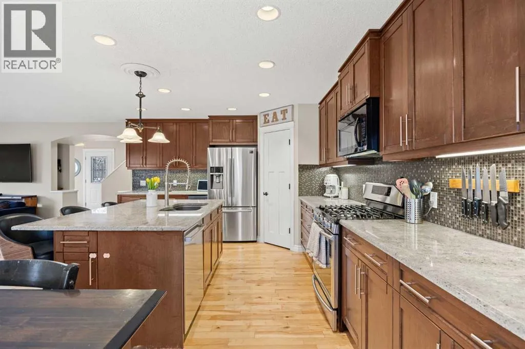 THIS IS THE ONE YOUâVE BEEN WAITING FOR!!! HOMES WITH THIS MANY FEATURES â RENOVATED ENSUITE, AIR CONDITIONING, HEATED GARAGE, CORNER LOT, RENOVATED BATHROOMS + an INCREDIBLE KITCHEN â DONâT COME ALONG OFTEN!!! Welcome to this BEAUTIFUL FAMILY HOME offering over 2683 SQ.FT. of developable living space & a KITCHEN that will absolutely STEAL THE SHOW!!!Perfectly situated on a LARGE CORNER LOT, this home offers EXTRA PRIVACY with NO NEIGHBOURS ON ONE SIDE plus ADDITIONAL PARKING â a feature buyers are always looking for!Step inside to a WELCOMING FOYER featuring HARDWOOD FLOORS and UPGRADED BASEBOARDS throughout, creating a bright and polished first impression. The SPACIOUS LIVING ROOM provides the perfect place to relax, while the INCREDIBLE KITCHEN is designed for both everyday living and entertaining. Youâll love the BEAUTIFUL DARK CUSTOM CABINETRY, GRANITE COUNTERTOPS, LARGE ISLAND with UNDERMOUNT SINK + UPGRADED FAUCET, GLASS TILE BACKSPLASH, and CORNER PANTRY â a space that is both stylish and incredibly functional.The BRIGHT DINING AREA flows seamlessly off the kitchen and features DIRECT ACCESS TO YOUR BACK DECK, making it perfect for hosting family and friends. The main floor also includes a CONVENIENT LAUNDRY / MUD ROOM that has been UPGRADED with BEAUTIFUL TILE FLOORING and CUSTOM LOCKERS, helping keep everyday life organized and clutter-free, along with a 2-PIECE BATHROOM.Upstairs youâll find a large BONUS ROOM featuring a CORNER GAS FIREPLACE â the perfect space for movie nights, watching the big game, or relaxing at the end of the day. The PRIMARY BEDROOM is spacious and now features a BEAUTIFULLY RENOVATED ENSUITE complete with a LUXURY TILED TUB / SHOWER, CLASSY TILE FLOORING, and a STYLISH NEW VANITY â creating a true spa-like retreat. Two additional spacious bedrooms with large windows provide plenty of room for family, guests, or a home office, along with an UPDATED BATHROOM with STUNNING walk in TILE shower!! The basement is currently used a s a workshop and awaits your creative touch. The expansive backyard offers plenty of room to enjoy the outdoors and features a spacious 2 tier deck that is PERFECT for Summer BBQS, entertaining friends or RELAXING IN THE SUN!!And donât forget the spacious garage featuring a GAS HEATER, making winter mornings in Alberta MUCH more comfortable!FANTASTIC LOCATION!!! Just down the street from a PLAYGROUND, around the corner from SCHOOLS, and only minutes to the LAKE and local amenities.BOOK YOUR SHOWING TODAY!!! (id:27476)