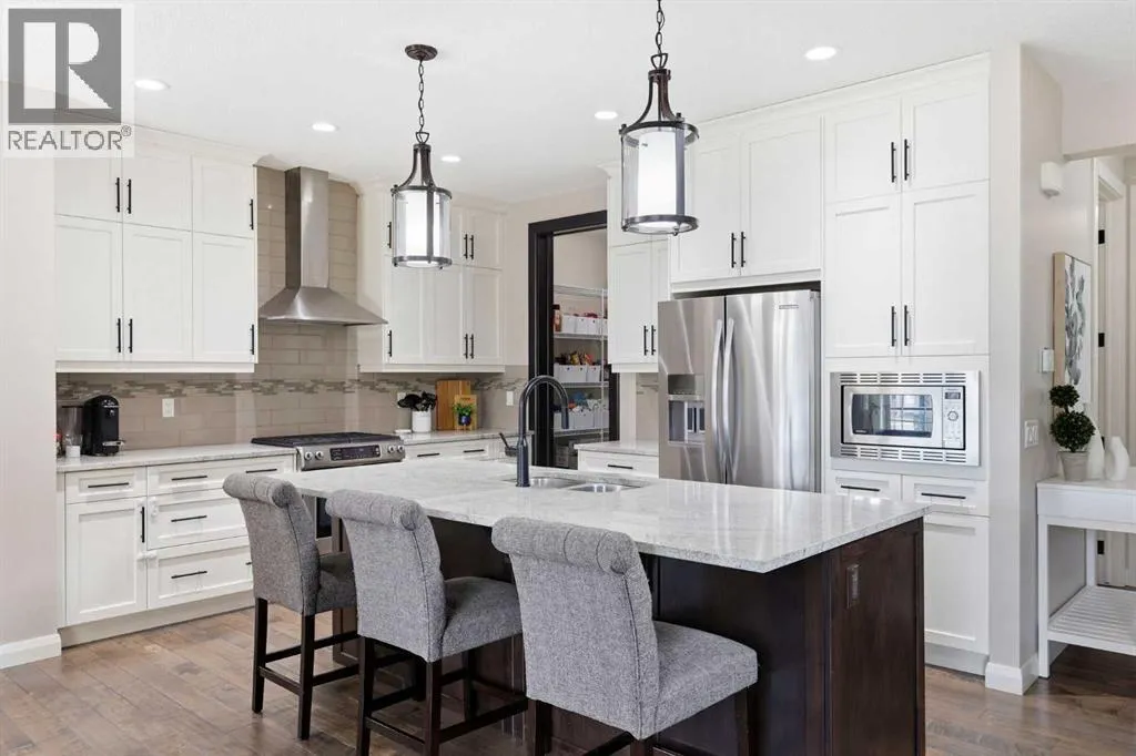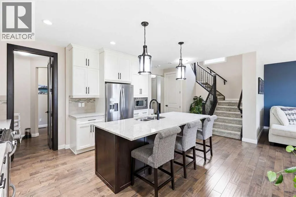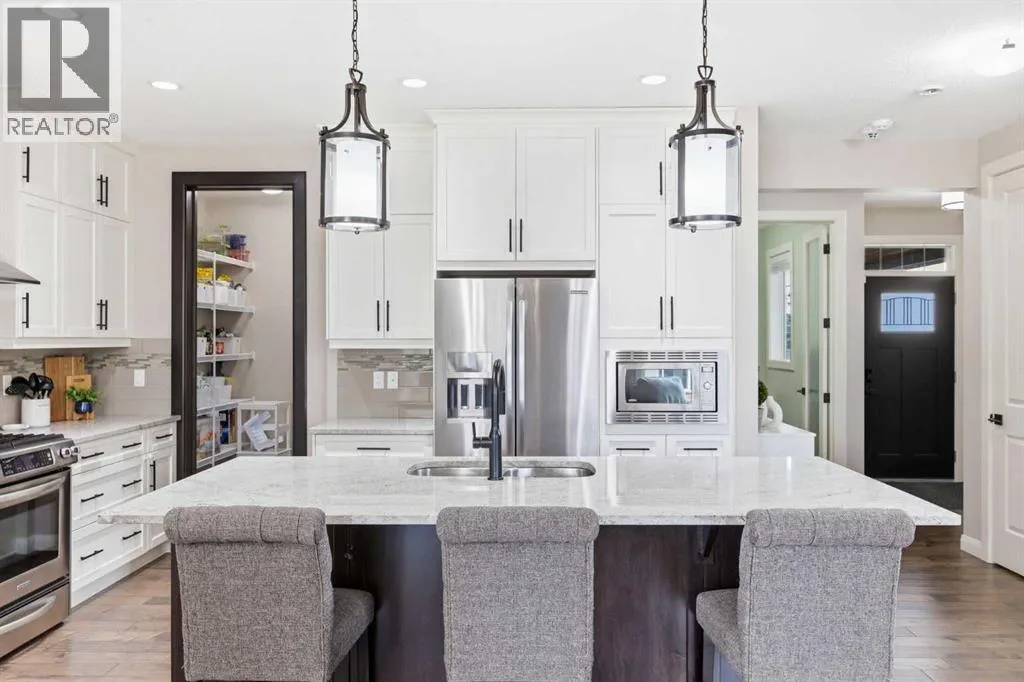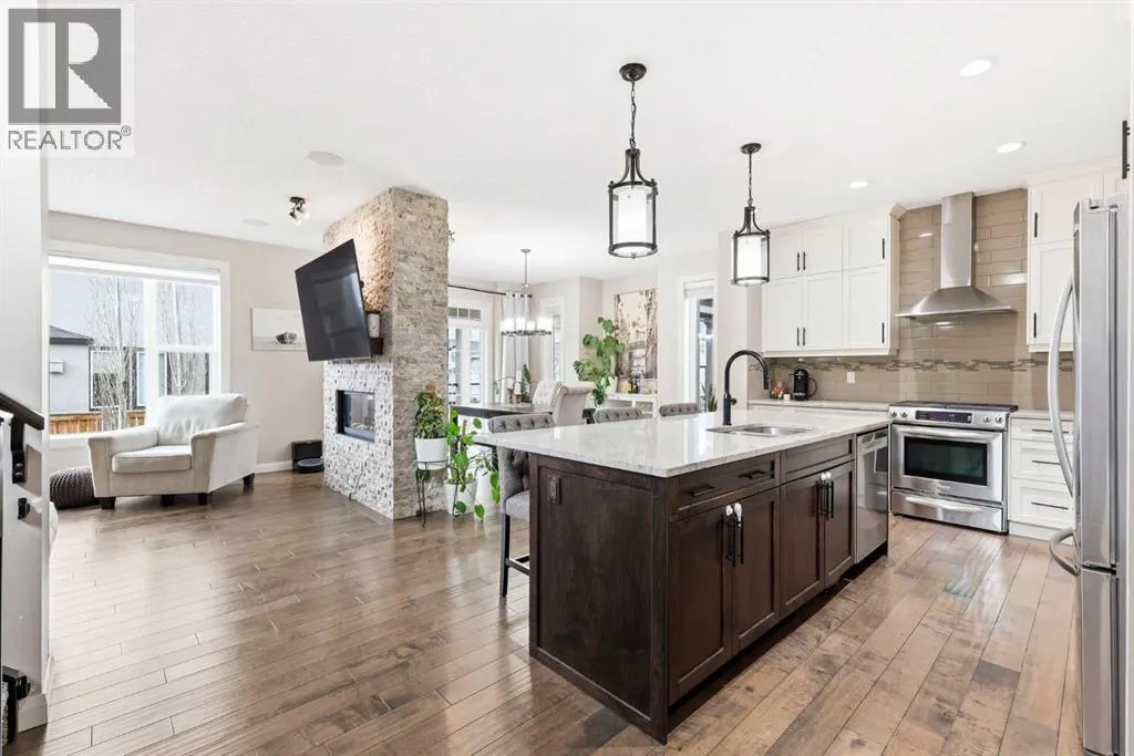 Welcome to 113 Kinniburgh Way, a stunning family home wrapped in premium concrete fibre siding, nestled in Chestermereâs highly desirable Kinniburgh community. Boasting over 2,400 sq. ft. of bright, above-grade living space, the open-concept main floor is elevated by soaring 9ft ceilings and built-in in-home speakers. The layout is designed for both entertaining and everyday life, featuring a dedicated home office, a spacious living and dining area, and a gorgeous kitchen showcasing granite counters and a walk-through pantry. This connects right to the mudroom and the oversized 24' x 22' heated double attached garage, complete with ample storage, and luxury Epoxy flooring, making Alberta winters a breeze.Upstairs, you'll find a massive family room perfect for movie nights, an upper-level laundry room, and three generous bedroomsâincluding a luxurious primary suite with a large walk-in closet and a spa-like 5-piece ensuite. The fully finished basement adds incredible value with a sprawling 25' x 25' rec room, a private fourth bedroom, and an additional full bath. Outside, your backyard oasis awaits: enjoy summer evenings on the maintenance-free composite covered deck complete with built-in lighting, overlooking a beautifully landscaped yard equipped with a convenient irrigation system and an oversized shed for extra storage. Located just minutes from Chestermere Lake, top-rated schools, and parks, this exceptional 4-bedroom, 3.5-bath home truly has it all, including A/Câschedule your private showing today! (id:27476)