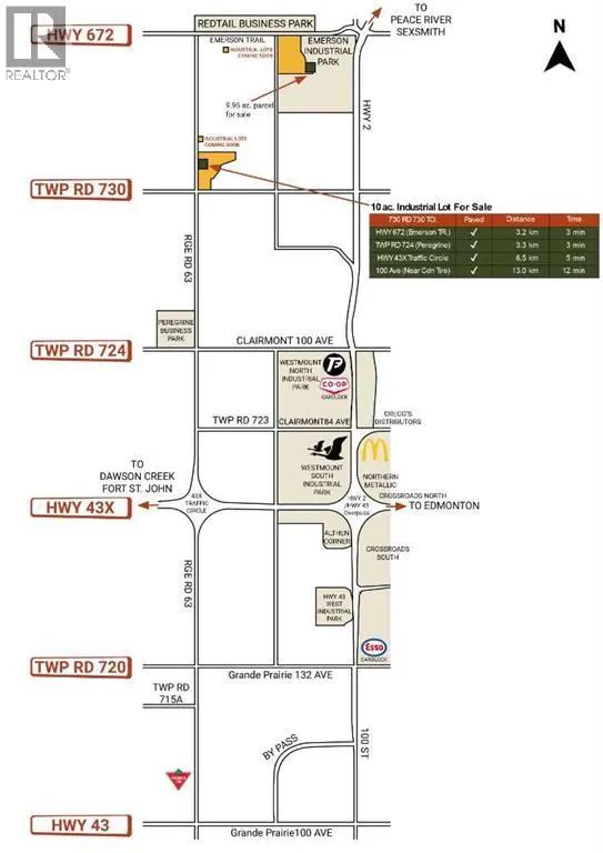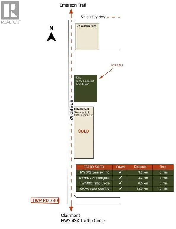 This subdivision â at just the right time! With the new HWY 43X traffic circle now fully operational and moving heavy traffic quickly, this strategically located subdivision puts you exactly where you need to be. Enjoy quick, efficient access to 43X via Range Road 63 (116 Street) by heading south, or head east to Emerson Trailâpassenger vehicles enjoy unparalleled access to both popular truck routes in five minutes or less.You get the visibility of a high-traffic corridor without the frustration of city congestion. Traffic flows, routes are easy to access, and time is saved. With Clairmont just minutes away, fuel stops are also quick and convenient, whether arriving late at night or heading out early in the morning.This 10 acre parcel is already approved, with additional lots coming soonâso if 10 acres works, but you'd like a second lot too for even more space, explore that opportunity here. This parcel is ready for title. 4-5 weeks for title. Call your agent to learn more. (id:27476)