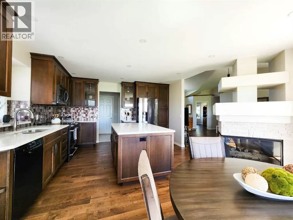 Golf Course Living at Its Finest â Immaculate Custom Home on the 7th Fairway in Claresholm.Welcome to this beautifully appointed custom home, perfectly situated along the 7th fairway of the Claresholm Golf Course. With breathtaking views from nearly every room, this 2-bedroom plus den (or optional 3rd bedroom), 2-bath residence offers modern updates and thoughtful functionality â ideal for retirees, professionals, or families seeking serene golf course living.Lovingly maintained by its original owner, the home was extensively renovated just five years ago and features a refined, open-concept layout with high-end finishes throughout.Step through the tiled foyer and into the airy main living space, where vaulted ceilings and oversized picture windows flood the home with natural light and stunning fairway views. The living room is anchored by a dramatic three-sided glass fireplace, framed by custom built-in shelving and decorative ledges â perfect for plants, art, or curated collections.The chefâs kitchen is the heart of the home, featuring floor-to-ceiling custom cabinetry, quartz countertops, a stylish tile backsplash, and a large center island with storage â ideal for entertaining. A generous pantry offers excellent storage, while a patio door lead directly to a spacious, maintenance-free deck â perfect for al fresco dining and sunset cocktails.The main floor also includes a versatile front den or third bedroom, a beautifully updated 4-piece bathroom, and a spacious secondary bedroom. The luxurious primary suite is a true retreat, offering private deck access and uninterrupted views of the golf course. The spa-inspired ensuite boasts a walk-in tiled shower with glass blocks which allows loads of natural light , double quartz vanity with high end cabinetry.Additional highlights include an expansive DuraDeck deck with tinted glass panels and aluminum railings, offering unobstructed views of the golf course. Inside, you'll find engineered hardwood and til e flooring throughout the main level, along with a convenient main floor laundry room located just off the kitchen. The 21' x 24' double attached garage includes a man door for easy backyard access. A spacious unfinished basement provides endless potential for future development. The low-maintenance yard and exterior ensure carefree living year-round.This is your opportunity to own a meticulously cared-for home in one of Claresholmâs most desirable golf course communities â where elegance, comfort, and lifestyle come together. (id:27476)