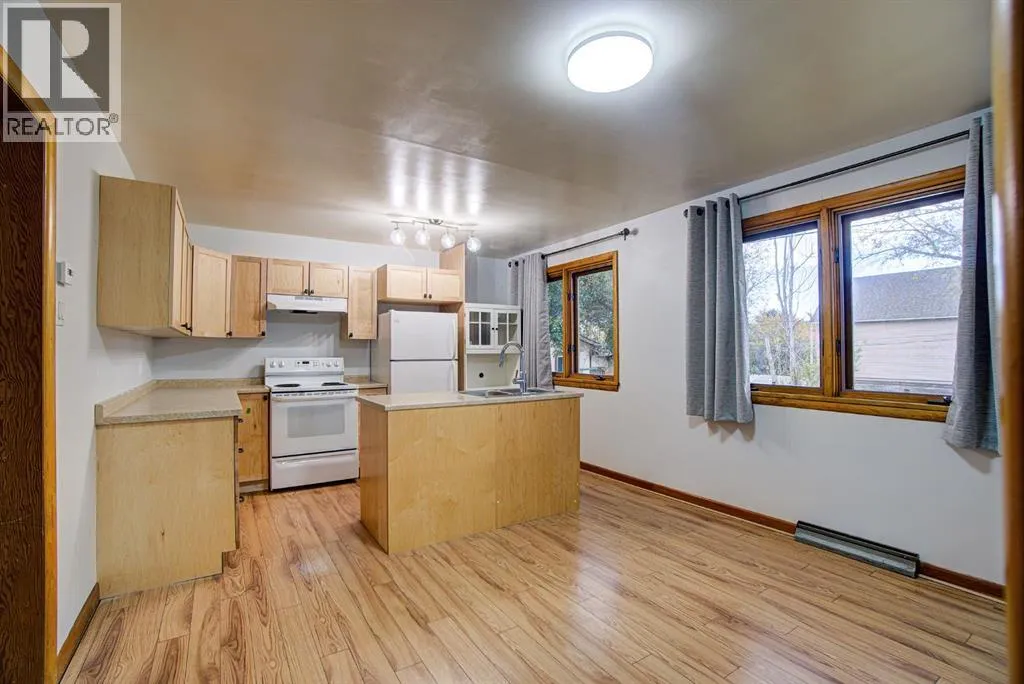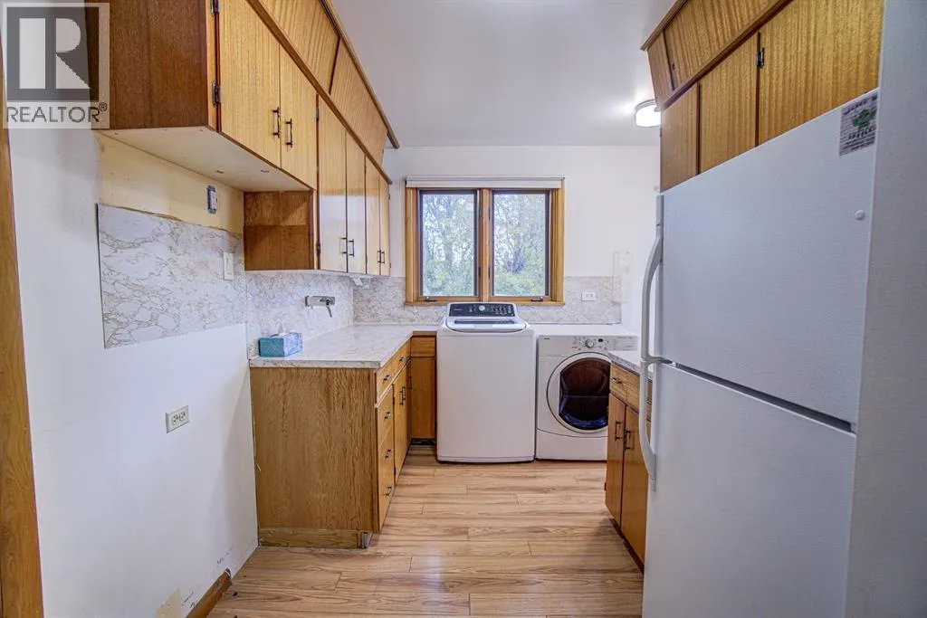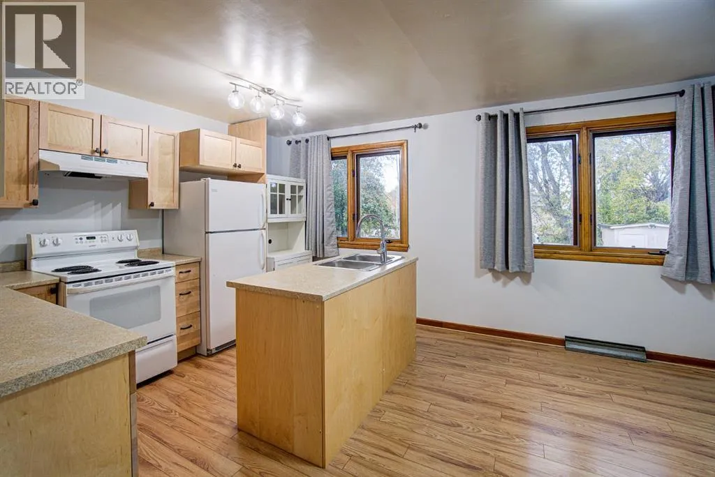 Welcome to your ideal bungalow! Just a few blocks from downtown, this charming home combines classic character with thoughtful updates. Step inside to a bright and spacious living room highlighted by a large east-facing picture window and stunning original hardwood floors that flow through much of the main level. The renovated kitchen offers plenty of function and style, featuring a center island with sink and an adjoining dining area perfect for family meals or entertaining. Two generously sized bedrooms and a 4-piece bathroom complete the main floor. Conveniently located off the back entrance, the laundry area boasts an abundance of cabinets, folding counters, and space for a stand-up freezer. Downstairs, youâll find a mostly finished basement with plenty of storage, workshop area, a cozy rec room, additional good-sized bedrooms, and an oversized 4-piece bathroom complete with a large tub. Outside, the backyard is full of potential with room for a garden, outdoor toys, or future projects. Side alley access and a single carport add to the functionality of this property. This is a wonderful opportunity to own a well-cared-for home with both charm and possibilities! (id:27476)