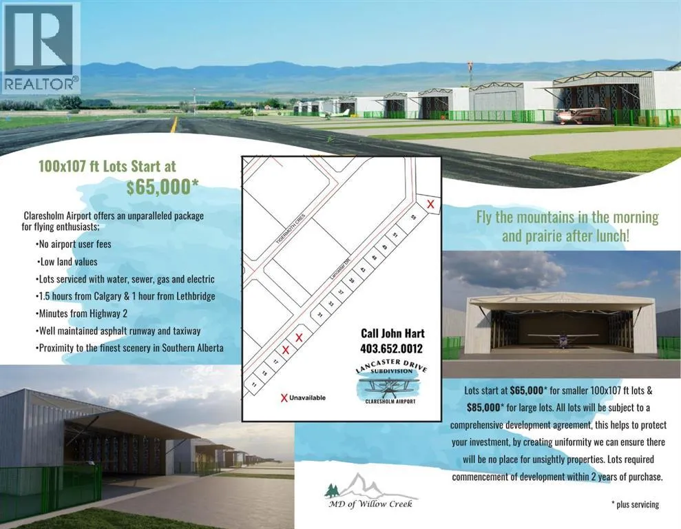 Now available at the recently upgraded Claresholm Airport, a registered southern Alberta Aerodrome with no user fees. 12 building lots beside the recently sealed taxiway along the main 3100 ft runway. The main runway was recently upgraded with an asphalt overlay and lighting which is also scheduled for upgrade in 2026 along with upgrades to follow in the future for the 3100 ft cross runway. The Municipality has made a firm and enthusiastic commitment to continually upgrade and maintain the Claresholm airport now and into the future!These .25 acre lots are priced very reasonably at $65,000 per lot and $85,000 for the one larger .46-acre lot. There is a two year time limit on building commencement as well as a restrictive covenant to protect collective development integrity regarding the size and design of a storage building which is to have provision for an aircraft door on the runway side of the lot. All services are at the lot line and responsibility for hookup is the buyers. If the commercial building is to be used as a hangar then access surface to the taxiway is also the buyer’s responsibility. Any living quarters must be built along the back of the building along Lancaster drive. The covenant is available on request from the listing realtor. There is GST required on the property. Right now, this is an excellent, early opportunity to get in on the ground floor of an exciting new development just off the highway 2 corridor 1 hour south of Calgary. Located just a few minutes outside the bustling town of Claresholm near the base of the Porcupine Hills, population 3,804. Better have a look as the lot options are wide open right now and yours for the choosing! (id:27476)