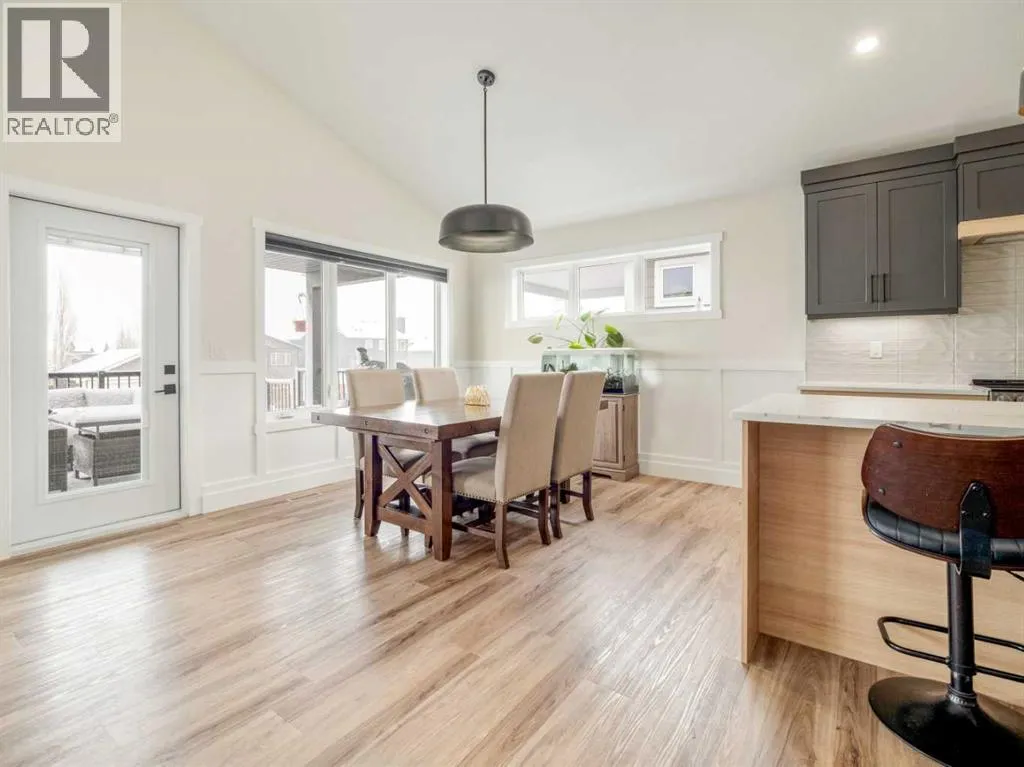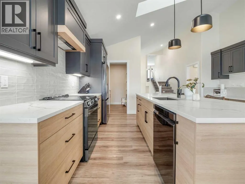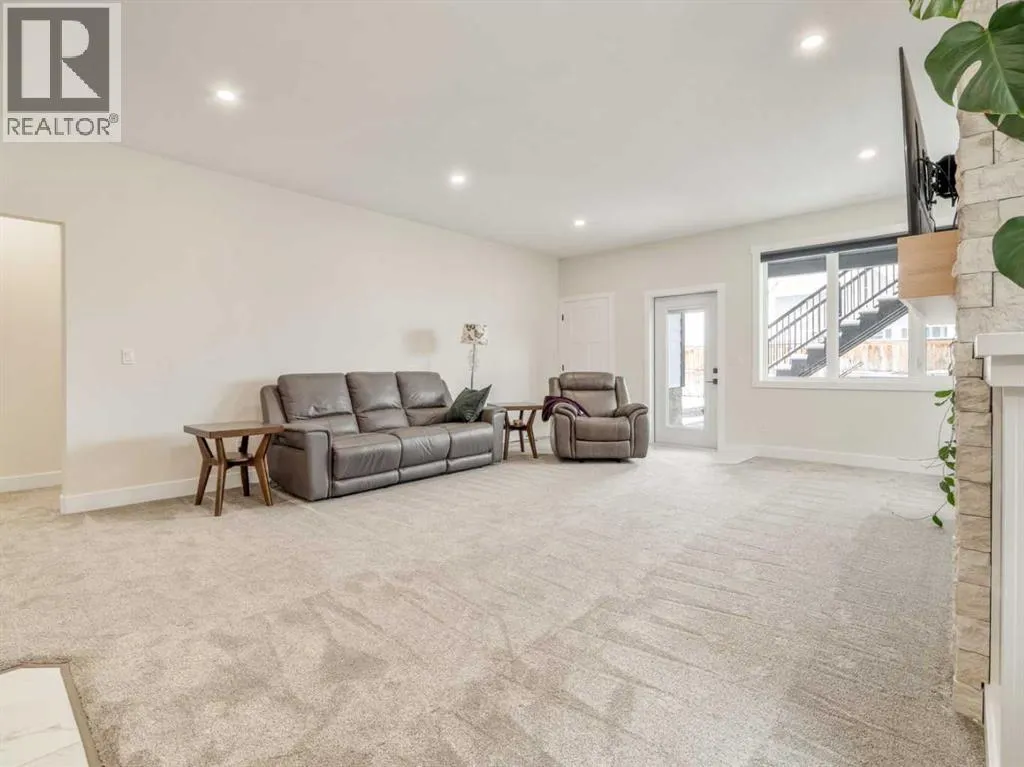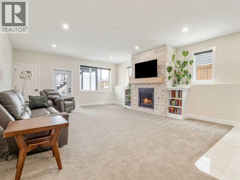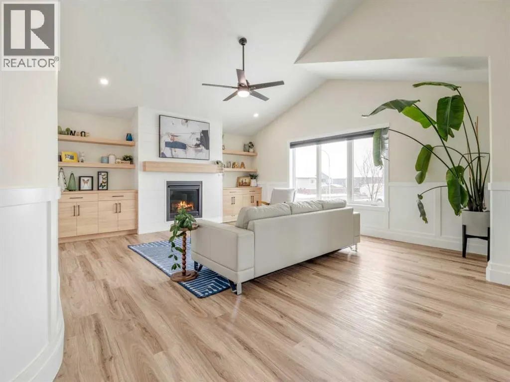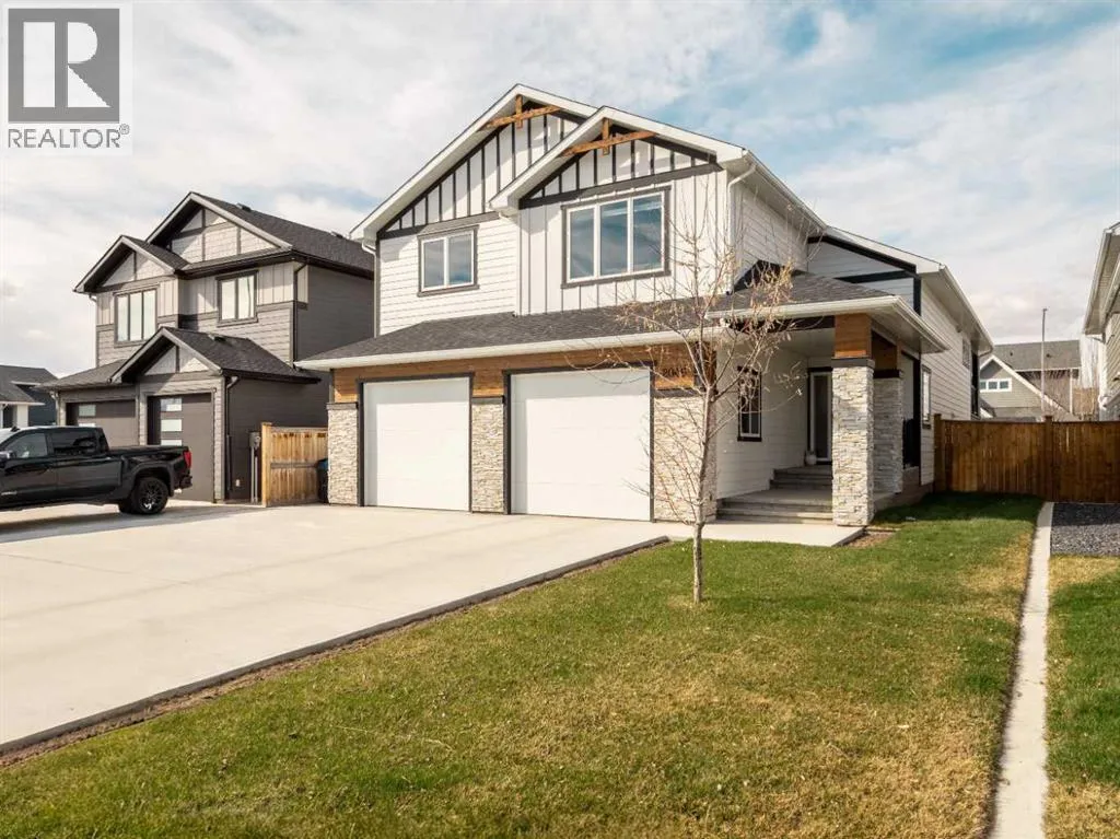 Incredible 2 year old large modified bi-level home in Cottonwood Estates originally built by Grizzly Ridge Developments! This 5 bed, 3.5 bath home has hardiplank exterior siding with stone accents, and a MASSIVE concrete front driveway that fits 6 vehicles! Heated garage is also a 26x29 and easily fits 2 more vehicles. Large welcoming entry. A half staircase to main floor showcases a large vaulted ceiling and vinyl plank flooring. Kitchen has upper grey upper cabinets, and lower lighter wood pattern. Kitchen has quartz counters, stainless steel appliances, and butler pantry with more cabinets and counterspace. Dining room is a good size and has large window and door to covered deck out back with gas line and water tap. Living room has custom built-in shelving and cabinets with gas fireplace and mantle centered on a feature wall with shiplap design. Main floor also has primary bedroom with ensuite that features double sinks, large tiled walk-in shower, separate toilet room, and walk-in closet with laundry machines. There is also another 2 piece bathroom on the main. Upper level above garage features a large bonus room with big hall closet, 2 big bedrooms, and a full bathroom with tub/shower combo. Walk-Out Basement with 9 foot ceilings is fully developed with wet bar featuring space for a full size fridge, family room with feature floor to ceiling stone wall surrounding the gas fireplace, and closet and door to covered patio out back. There are also 2 more large bedrooms each with their own walk-in closet, a full bathroom with tub/shower combo, and a laundry room(currently being used as a small office) with counter and cabinets. Yard is fenced and landscaped with a nice shed. Home has conveniences of central a/c and tankless hot water! This home is turn-key ready to move in and enjoy! (id:27476)