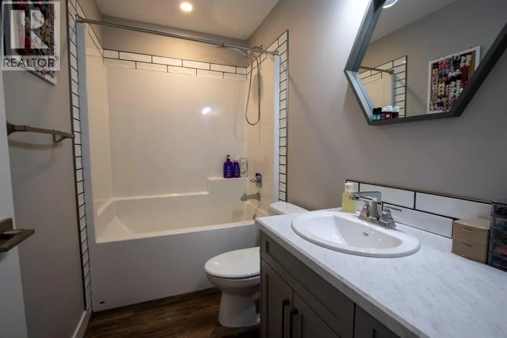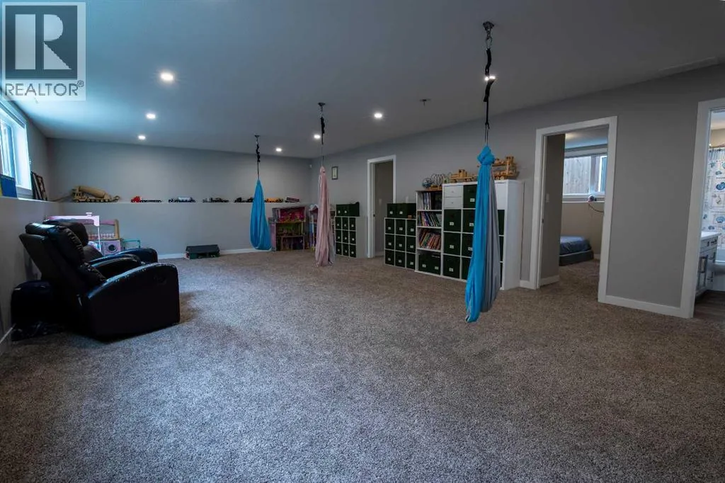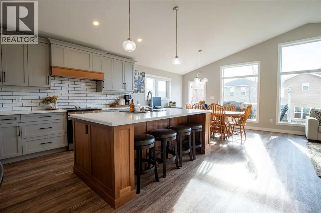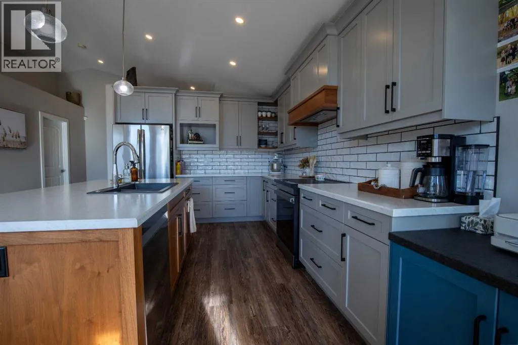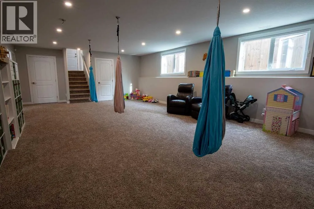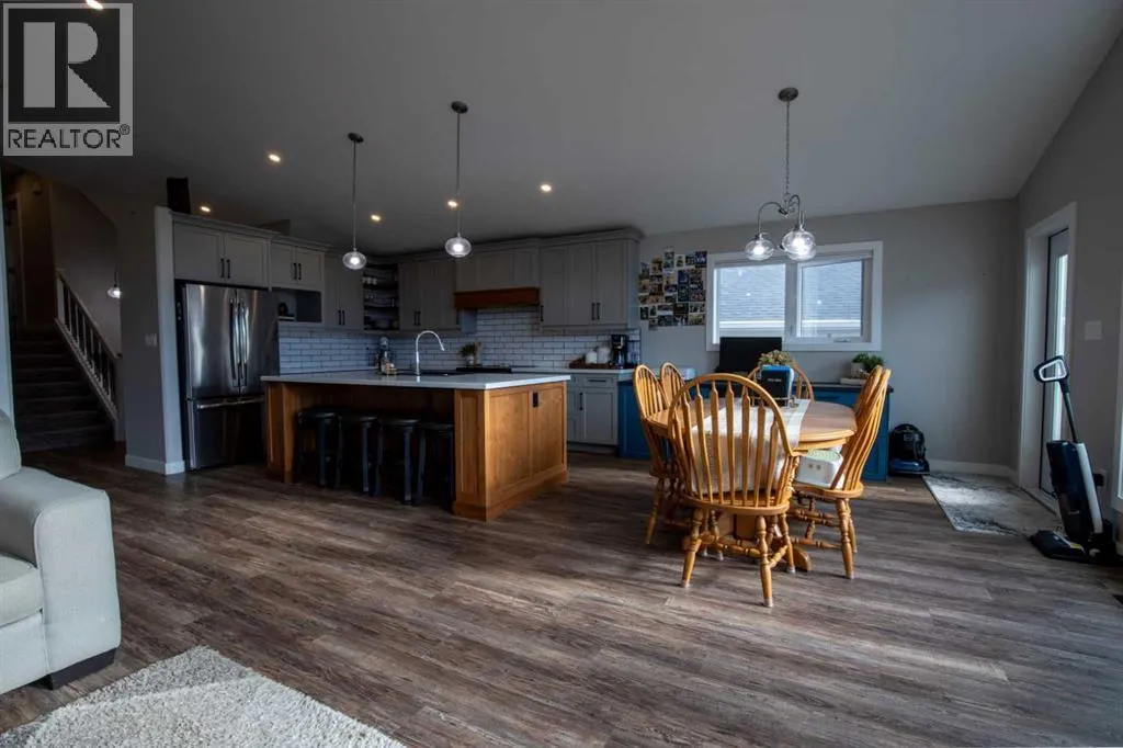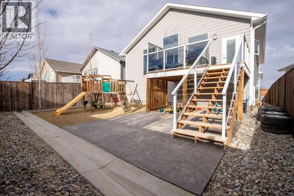 Take a look at this beautiful 2-storey Coalhurst home! This six-bed, four-bath home features a spacious interior with an inviting atmosphere and tasteful attention to detail. Step inside and you'll be greeted by a bright open-concept living room and kitchen. A central kitchen island provides plenty of space for meal prep and a breakfast bar for busy mornings. The nearby dining area is bright and welcoming with both pendant and recessed lighting above. The living room offers a restful space for hosting friends or relaxing solo, with a fireplace and view of the backyard through impressive windows along the rear wall of the home. Also on the main level, the primary suite features a luxurious five-piece ensuite bathroom and walk-in closet. Upstairs, a laundry room with counterspace and cupboard storage can be found alongside a full four-piece bath and two bedrooms, creating the perfect spot to set up a nursery or guest bedroom. On the lower level, a large rec room is surrounded by three more bedrooms, a storage room, and another full bathroom providing plenty of space for the whole family to spread out. Step outside onto the rear deck, and you'll see a play centre and concrete patio with low-maintenance landscaping and young trees throughout which will offer added privacy as they grow. If a beautifully-maintained home with a smart layout and plenty of room to grow into sounds like the place you've been waiting for, give your REALTOR® a call and book a showing today! (id:27476)