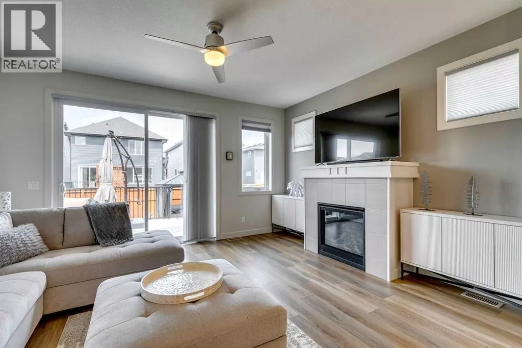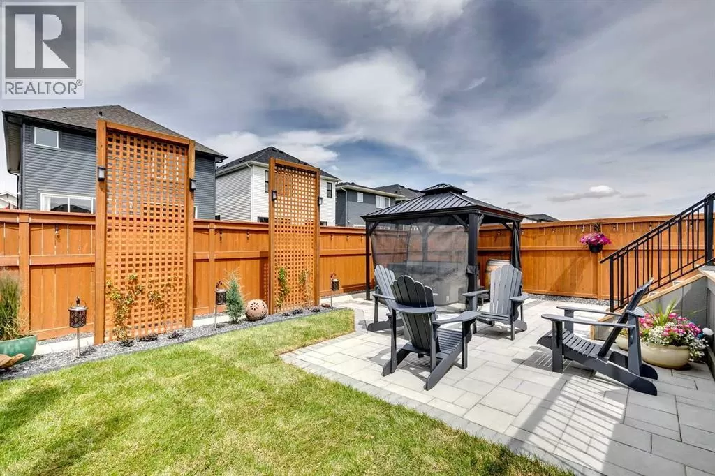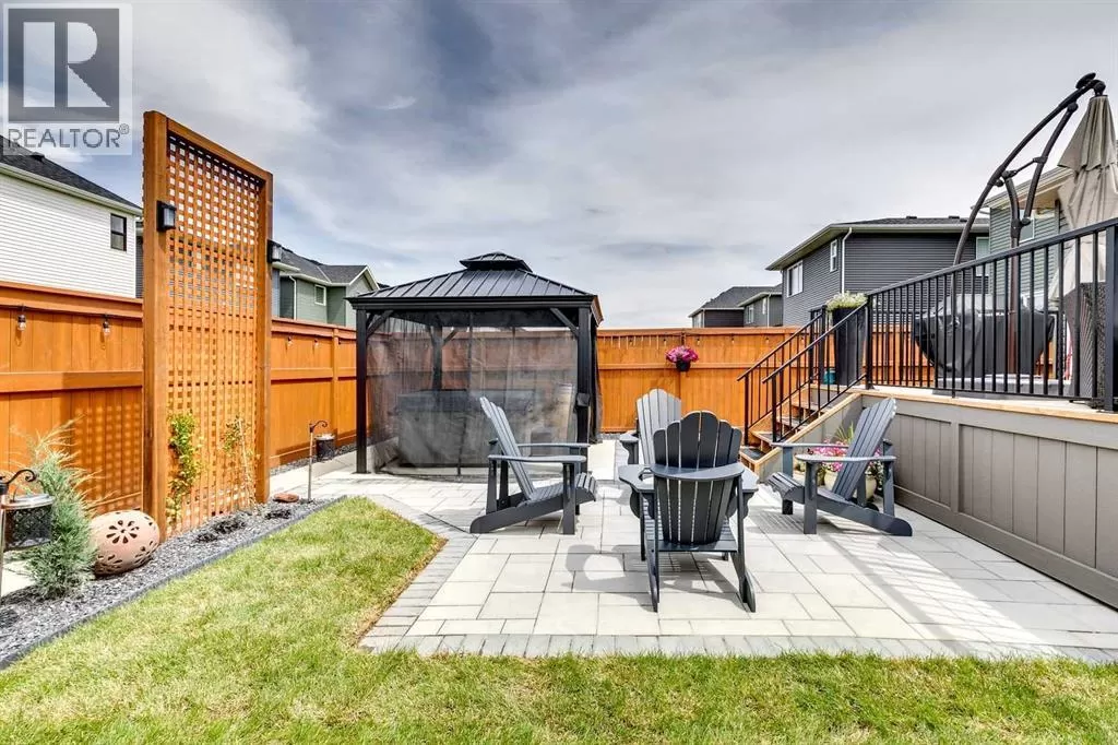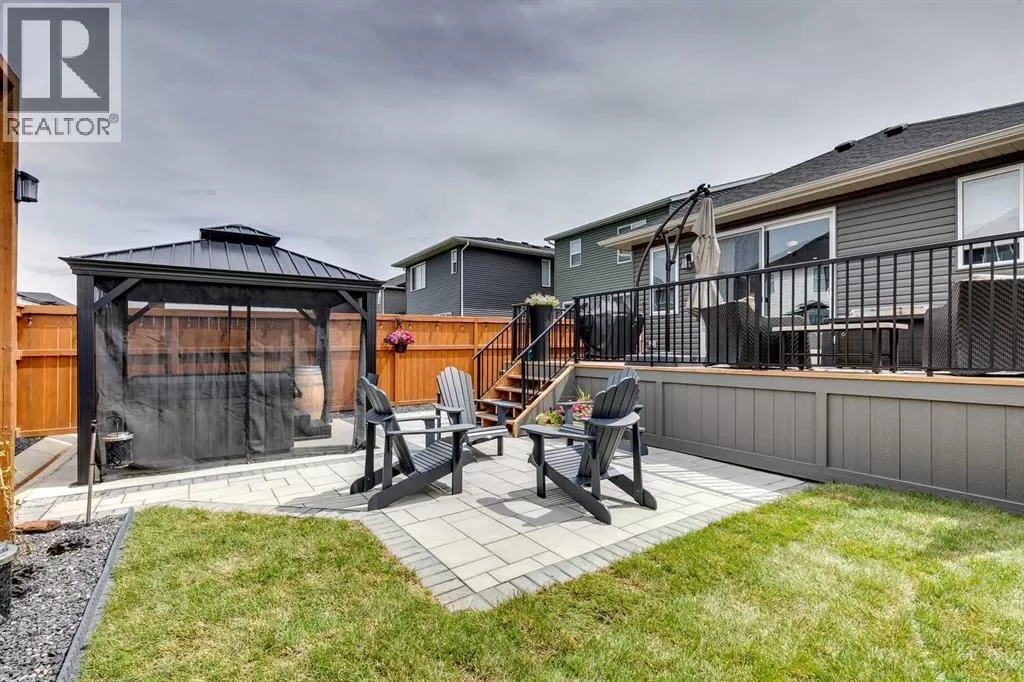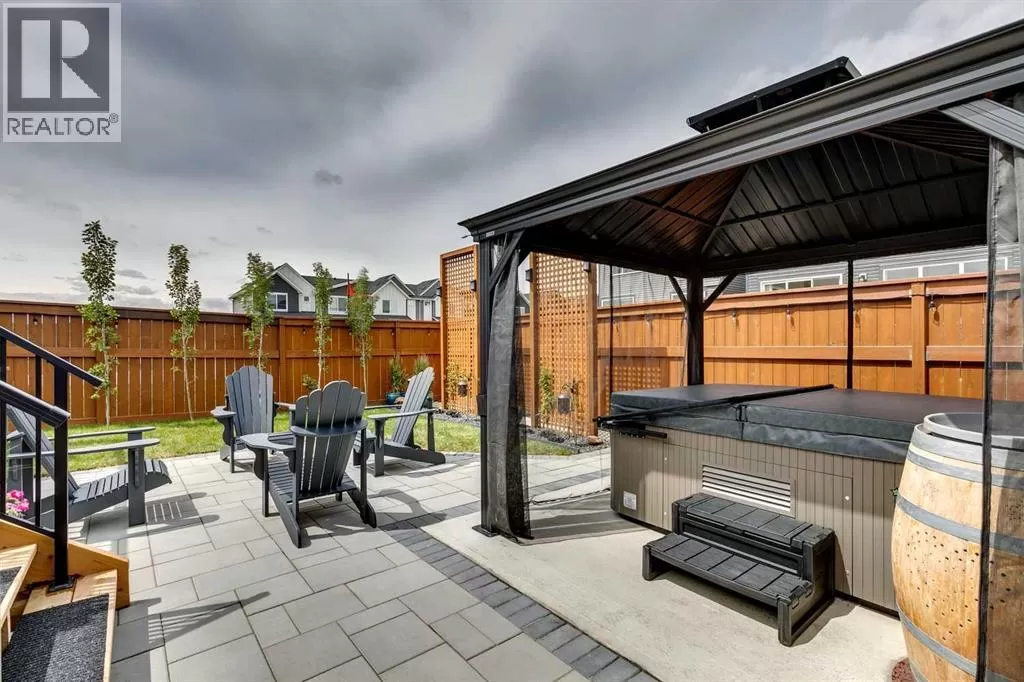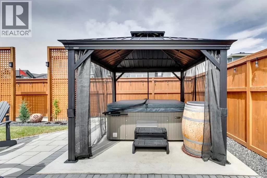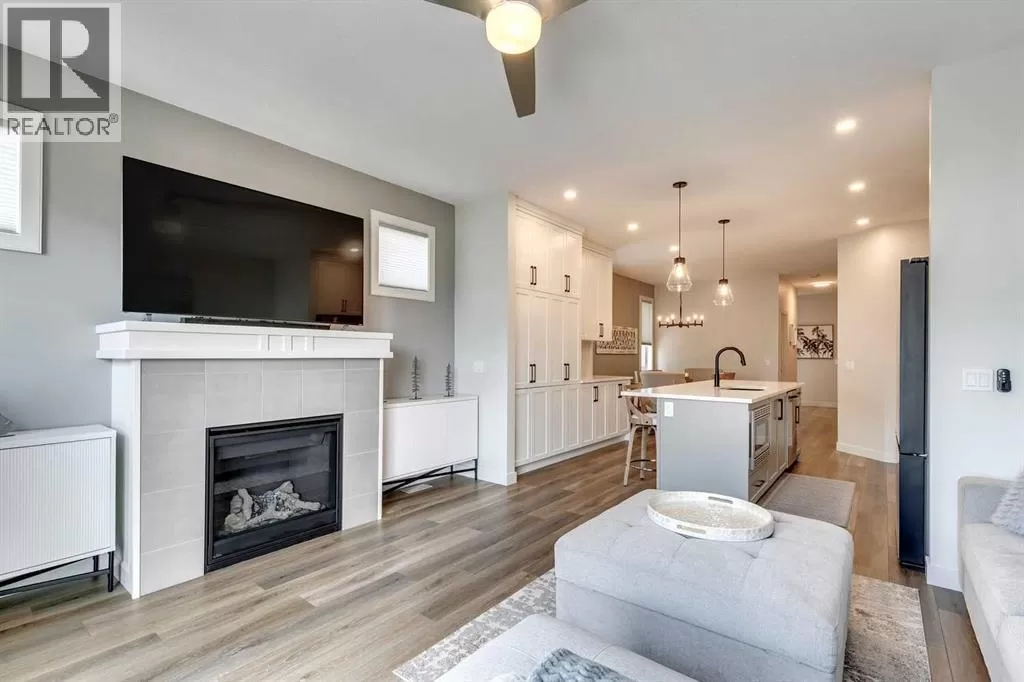 OPEN HOUSE August 30th 12-2pm!!! AN EXCEPTIONAL HOME with Over $65,000 in Upgrades... Like New and Move-in Ready!This impressive residence is truly extraordinary, showcasing over $65,000 in beautiful post-builder renovations and upgrades. The main floor boasts a gourmet kitchen featuring a striking TILE backsplash, elegant QUARTZ countertops, and floor-to-ceiling kitchen cabinets. Experience top-of-the-line Samsung Bespoke appliances including a gas range with convection and air fryer, and a refrigerator with self-filling water and double ice dispenser. The kitchen also shines with a new Anthracite double sink paired with a sleek Delta Trinsic faucet. The inviting living room centres around a Napoleon gas fireplace with fan, accented by a TILE surround and mantle.The spacious main floor master suite impresses with a luxurious ensuite featuring a double vanity with QUARTZ countertops, heated floors, soaking tub, standalone shower with tile surround, and a massive walk-in closet with convenient laundry access. Step outside to the newly landscaped, low-maintenance backyard oasis, packed with premium features including a fenced yard, gazebo, hot tub with warranty, stone patio, glass wind wall, deck skirting, privacy screening, and ambient lighting throughout; collectively valued at $50,000.The basement is perfect for teenagers or guests, offering two bedrooms and a stylish bathroom with TILE flooring and QUARTZ countertops.ADDITIONAL BONUSES include: a storage shed, custom Hunter Douglas window coverings throughout, Hunter Douglas ceiling fans in bedrooms and family room, upgraded sink and faucet, keyless entry, appliance upgrades, ceiling fans, a gas BBQ line, pull-out drawer garage and recycling bins, a full home inspection with all minor issues builder-rectified, and a 10-year Alberta new home warranty plus an extended builder warranty. This home is also located 1/2 block from a future off leash dog park and extensive walking paths. Central Park is also half a block away. This spectacular home truly looks and feels like a showhome...move in and enjoy! (id:27476)