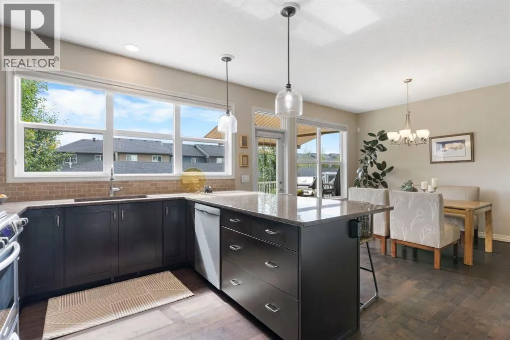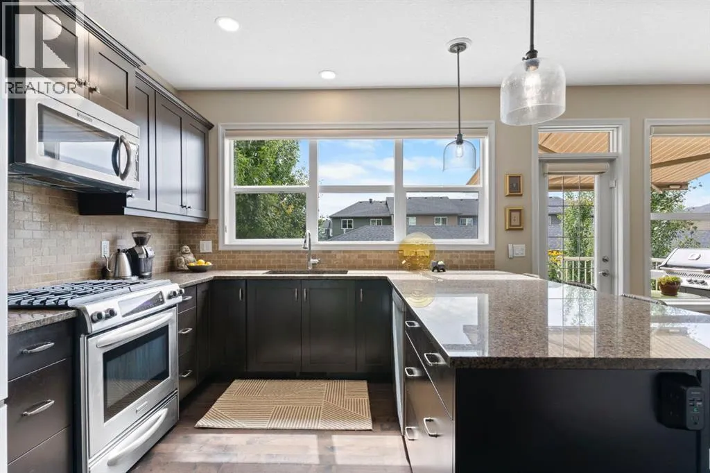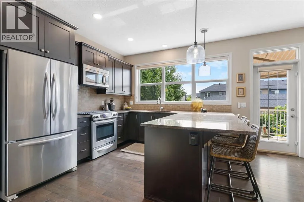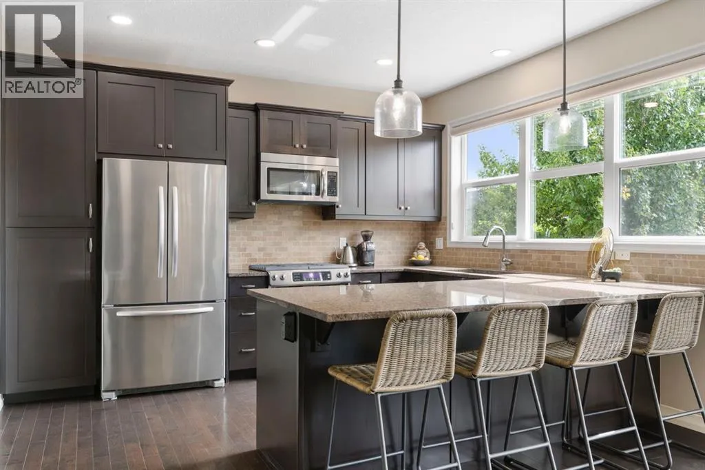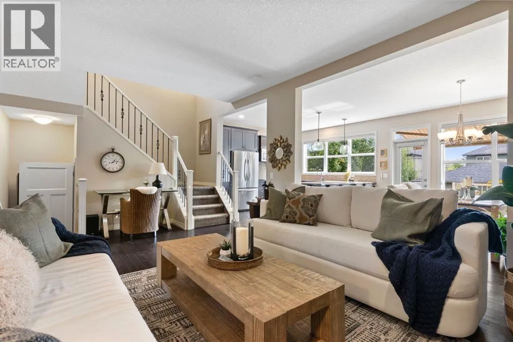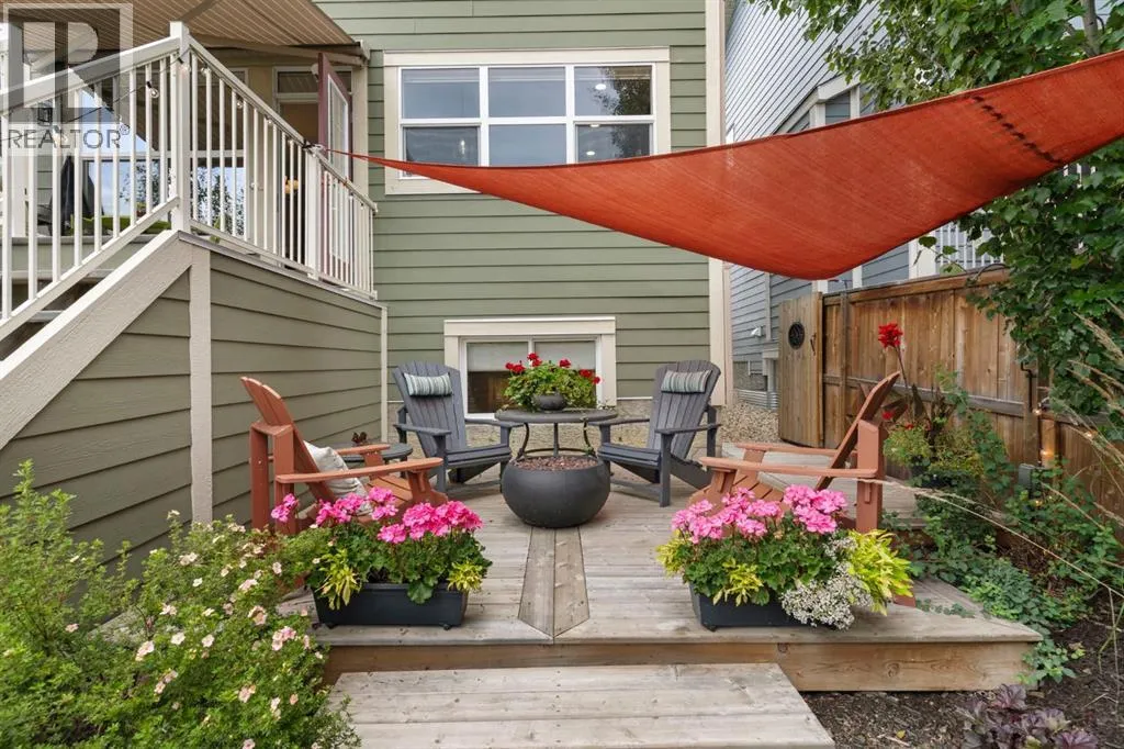 Welcome to 33 Sundown Grove â a beautifully upgraded and thoughtfully designed two-storey home with over 2475 sq ft of living and storage space in the highly sought-after community of Sunset Ridge in Cochrane, Alberta. Boasting stunning curb appeal, this turn-key home impresses from the moment you arrive with its charming architectural details and tasteful landscaping. Ideally located just steps from the neighbourhood's K-8 School, scenic pond, playgrounds, walking paths, and shopping amenities, this home offers the perfect blend of comfort, elegance, and convenience.As you step inside, you're greeted by a grand front foyer with soaring ceilings that make a striking first impression. Elegant in-stair lighting and a cozy fireplace in the main living area create a warm and welcoming atmosphere that instantly feels like home. The open-concept layout is beautifully illuminated by natural light streaming through oversized windows, enhancing the home's inviting charm. The gourmet kitchen and living areas overlook a gorgeous south-facing backyard oasis filled with lush greenery and breathtaking landscaping.The backyard features three private decks, a remote-controlled awning with automatic wind sensors, and integrated LED lighting â creating a magical evening ambiance. An additional 110 sq ft of outdoor storage is conveniently located under the enclosed deck, perfect for gardening tools or seasonal items.Upstairs, you'll find a spacious bonus room with new luxury vinyl plank flooring â ideal for use as a family room, home office, or media space. The primary bedroom is a true retreat, featuring a walk-in closet with built-in storage, motion-sensor lighting, and a spa-like 5-piece ensuite. Two additional bedrooms, a second full 3-piece bathroom, and a laundry room with built-in cabinetry complete the second floor.With 388 sq ft of living space, the professionally finished and permitted basement is thoughtfully configured for a future fourth bedroom. It also features a k itchenette, a third full 3-piece bathroom, a recreation room, an electric heated fireplace, and a dedicated 152 sq ft of storage with a utility sink. This opportune space is perfect for guests, extended family, or future rental potential.Additional features include a finished and heated double attached garage with new epoxy flooring, recessed lighting with motion sensors, and numerous thoughtful upgrades and high-end finishes throughout. This move-in-ready home is perfect for families, professionals, or anyone looking to enjoy a peaceful lifestyle in one of Cochraneâs most vibrant and scenic communities. Donât miss your opportunity to own this Sunset Ridge gem â schedule your private showing today! (id:27476)