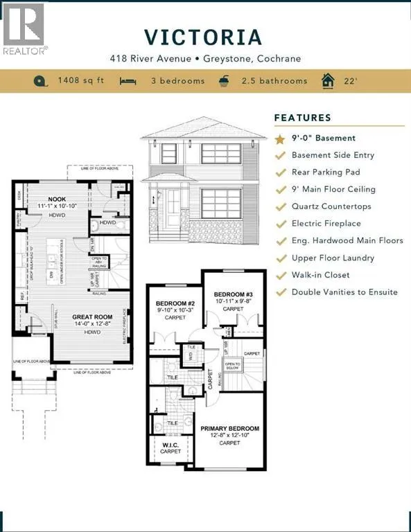 IMMEDIATE POSSESSION. BRAND NEW HOME by Douglas Homes, Master Builder in central Greystone, short walking distance to parks, the Bow River, major shopping & interconnected pathway system. Featuring the Victoria with separate side entry on an R-MX zoned home site for POTENTIAL future lower level suite. NOTE: a secondary suite would be subject to approval and permitting by the city/municipality. This gorgeous 3 bedroom, 2 & 1/2 half bath home offers over 1400 sq ft of living space. This home is located on River Avenue which provides immediate access to the interconnective pathway system, perfect for those looking for a outdoor lifestyle. Loads of Designer & upgraded features in this beautiful, open floor plan. The main floor greets you with 8' front door, soaring 9' ceilings, oversized windows, built-in niches & fireplace. Gleaming Hardwood floors flow through the kitchen, hall & nook adding a feeling of warmth & style. The Kitchen is completed with Quartz Countertops, two tone Kitchen Cabinets, 42" uppers with decorative enclosed bulkhead, plenty of drawers including Pots & Pan drawers, soft close doors & drawers, convenient tech space/desk & new stainless steel Kitchen appliance package. Upstairs you'll find a generous Primary Bedroom with Ensuite - Quartz Counters with separate, twin sink vanities, 5' shower with Designer tiled walls, private water closet all completed with ceramic tile flooring & large walk-in closet. The 2nd floor is completed by two good size additional bedrooms, main bath tub/shower combination with tiled walls, Quartz countertop, undermounted sink & ceramic tile flooring. You will love the convenience of 2nd Floor Laundry completed with ceramic floor tile. This is a very popular plan, great for young families, investors or the down sizers. Spacious, Beautiful and Elegant! The perfect place for your perfect home. Call today! Interior photos are from prior build & are reflective of fit, finish & included features. Note: Interior photos are f or illustration purposes only. Actual interior colors/finishes, & upgrades may be different than shown & the Seller is under no obligation to provide them as such.Come to the Show Home first located at 500 River Avenue. Showings only during Show Home hours & days. THIS HOME IS UNDER CONSTRUCTION (id:27476)