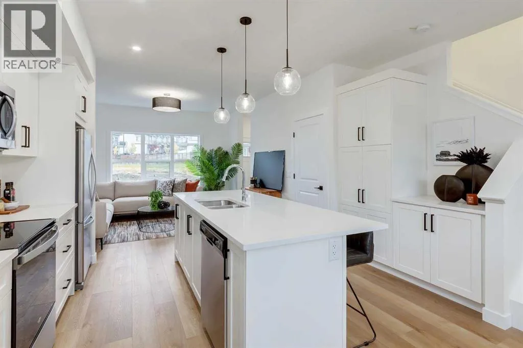 *VISIT THE RENOVA SHOWHOME 525 River Heights Drive TO TOUR THE DESIGN BY APPOINTMENT ONLY* Welcome to the newly built #1604, 525 River Heights Drive. This townhome features a west-facing backyard that offers the feel of a single-family yard while still providing the convenience of lawn maintenance and upkeep through condo living.Inside, the main floor is bright and open, with a modern layout designed for both style and function. The contemporary kitchen is equipped with quartz countertops, matte black hardware, Whirlpool stainless steel appliances, soft-close cabinetry, and a central island with seatingâideal for casual meals or entertaining. The kitchen flows seamlessly into the dining and living areas, where large windows and luxury flooring create a welcoming atmosphere. A powder room and a dedicated mudroom off the back entrance add practicality to everyday living.Upstairs, the primary bedroom includes a walk-in closet and a private three-piece ensuite with a walk in shower. Two additional bedrooms provide versatile space for children, guests, or a home office. A four-piece bathroom and a centrally located laundry area complete the upper floor with added convenience.The unfinished basement offers potential for future development, extra storage, or a layout tailored to your needs. Energy-efficient features such as triple-pane windows, a high-efficiency HVAC system, and an HRV unit support year-round comfort.Outdoors, you can relax on your private rear patio or enjoy a quiet morning on the covered front porch. Two parking stalls are included, and with landscaping and snow removal taken care of, this property is truly low maintenance.Situated in the well-established community of Riversong, you are close to schools, parks, walking paths, and the Spray Lake Sawmills Family Sports Centre. Quick access to Highway 22 makes both Calgary and the mountains easy to reach. With quality finishes, a thoughtful design, and a vibrant neighborhood, this home offers comf ort and convenience in equal measure.To experience this layout in person, visit the showhome at 525 River Heights Drive for a tour of the design. Please note that photos are taken from the showhome and may not reflect this property, as it is still under construction. (id:27476)
