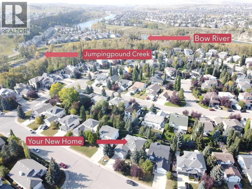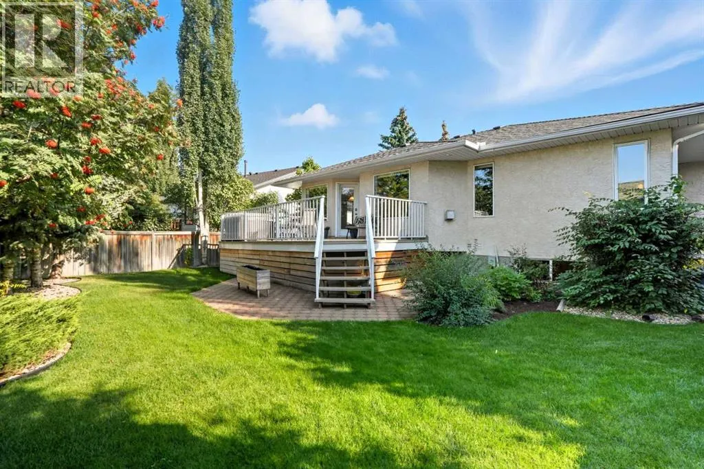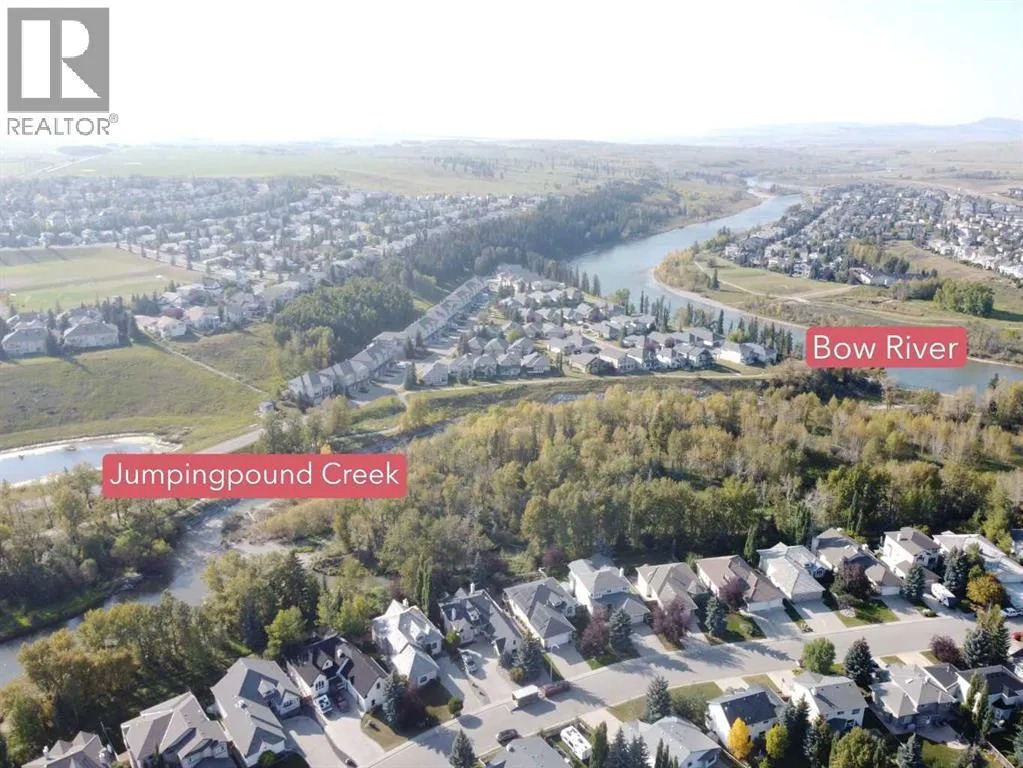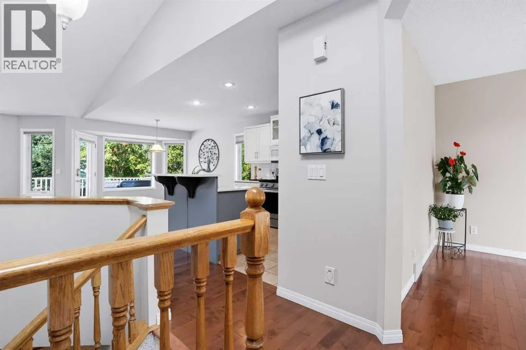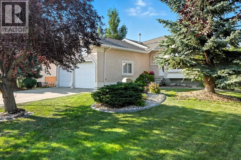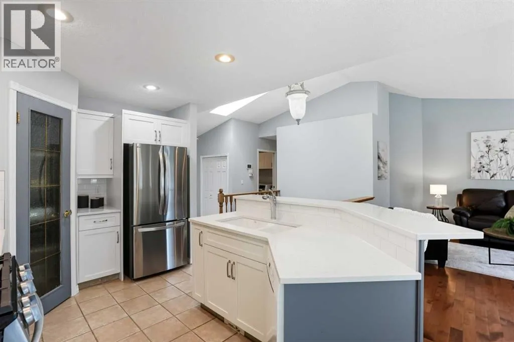OPEN HOUSE SATURDAY, Nov 8th, 10-Noon.This beautifully updated bungalow in Bow Meadows perfectly blends comfort, style, and a serene natural setting. Soaring lofted ceilings with a skylight fill the main level with sunlight, complementing the warm maple hardwood floors and open-concept design.The refreshed kitchen features elegant quartz countertops, a modern backsplash, stainless steel appliances, and a corner pantry. The flexible formal dining room can easily serve as a bright office or cozy sitting area.The spacious primary suite includes a renovated ensuite and walk-in closet. Downstairs, the fully developed lower level offers a large recreation room with a second fireplace, a guest bedroom, a 3-piece bath, and a generous flex space that could easily become a 4th bedroomâall while maintaining excellent storage.Step outside to your private backyard oasis with lush landscaping, underground irrigation, mature trees, a Duradeck patio with BBQ gas line, and a hot tub for year-round enjoyment. The oversized double garage impresses with epoxy floors, 10â ceilings, and a side-mount opener perfect for a car lift.Recent updates include:⢠Roof (approx. 5 years)⢠Hot water tank (2022)⢠Washer & dryer (2 years)Additional highlights: central vacuum, roughed-in water softener, two fireplaces, and peace of mind knowing this property is not located in the flood plain or flood fringe.Located just steps from the Bow River and Jumpingpound Creek pathways, downtown Cochrane, and local schools, this home offers privacy, sunlight, and lifestyle in one of Cochraneâs most sought-after communities. (id:27476)