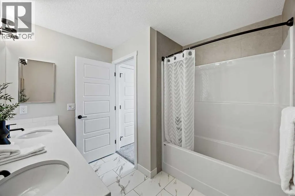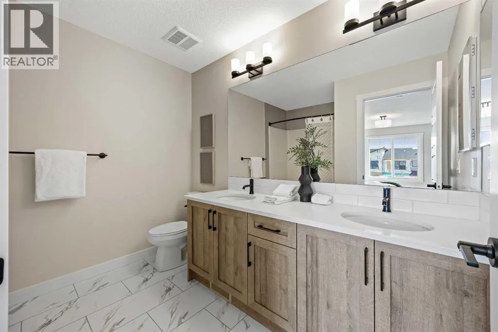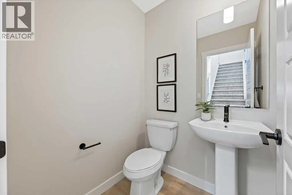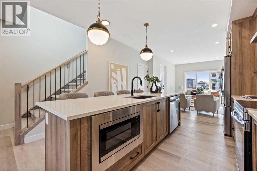 Welcome to 340 Fireside Drive, a newly built two-storey duplex in the family-friendly community of Fireside, Cochrane. This thoughtfully designed home blends style and function with bright open-concept living and modern finishes throughout. The main floor features 9â ceilings, Royal Design Sapphire luxury vinyl plank flooring, and a spacious kitchen with Elegant White quartz countertops, full-height shaker cabinets in Esteral, stainless steel appliances, a built-in microwave, a Blanco Silgranit Café sink, Boardwalk White matte backsplash, and a large island with seating and ample storage. At the front of the home, the living room is filled with natural light from large windows, creating a welcoming space that is ideal for both everyday living and entertaining. A half bath and stylish entryway complete this level.Upstairs offers three bedrooms, two full bathrooms and a convenient laundry space. The primary suite includes a walk-in closet and a private ensuite with a double vanity. Two additional bedrooms and a full bath provide space for family or guests, and a hallway linen closet adds extra storage.The basement includes rough-ins and plenty of open space. This home also features a side entry, 9â foundation, upgraded railing, a gas line to the kitchen range and a BBQ gas line outdoors.Exterior details include a Craftsman-inspired elevation with stone accents, a concrete front landing and a double parking pad out back. Fireside is a vibrant community with two schools, extensive parks and pathways, and local shops and services. It also offers quick access to the Rocky Mountains, downtown Cochrane and an easy commute into Calgary. Area size was calculated by applying the RMS to the blueprints provided by the builder. (id:27476)