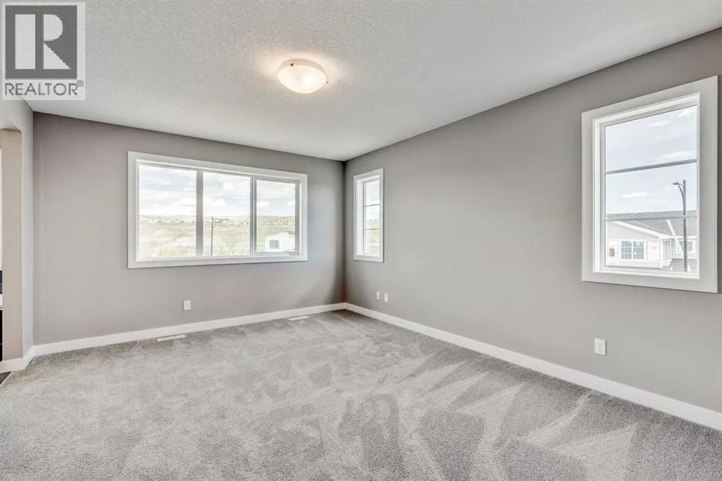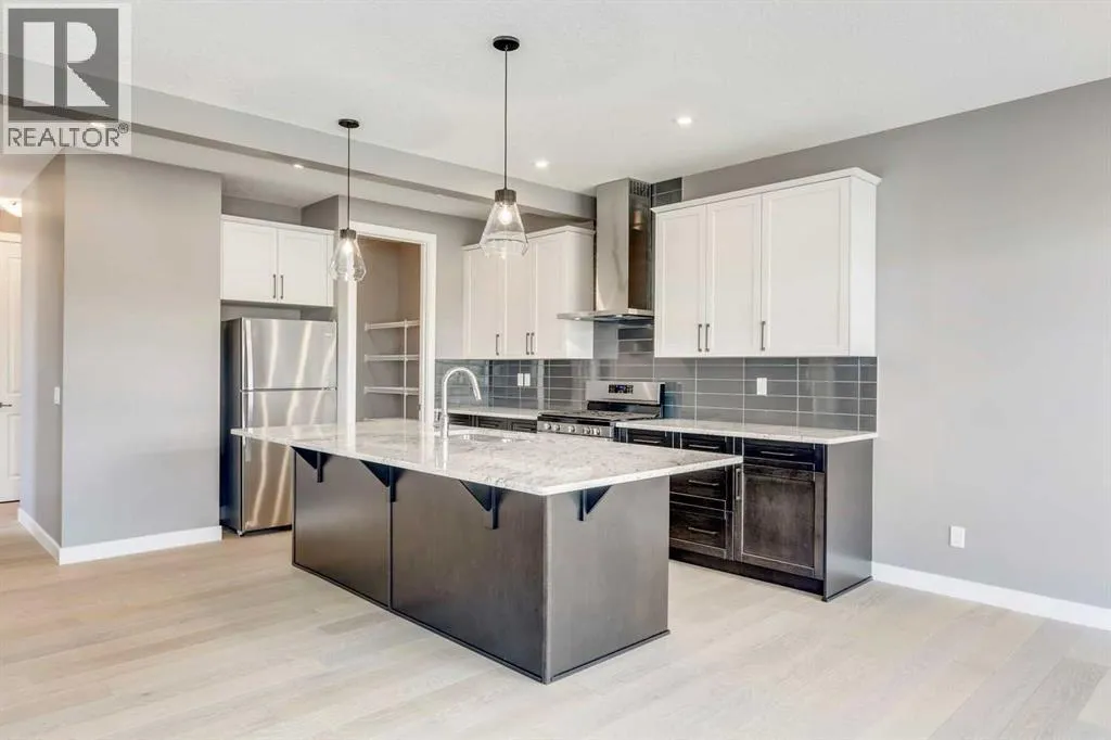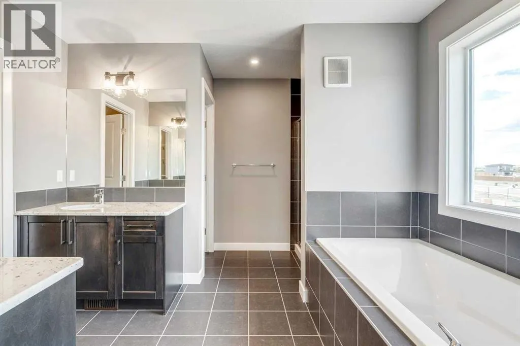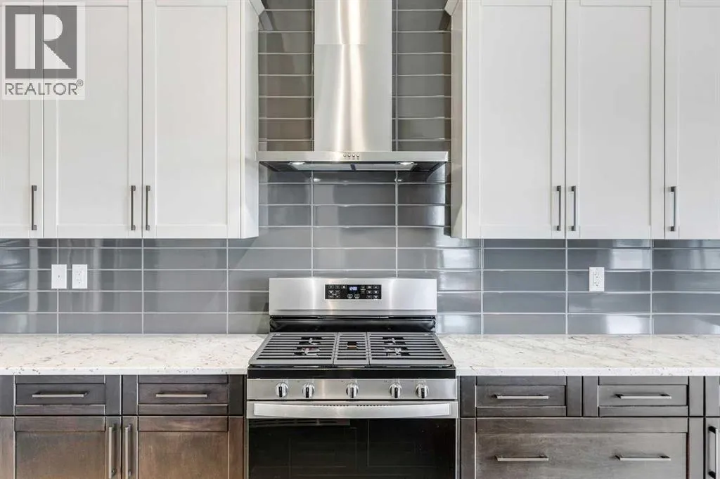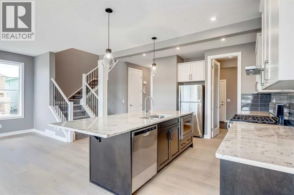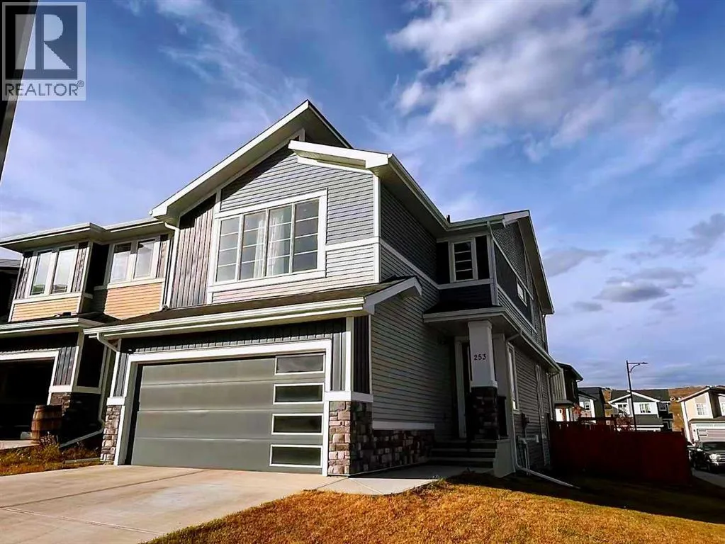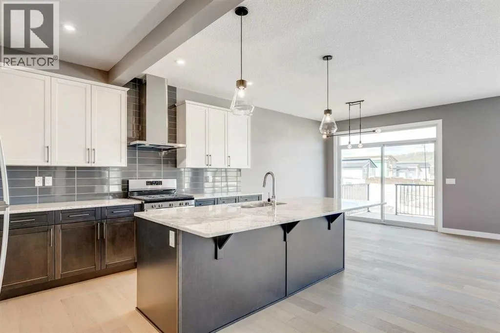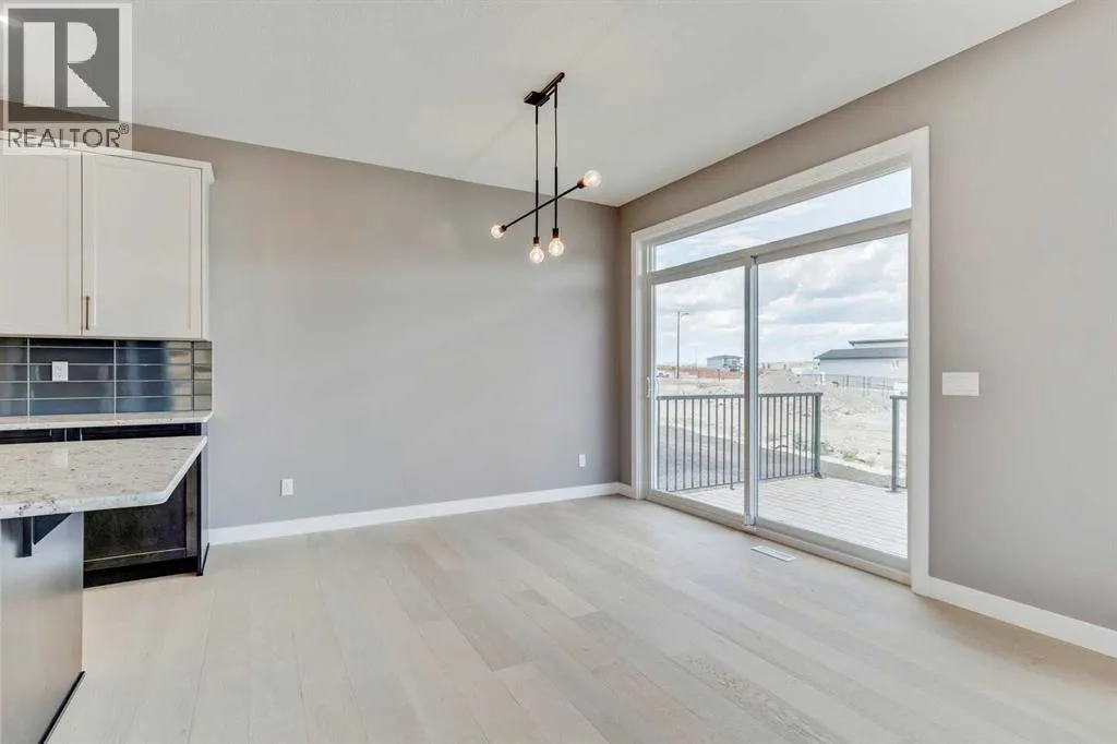 Please enjoy a virtual tour of this immaculate and beautifully designed home, ideally situated in one of Cochraneâs most convenient and sought-after neighbourhoods! Located on a large corner lot directly across from central Reindeer Park, this spacious 3-bedroom, 2.5-bath home offers over 2,000 sq ft of stylish and comfortable living spaceâperfect for larger or upscaling families. From the moment you step through the grand 8' front door, you'll be greeted by soaring 9' ceilings, oversized windows, and gleaming hardwood floors that flow throughout the foyer, hallway, great room, kitchen, and nookâcreating a warm and elegant atmosphere. The open floor plan enhances the sense of space and flow, ideal for both everyday living and entertaining. The stunning kitchen features dual-colour quartz countertops and cabinetry, a tiled walk-through pantry connecting to the mudroom, stainless steel appliances including a self-cleaning gas range, a built-in microwave, and a dishwasher. A spacious great room anchored by a sleek Napoleon Alluravision fireplace adds a cozy yet modern touch. Upstairs, the generous master bedroom includes a luxurious 5-piece ensuite with dual quartz vanities, undermounted sinks, a deep soaker tub beneath a bright window, and an oversized tiled shower. A large, separate walk-in closet provides ample space. The upper floor also boasts a forward-facing bonus room with a dramatic two-sided vaulted ceiling, two additional good-sized bedrooms with double-door closets, a main bath with quartz countertops, and a bright upper-floor laundry room with linen storage and tiled flooring. This home sits on a quiet street in a family-friendly area, less than 5 minutes from elementary, junior high, and high schools, and under 8 minutes to grocery stores, parks, coffee shops, and restaurants. With easy access to downtown Calgary (just 40 minutes away) and the Tuscany LRT station (only 25 minutes away), convenience is at your doorstep. Beautiful, elegant, and functionalât his home has it all. Book your private showing today! (id:27476)
