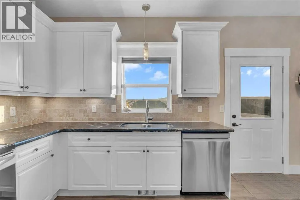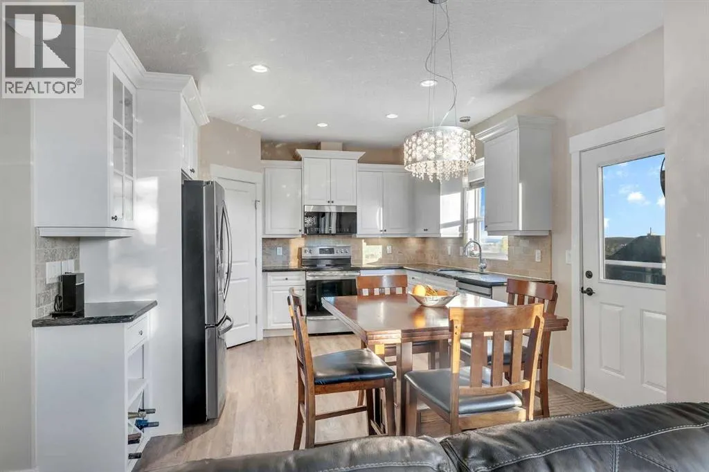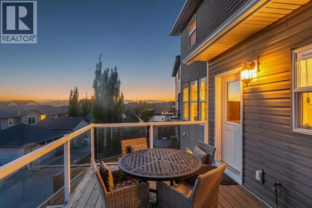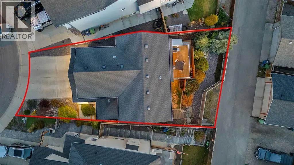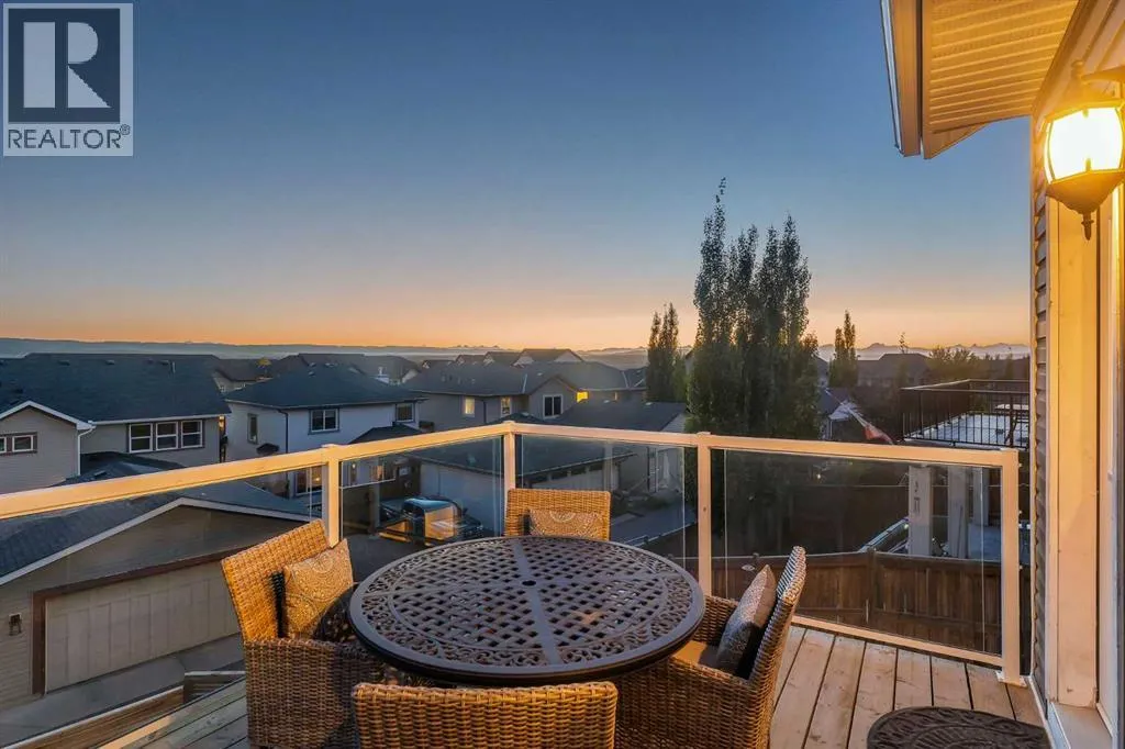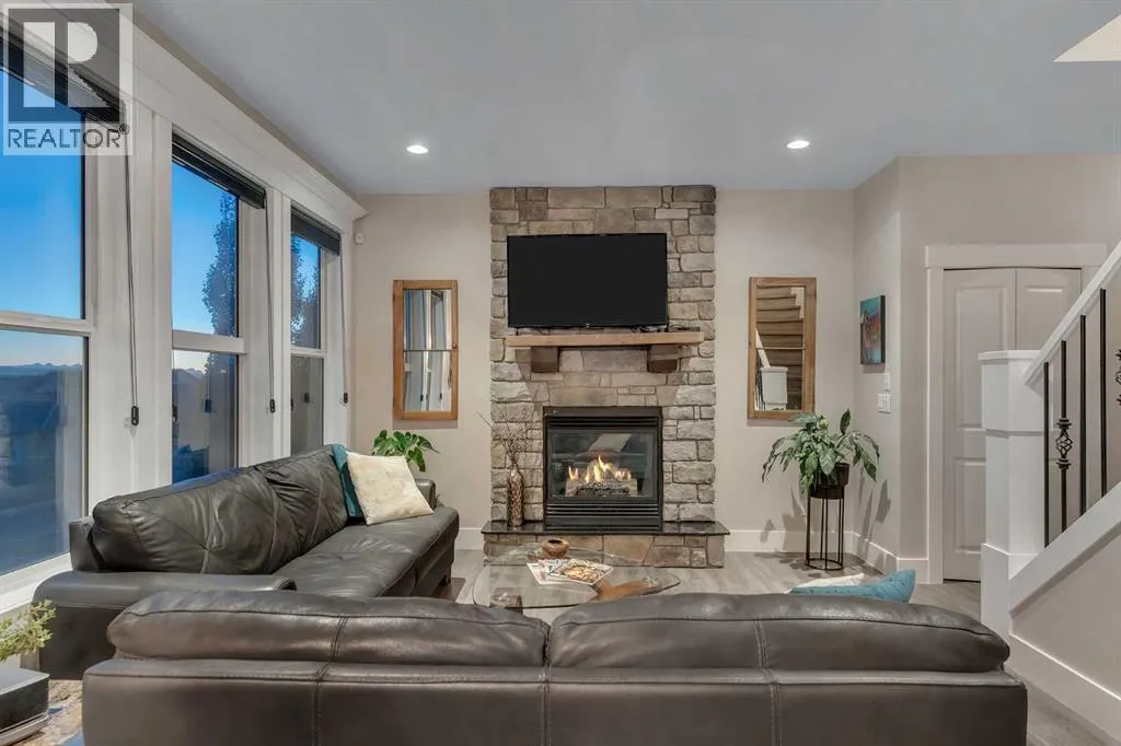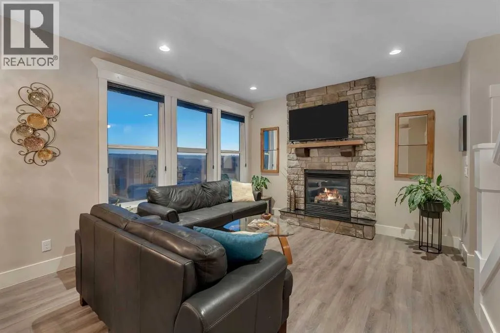 Perched on a quiet cul-de-sac, this home offers sweeping west-facing views over rolling hills and the snow-capped Rocky Mountains. From the moment you arrive, thereâs a sense of space, light, and comfort that makes this property stand out.Inside, the open-concept main floor is bright and welcoming. The living room features a striking floor-to-ceiling rock fireplace, creating a warm focal point for everyday living or entertaining. Large windows flood the space with natural light and frame stunning mountain and hill views. The dining area flows into a spacious kitchen with granite countertops, sleek stainless steel appliances, travertine tile, and plenty of cabinetry. A convenient powder room and access to the deck with glass railings allow you to take in the full, unobstructed view while enjoying privacy and outdoor living. Upstairs, the primary suite feels like a private retreat with vaulted ceilings, generous space for a king bed, and more west-facing views. A well-appointed ensuite and walk-in closet add comfort and convenience. Two great-sized additional bedrooms, a full bathroom, and a laundry room complete the upper level, making it an excellent layout for families or guests. The fully finished walk-out basement provides flexibility, featuring a large rec room, full bathroom, and potential for a separate living area with its own access and a parking area off the back lane. This space can be used for guests, hobbies, a home office, or additional living quarters. Throughout the home, thoughtful upgrades stand out, such as new vinyl flooring, fresh paint, tall baseboards, crown moulding around door frames, and abundant windows that keep every room light and bright. Outside, the walk-out level opens to a landscaped yard with extensive rockwork and level green space. A hot tub sits just steps away, and below is a lower garden area with mature shrubs where you can gaze up and admire your surroundings. Located in Heritage Hills, near a newly proposed grocery store an d close to local schools, this property combines privacy and convenience with quick access to Highway 1A for easy mountain getaways. This is where comfort meets breathtaking views, creating the perfect place to call home. Experience the beauty and calm of Heritage Hills living. (id:27476)