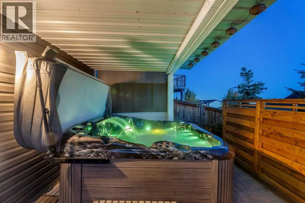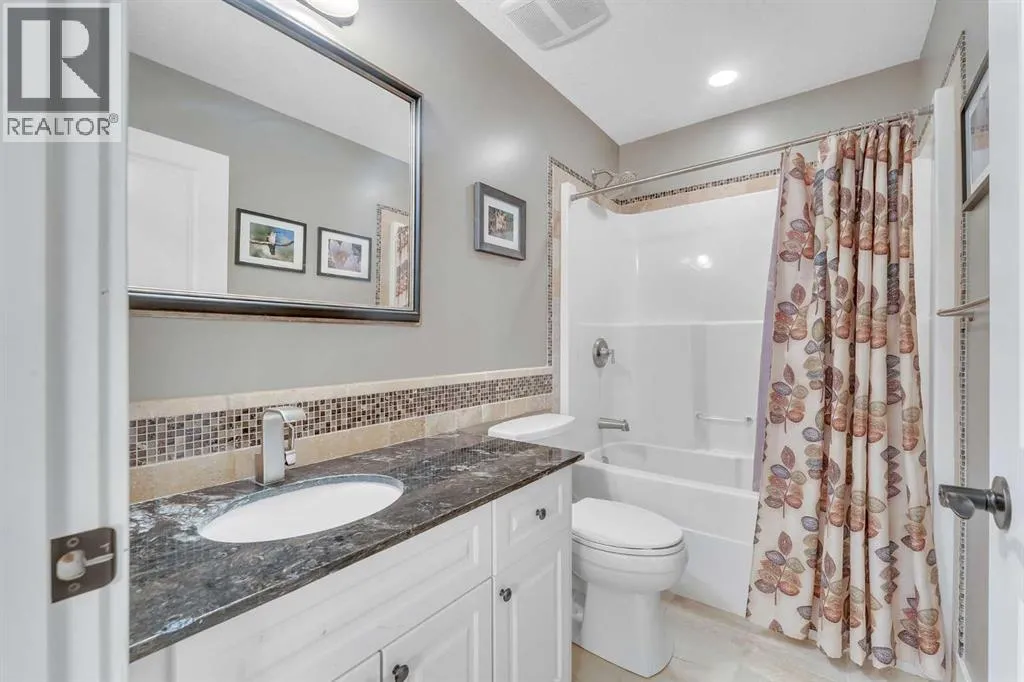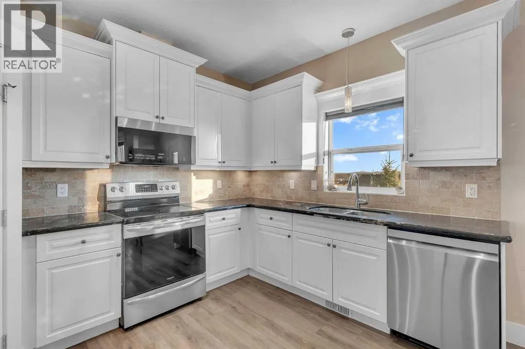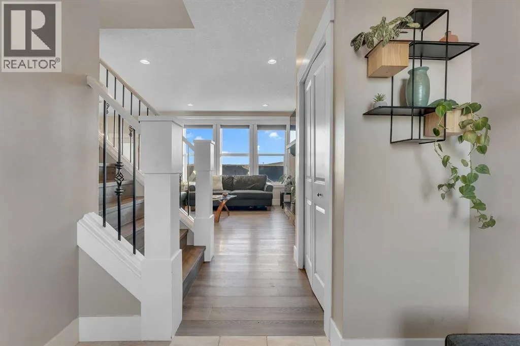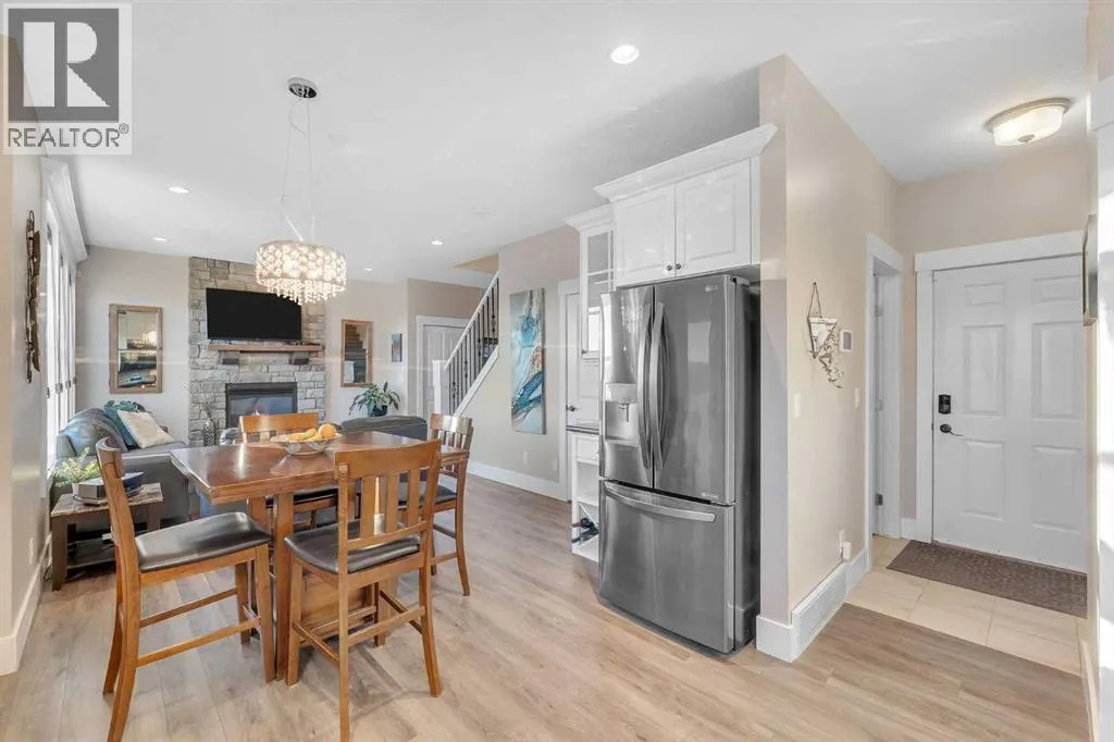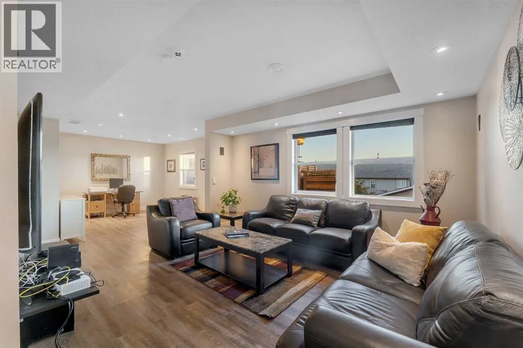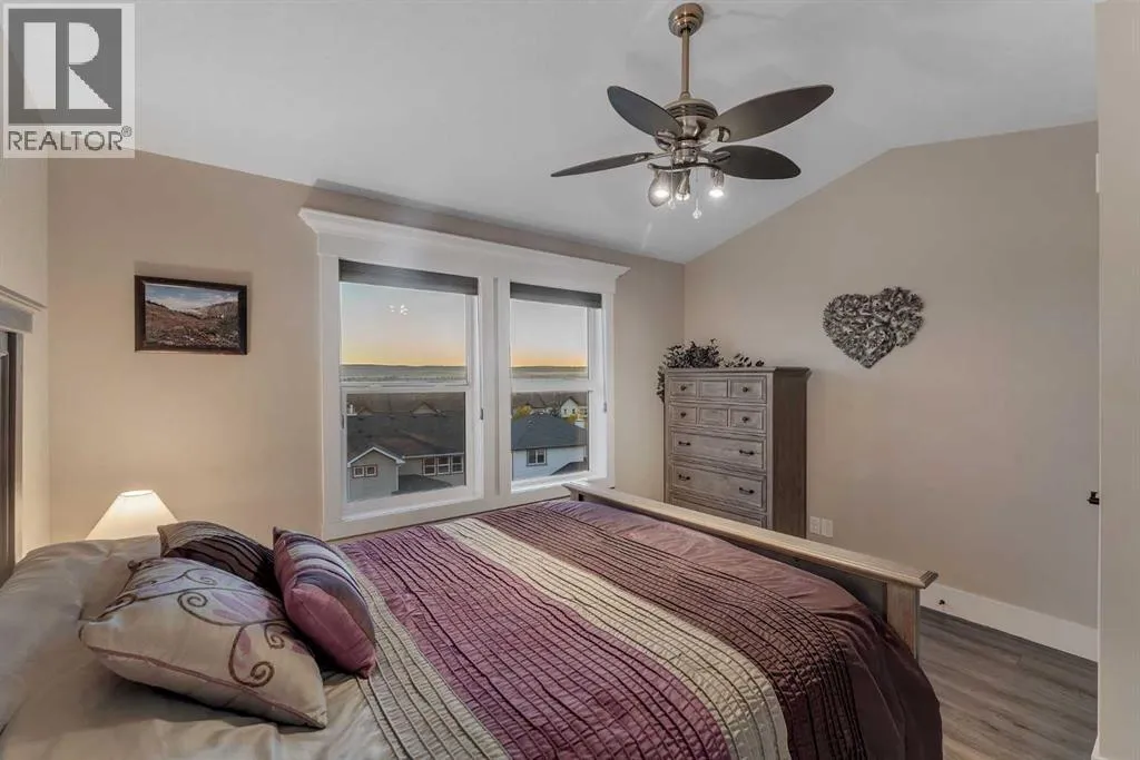 Perched on a quiet cul-de-sac, this home offers sweeping west-facing views over rolling hills and the snow-capped Rocky Mountains. From the moment you arrive, thereâs a sense of space, light, and comfort that makes this property stand out.Inside, the open-concept main floor is bright and welcoming. The living room features a striking floor-to-ceiling rock fireplace, creating a warm focal point for everyday living or entertaining. Large windows flood the space with natural light and frame stunning mountain and hill views. The dining area flows into a spacious kitchen with granite countertops, sleek stainless steel appliances, travertine tile, and plenty of cabinetry. A convenient powder room and access to the deck with glass railings allow you to take in the full, unobstructed view while enjoying privacy and outdoor living. Upstairs, the primary suite feels like a private retreat with vaulted ceilings, generous space for a king bed, and more west-facing views. A well-appointed ensuite and walk-in closet add comfort and convenience. Two great-sized additional bedrooms, a full bathroom, and a laundry room complete the upper level, making it an excellent layout for families or guests. The fully finished walk-out basement provides flexibility, featuring a large rec room, full bathroom, and potential for a separate living area with its own access and a parking area off the back lane. This space can be used for guests, hobbies, a home office, or additional living quarters. Throughout the home, thoughtful upgrades stand out, such as new vinyl flooring, fresh paint, tall baseboards, crown moulding around door frames, and abundant windows that keep every room light and bright. Outside, the walk-out level opens to a landscaped yard with extensive rockwork and level green space. A hot tub sits just steps away, and below is a lower garden area with mature shrubs where you can gaze up and admire your surroundings. Located in Heritage Hills, near a newly proposed grocery store an d close to local schools, this property combines privacy and convenience with quick access to Highway 1A for easy mountain getaways. This is where comfort meets breathtaking views, creating the perfect place to call home. Experience the beauty and calm of Heritage Hills living. (id:27476)