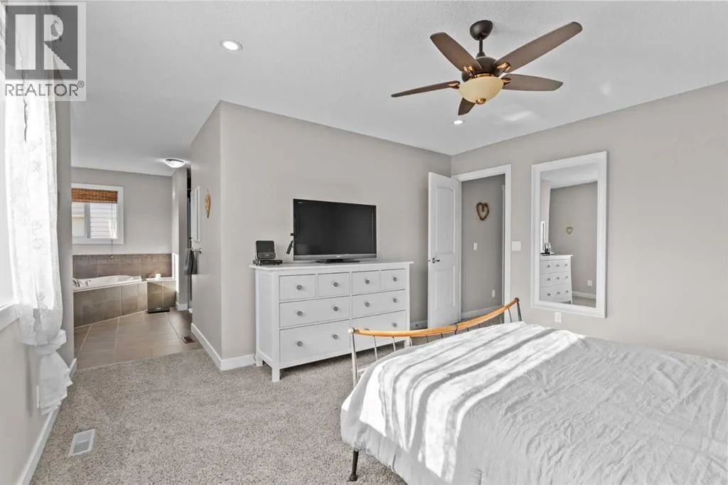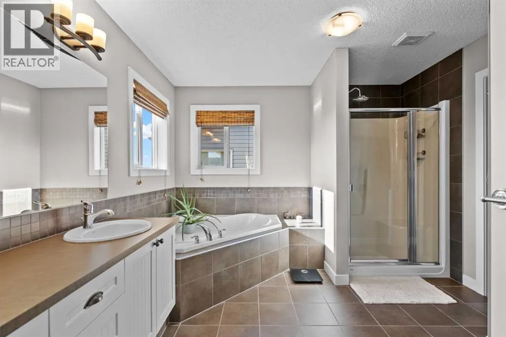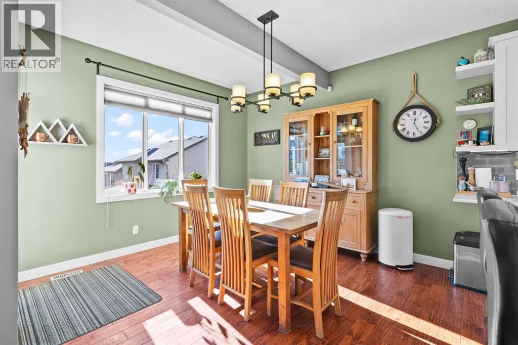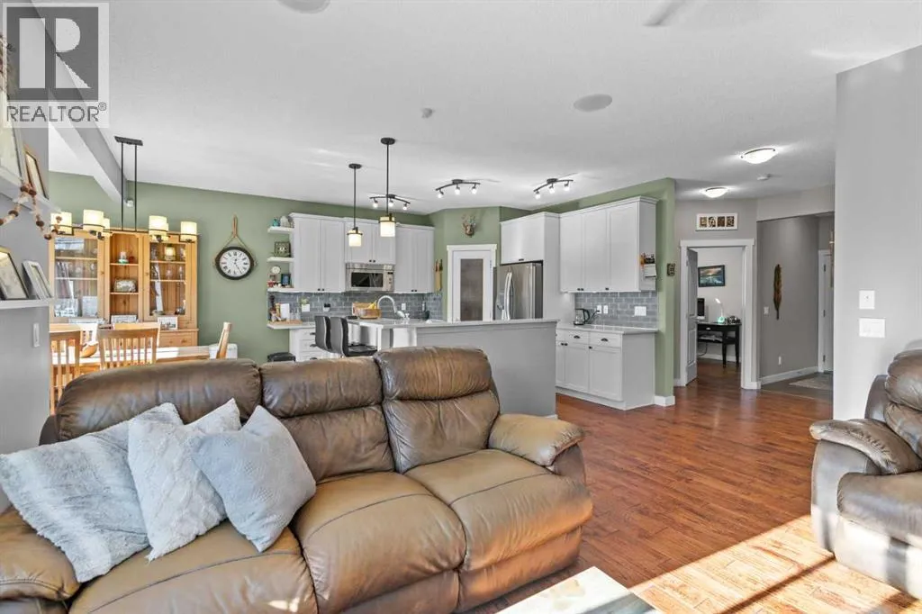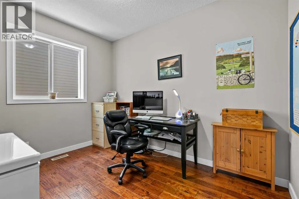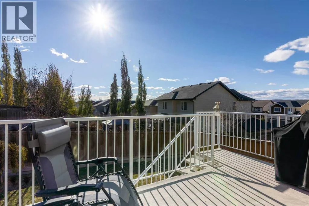 Located in Heritage Hills on Cochraneâs west side, this gorgeous two-story home is beautifully decorated and has an amazing family vibe with a touch of elegance. Walking in, whether you come in through the garage or front door, you will be welcomed home by lots of room to kick off your shoes on the easy to maintain ceramic tile entryways. Both entries also include ample closet space for all your outerwear. The main floor is open concept, with scraped hardwood floors throughout, and a super functional kitchen with quartz countertops with a big center island. The kitchen is truly the heart of this home, with a raised bar for hosting your guests, tons of cupboards for storage and counter space for whipping up some snacks and a huge pantry. The dining nook is bright and open with large sunny south facing windows, and the great room includes a cozy gas fireplace which makes it the perfect place to relax. There is also easy access to the deck and backyard, for hosting in the beautiful outdoors. The main floor also includes a dedicated office and a half bath on the main floor and access to the double attached garage.Upstairs, the sunny south facing master retreat will impress with mountain views. The ensuite has everything you need, with double basins, a big soaker tub, water closet, separate shower and walk in closet. Two more good sized bedrooms on this floor share a convenient Jack-and-Jill bathroom. The upstairs also has an amazing laundry room, appointed with a dedicated laundry sink and storage cupboards. Finally, this floor includes a spacious north facing bonus room with its own built in study station. This space would make an excellent library or TV watching space, for those who need a little break away from the main floor action.Downstairs is fully developed and includes a large rec room, a 3 piece bathroom, large bedroom with at grade egress windows. A great space for the family to grow! There is a large storage room with shelving to help keep you organi zed and a utility room.After enjoying all this home has to offer, step out to the beautiful south facing back deck and fully fenced landscaped backyard. Check out the unique deck storage solution for keeping all the outdoor toys. The houses are offset around you, giving you the feeling of space; perfect for enjoying those sunny Cochrane days. Come and see all that Cochrane and this beautiful home has to offer. (id:27476)