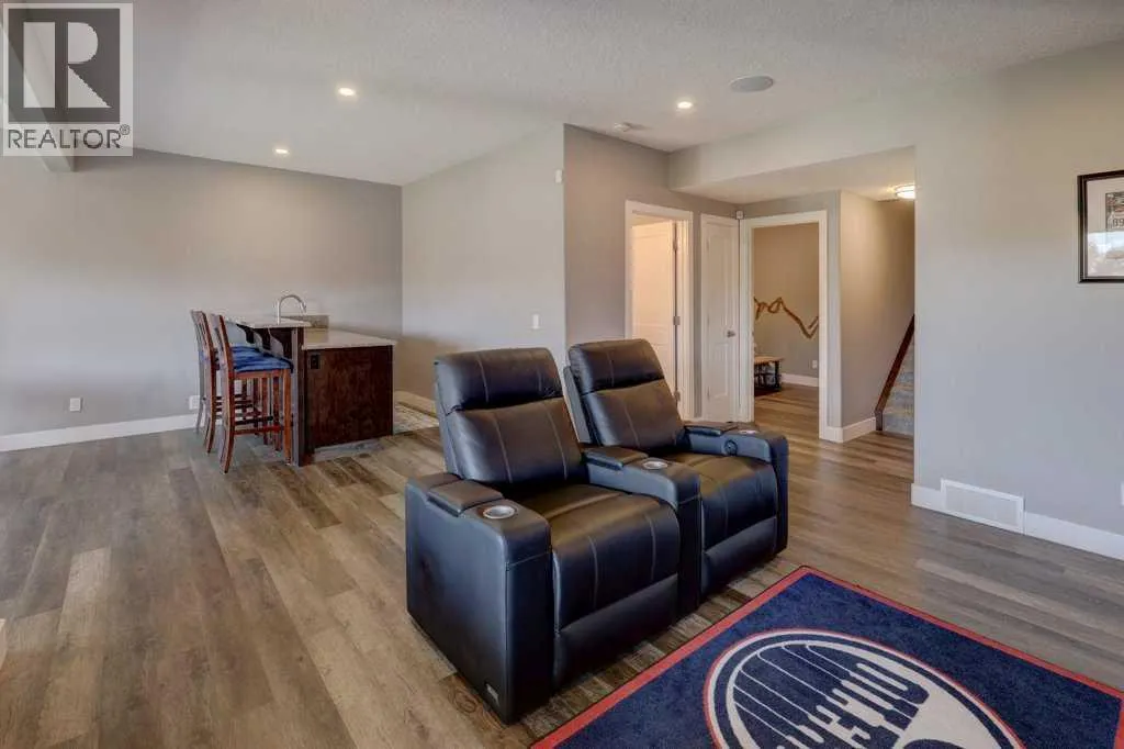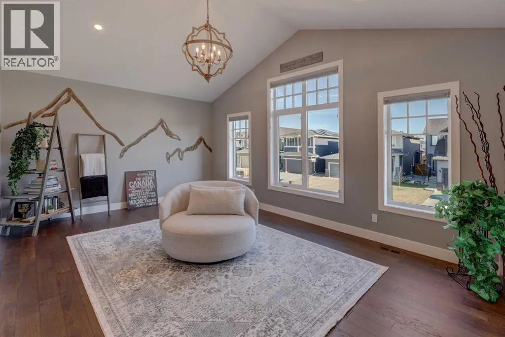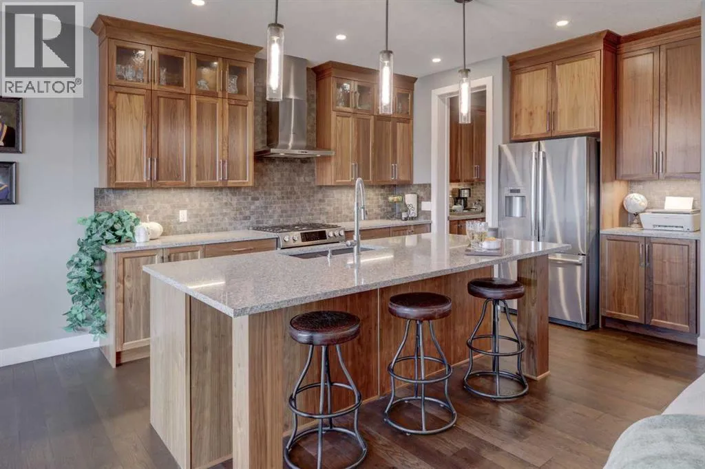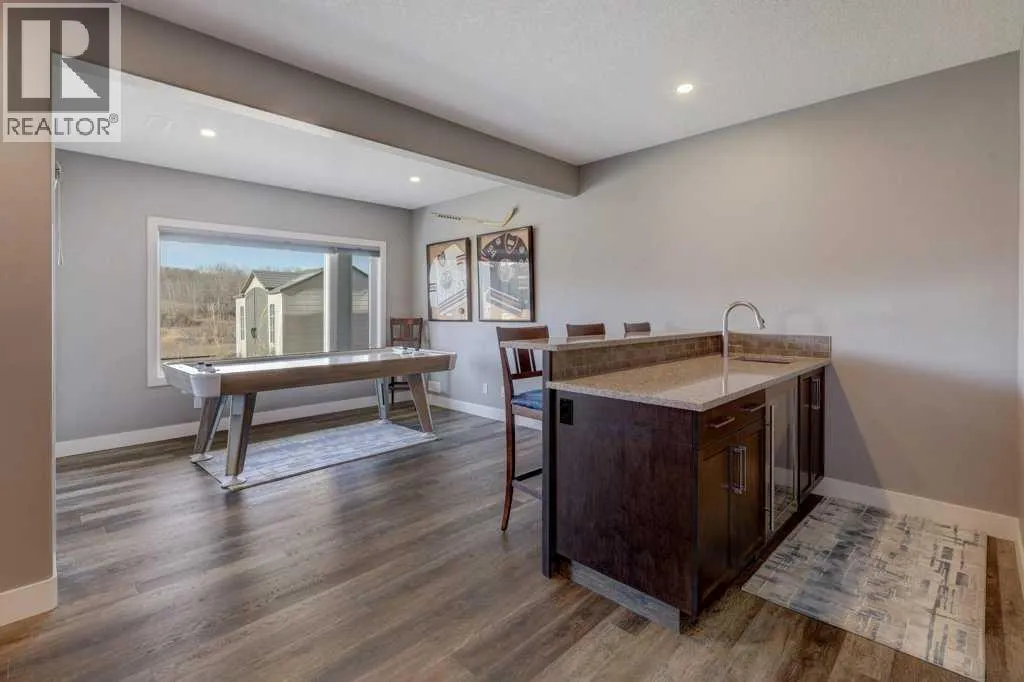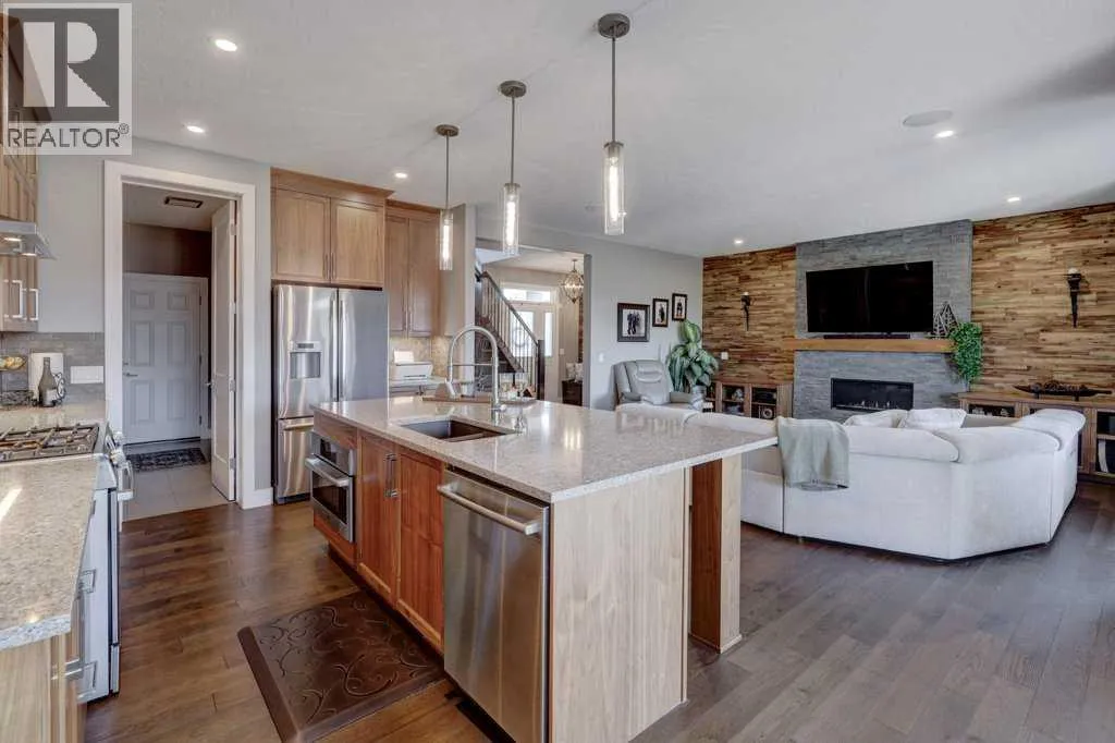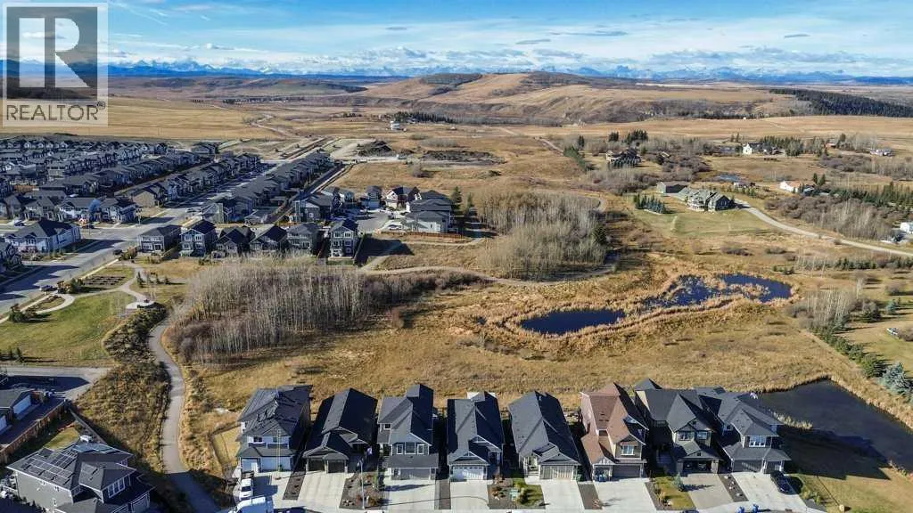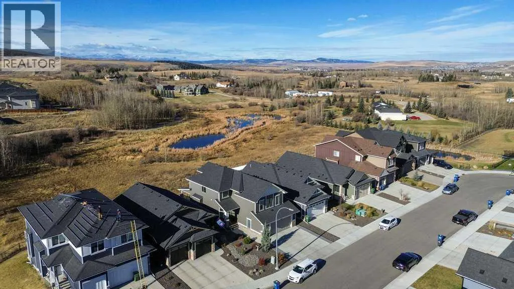 Executive Luxury Living with Panoramic Mountain & Wetland Views!!!Discover this stunning executive Janssen home, perfectly positioned in Cochraneâs coveted Fireside community. Backing onto pristine green space and wetlands with views of the Wild Cat Hills and Rocky Mountains, this home seamlessly combines luxury, space, and serenity.Step inside to soaring 9â ceilings, 8â doors, and wide-plank engineered oak hardwood throughout the open-concept main floor. The gourmet chefâs kitchen impresses with an oversized granite island, full-height custom walnut cabinetry, gas cooktop, electric oven and Bosch microwave. A walk-through Butlerâs Pantry leading to a thoughtfully designed mudroom and oversized garage with epoxy floors. Stylish gemstone lighting adds a touch of elegance and curb appeal to the home.The inviting family room features a striking feature wall with gas fireplace framed by custom walnut built-ins and under-cabinet lighting, while expansive west-facing windows fill the home with natural light and breathtaking views. Step onto the large west-facing deck with glass railingâperfect for entertaining or sunset dining.Upstairs offers a sunlit spacious vaulted bonus room, three bedrooms, and a luxurious primary retreat with spa-inspired ensuite, heated floors, granite double vanity, soaker tub, and a large walk-in closet. The upper-level laundry adds convenience and style with granite counters, cabinetry, and beautiful wood work. Stylish gemstone lighting adds a touch of elegance and curb appeal to the home The walk-out lower level is designed for entertainment with a media area, dual TVs, bar with sink and fridge, and access to a beautifully landscaped backyard oasis featuring underground irrigation, stamped concrete patio, raised garden beds and newly planted shrubs. A great space with lots potential.Enjoy Firesideâs vibrant community with schools, parks, pathways, sports fields, and local amenitiesâall just steps from your door. A prime location with easy access to both downtown Calgary and the mountains. Schedule you private showing today! (id:27476)