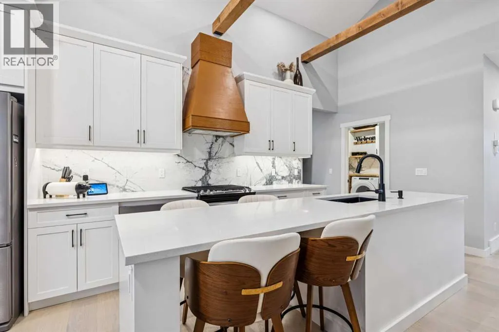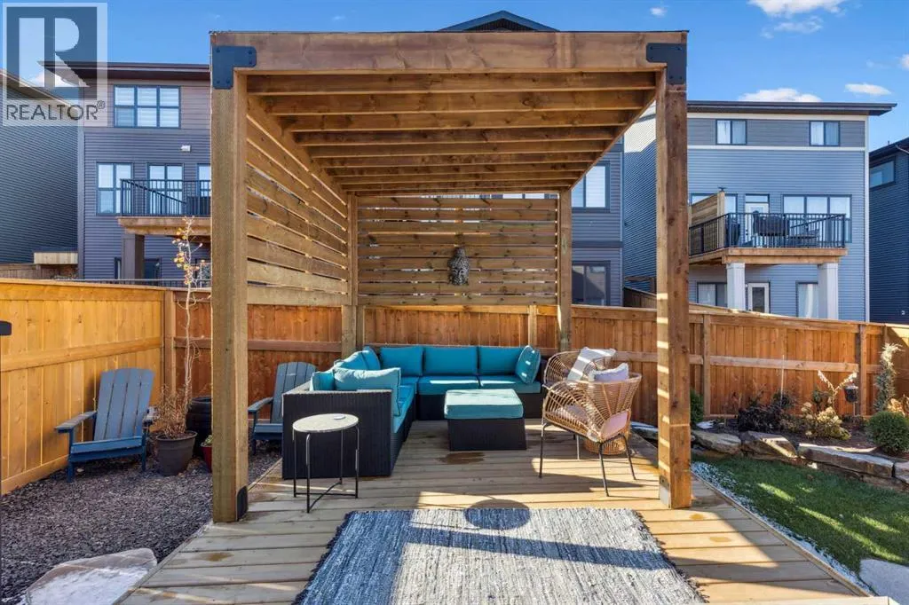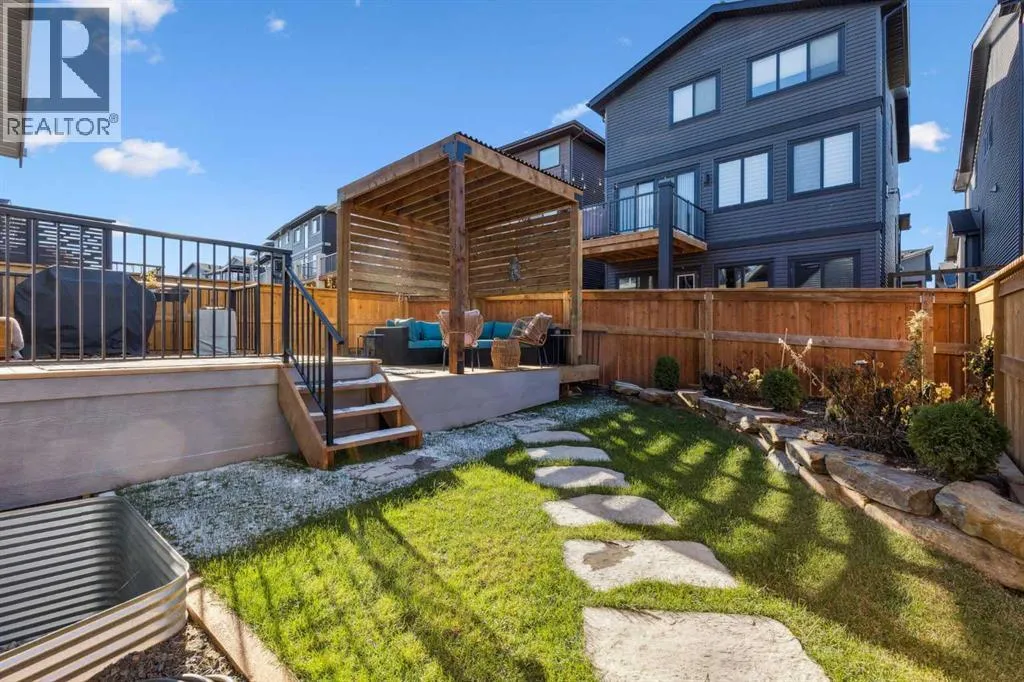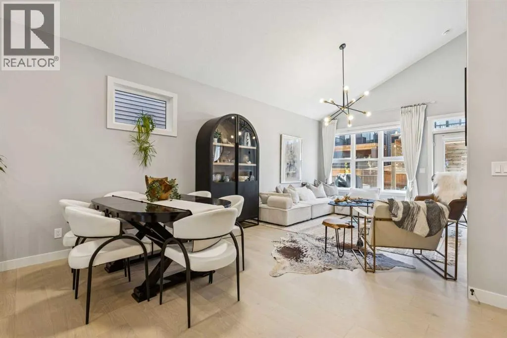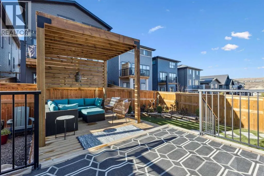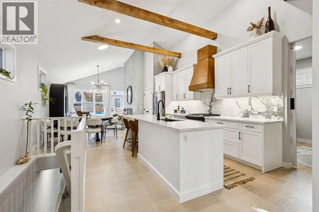 Welcome to this beautifully crafted bungalow that perfectly balances style, comfort, and functionality! Designed with an inviting OPEN-CONCEPT layout, the main floor showcases soaring VAULTED CEILINGS that create a bright and spacious atmosphere. The impressive kitchen features QUARTZ COUNTERTOPS, a statement FEATURE HOOD FAN, updated TILE BACKSPLASH, and plenty of cabinetryâideal for both entertaining and everyday living. The adjoining living room centers around an ELECTRIC FIREPLACE with a striking FEATURE WALL, adding warmth and modern flair.A stylish MAIN FLOOR OFFICE with a BARN DOOR and custom attachment provides the perfect work-from-home setup. The upgraded LAUNDRY ROOM offers added convenience with COUNTERSPACE, SHELVING, and CABINETRY, complemented by UPGRADED TILE. The elegant HALF BATH is thoughtfully finished with a SLATTED ACCENT WALL, QUARTZ COUNTERS, and UPGRADED FIXTURES.The PRIMARY BEDROOM is a true retreat, featuring a generous WALK-IN CLOSET and a spa-inspired ENSUITE complete with DUAL SINKS and a fully TILED SHOWER.Downstairs, the FULLY FINISHED BASEMENT expands your living space with a cozy FAMILY ROOM featuring a FEATURE WALL and DRY BAR, plus TWO ADDITIONAL BEDROOMS and a MODERN 4-PIECE BATHROOMâperfect for guests or family.Step outside to your WEST-FACING BACKYARD OASIS, highlighted by a TWO-TIERED DECK with PRIVACY WALL, a PERGOLA WITH ROOF, BUILT-IN BENCH, and beautiful LANDSCAPING with florals and a PAVING STONE PATHWAYâall while enjoying scenic views of Cochrane.Located in one of Cochraneâs most desirable communities, this home offers high-end finishes, thoughtful design, and incredible outdoor livingâtruly a must-see! (id:27476)