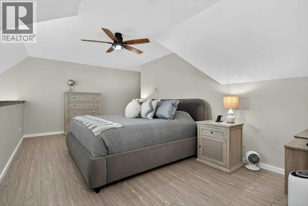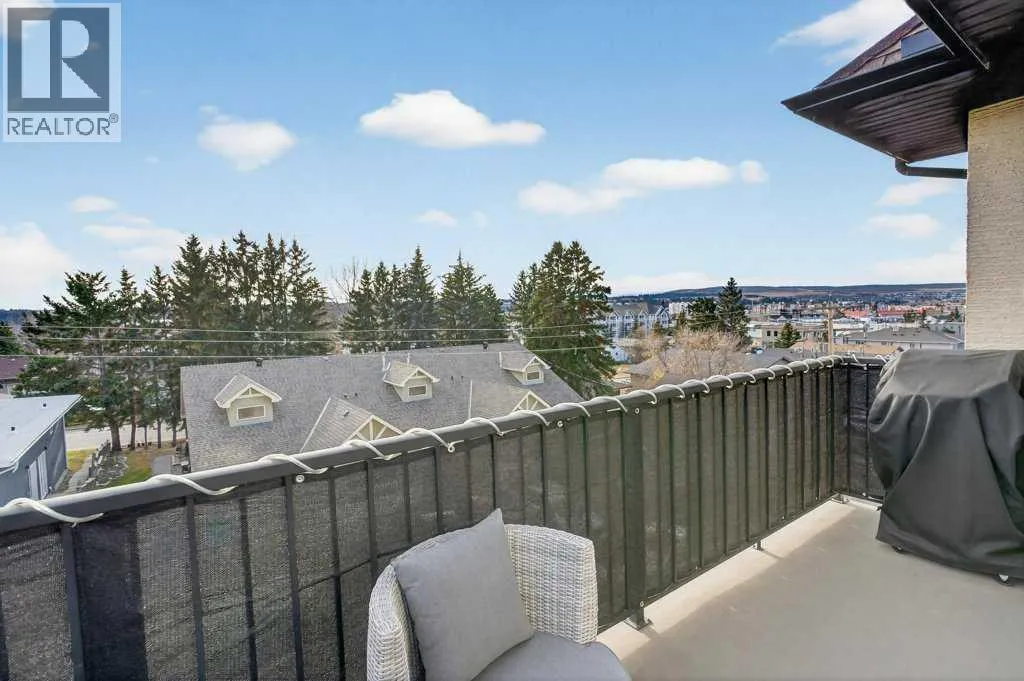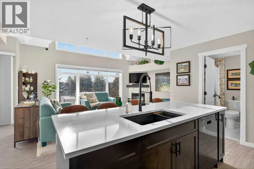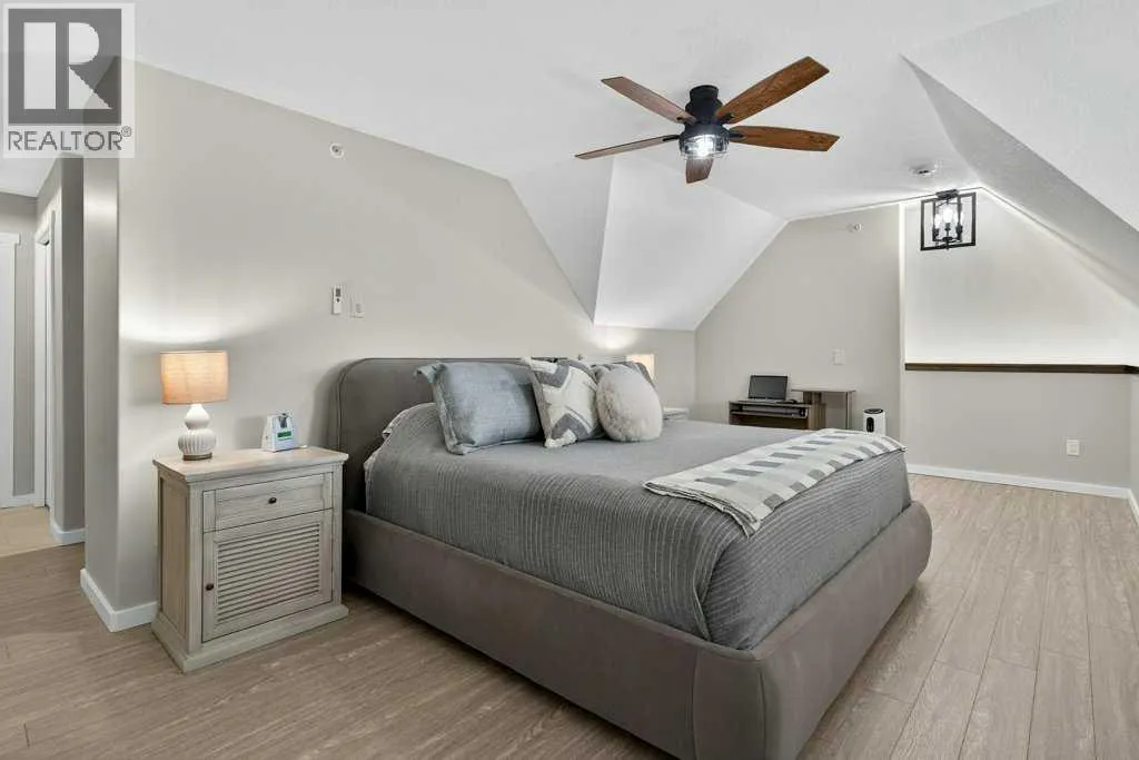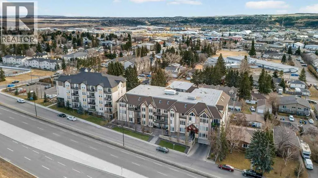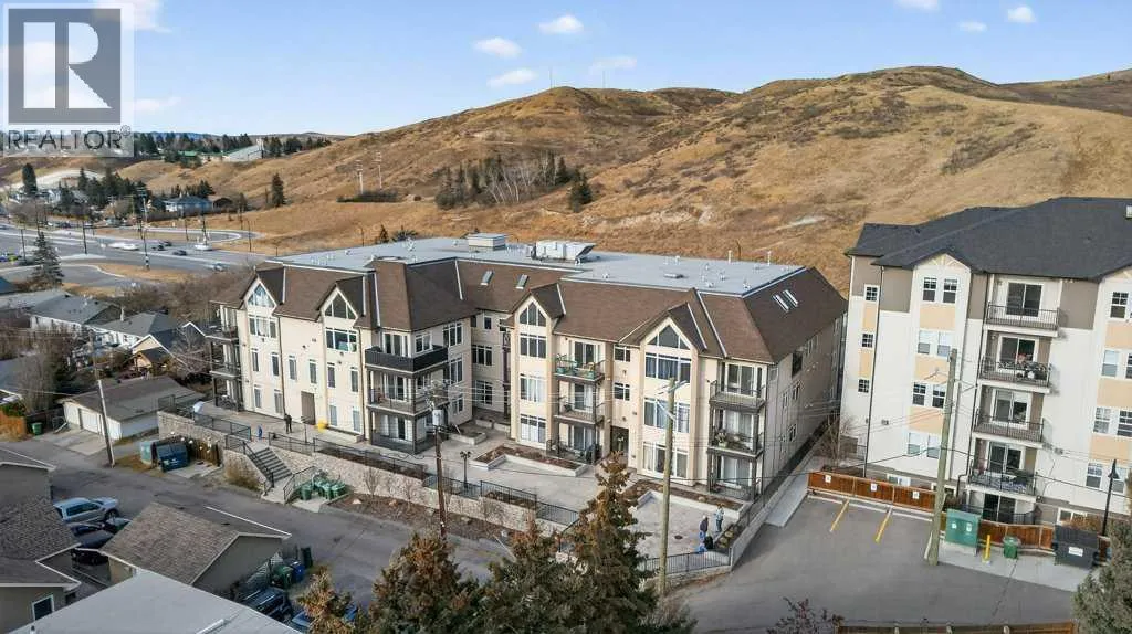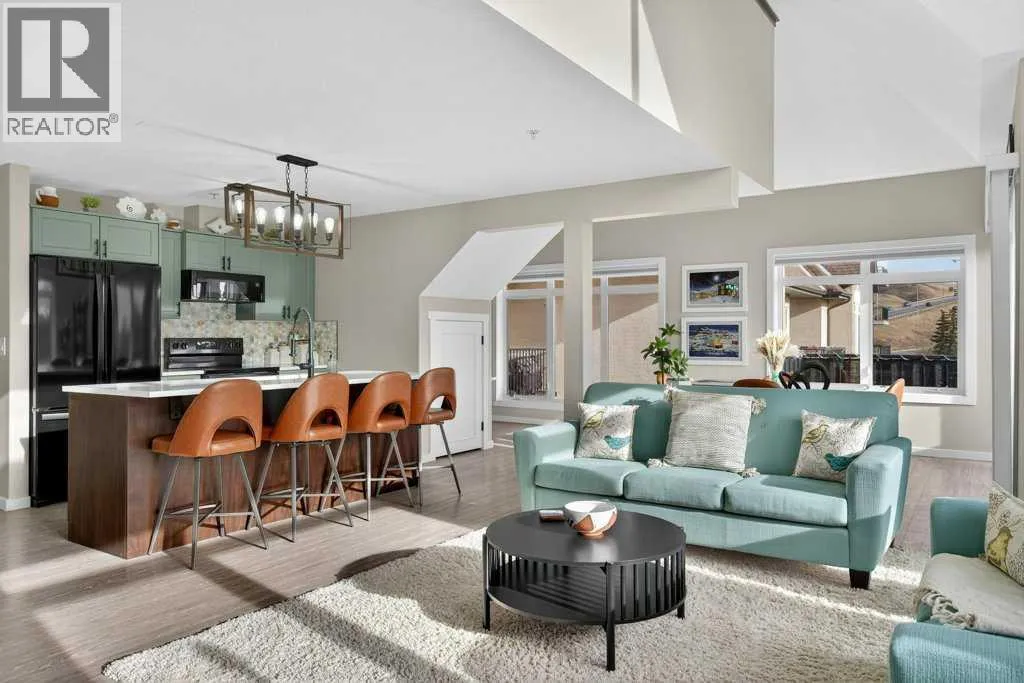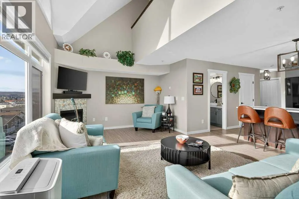 Experience exceptional condominium living in this incredible multi-level residence at 141 Mountain Streetâone of the largest layouts in the entire building. Set in a quiet corner on the south side of the building, this unique unit comes with two titled parking stalls and offers an impressive level of privacy and natural light. Vaulted ceilings and massive windows draw your eyes to a view to Cochrane, while the expansive wrap-around balcony provides a relaxing spot to enjoy a hint of the mountains.The main level features a bright, open design that is perfect for both everyday living and entertaining. Fresh paint and meticulous upkeep make the space feel warm and welcoming. The well-appointed kitchen includes plentiful cabinetry, generous counter space, and a quartz island, ideal for prepping meals or gatherings with friends or family. A spacious dining area flows easily into the inviting living room, complete with a beautifully tiled gas fireplace.This level also includes a comfortable second bedroom, a 4-piece bathroom, and convenient in-suite laundry. Upstairs, the loft-style primary suite offers a peaceful escape with room for large furniture, a walk-through closet with exceptional storage, and a private 4-piece ensuite with dual quartz vanities.Recent upgrades include: New Kitchen cabinets, remodelled island, quartz counter-tops, all new appliances (incl. washer & dryer), new tile in foyer, kitchen backsplash, fireplace surround and both bathrooms (floors & tub/shower), fireplace mantle, paint (walls, doors, trim & ceiling), new sinks, faucets & toilets, light fixtures, custom blinds, new door hardware and even a custom built pantry.A unique advantage of this unit is dual elevator accessâallowing you to reach your home from either the third or fourth floor. The heated parkade includes your two titled stalls, plus additional accessible and visitor parking for added convenience.Just steps from downtown Cochraneâs shops, restaurants, and amenities, this locati on also provides simple access to Calgary and the mountains via Crowchild Trail, Highway 1, and the nearby Tuscany C-Train station. (id:27476)