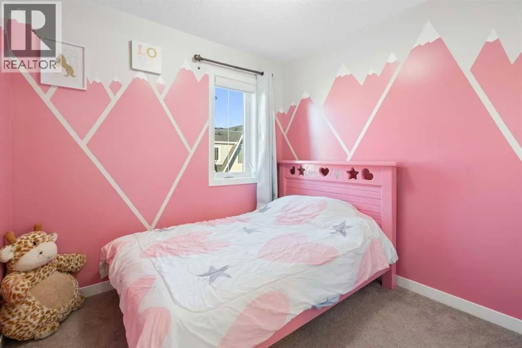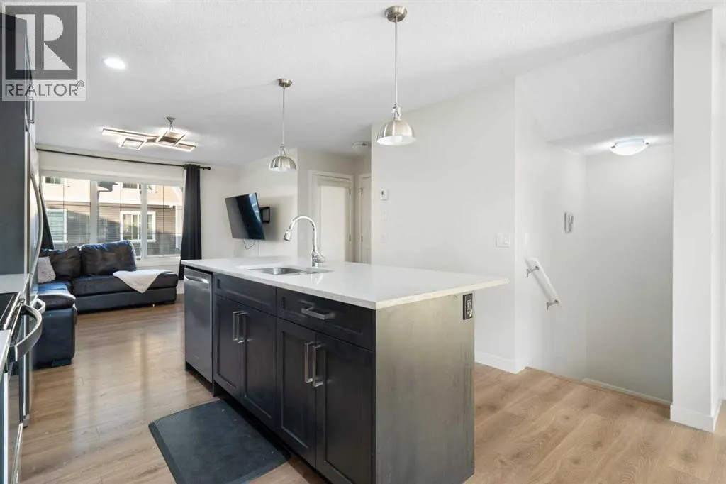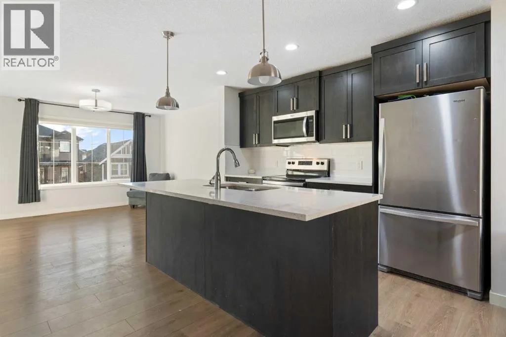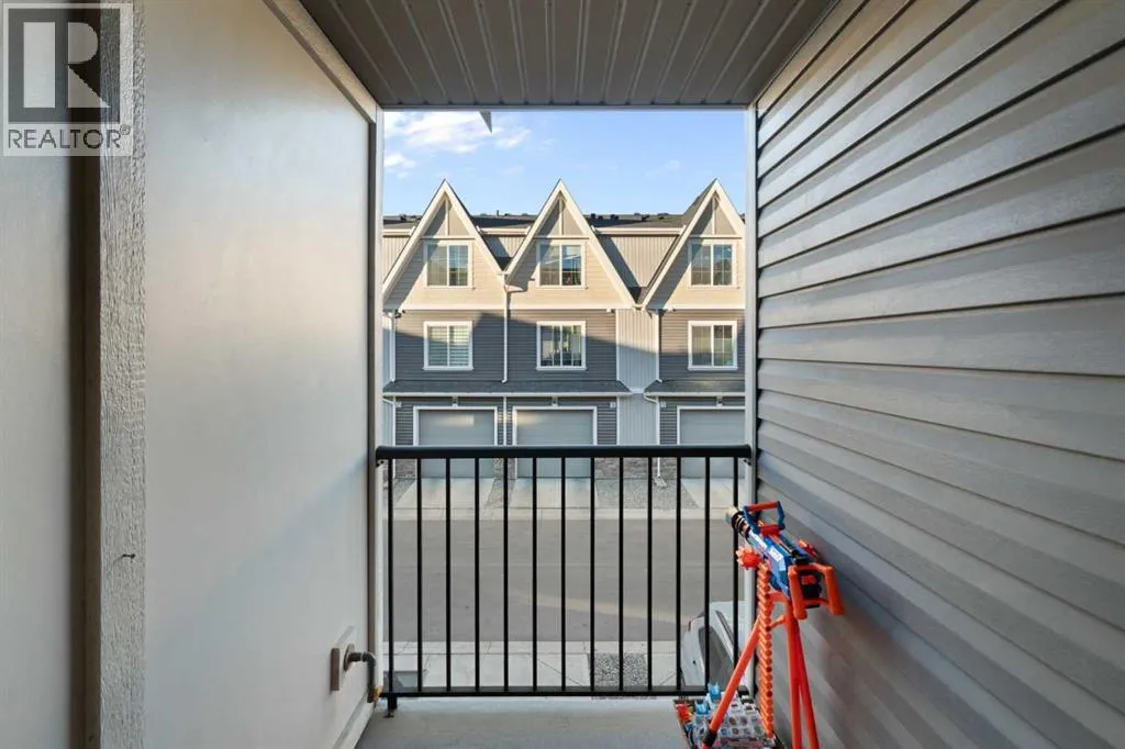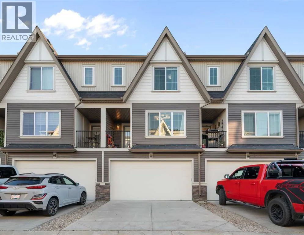 Welcome to Vantage at Fireside â a modern, low-maintenance townhome community perfectly positioned within walking distance to parks, schools, and all of Firesideâs amenities.Offering over 1,420 sq. ft. of stylish living space, this three-bedroom home features an open-concept design with abundant natural light and a thoughtful layout for both comfort and functionality. The main level includes a bright south-facing patio, a flexible den or home office, and a modern kitchen complete with a large stone island, stainless steel appliances, and access to a private balcony with a natural gas BBQ line. The adjoining dining and living areas create a warm and inviting space for relaxing or entertaining.Upstairs, the spacious primary suite includes a 4-piece ensuite and walk-in closet. Two additional bedrooms, another full bathroom, and a convenient upper-floor laundry (upgraded Whirlpool washer & dryer included) complete this level.Additional highlights include an attached double garage, extended driveway with parking for two extra vehicles, window coverings throughout, and completed landscaping â ready for immediate move-in.Located steps from Bullrush Pond Park, walking paths, and a variety of local shops and restaurants, this home combines modern living with small-town charm and quick access to Highway 22 and Highway 1A for an easy commute to Calgary or the mountains. (id:27476)