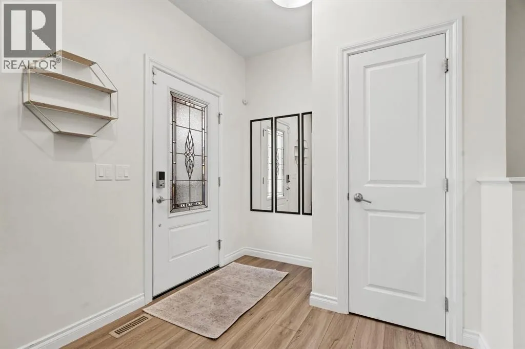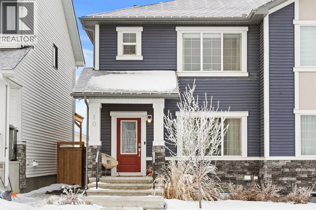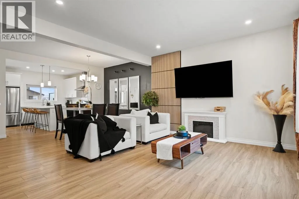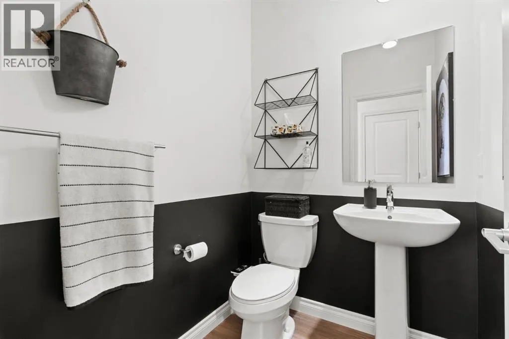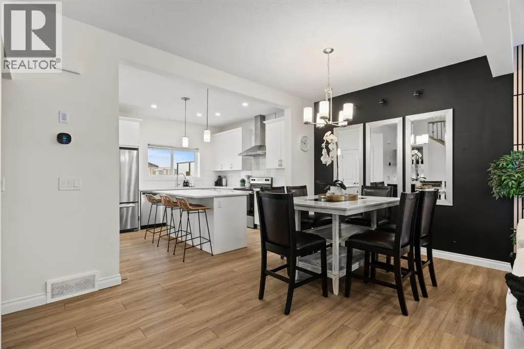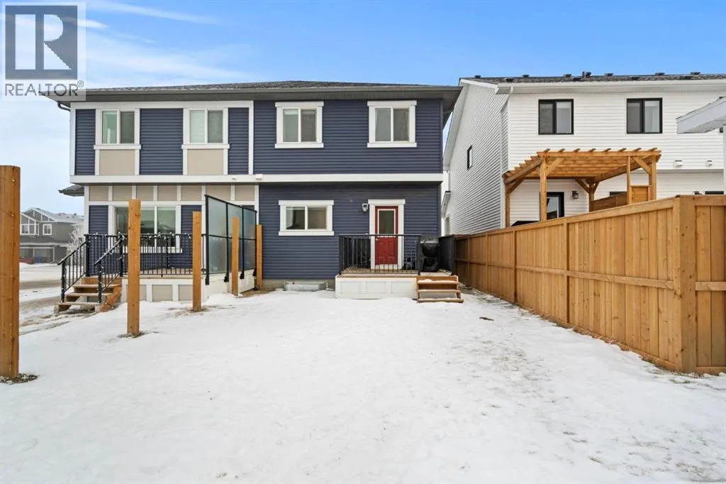 Welcome to this beautifully maintained 2-storey duplex in the heart of Cochrane, offering modern finishes, including smart technology with controls for lights, heat and door locks that can be controlled through your phone. As well as an Alexa doorbell. Thoughtful upgrades, and exceptional versatility in a neighbourhood loved for its proximity to schools, daycares, parks, and everyday amenities. The main level welcomes you with a bright, open-concept layout highlighted by vinyl plank flooring, recessed lighting, and stylish feature accents that add warmth and contemporary appeal. The inviting living room has large windows that flood the space with natural light creating an ideal setting for both everyday living and entertaining. At the heart of the home is the stunning kitchen, thoughtfully designed with quartz countertops, stainless steel appliances, crisp white cabinetry, and a large centre island with seating. Pendant lighting and a clean tile backsplash complete the space, while the adjacent dining area provides ample room for family meals and gatherings. A convenient main-floor powder room completes this level. Upstairs, youâll find three well-sized bedrooms, including a serene primary retreat featuring a walk-in closet and private 4-piece ensuite. Two additional bedrooms are served by a second 4-piece bathroom, creating a functional and family-friendly layout. The upper level also includes convenient laundry located near the bedrooms and a thoughtfully designed built-in desk/workstation, perfect for homework, remote work, or creative use. The fully finished basement adds incredible flexibility and value, offering a spacious recreation area ideal for a home gym, media room, play space, or studio. This level also features a bedroom and bathroom, making it perfect for guests, teens, or extended family. Custom built-in storage and modern finishes complete this well-designed lower level. Additional highlights include central air conditioning for year-round comfort a nd a thoughtfully planned layout with 1,486 sq. ft. of above-grade living space, plus an additional 660.27 sq. ft. in the professionally developed basement. Situated in a welcoming Cochrane community close to parks, schools, daycares, and local amenities, plus enjoy, an outdoor pump track, skate park, and outdoor rink within a 5 min walk of the home. This home offers the perfect balance of style, comfort, and location ideal for families, first-time buyers, or anyone looking to enjoy small-town living with modern conveniences. Don't miss your chance to see this one today. Quick possession is available. (id:27476)