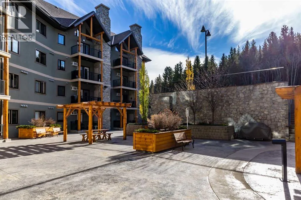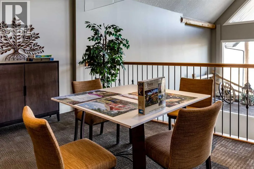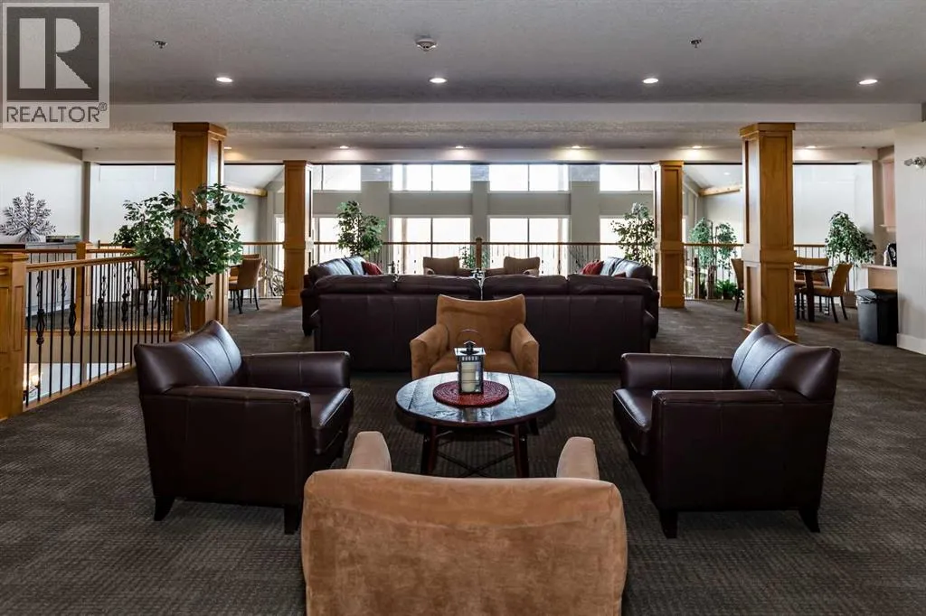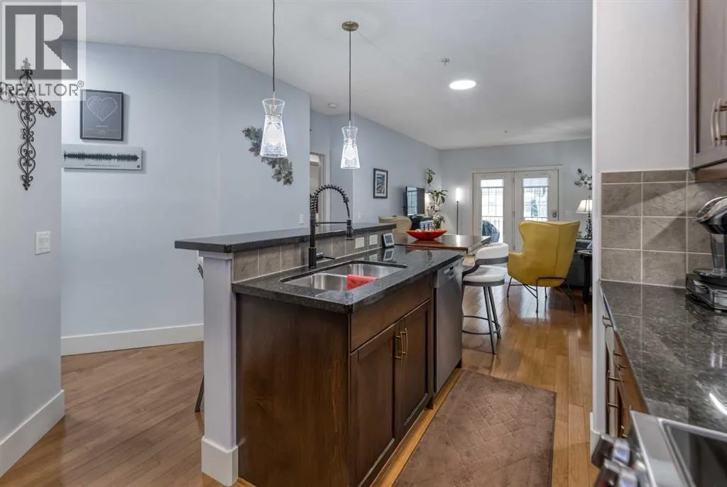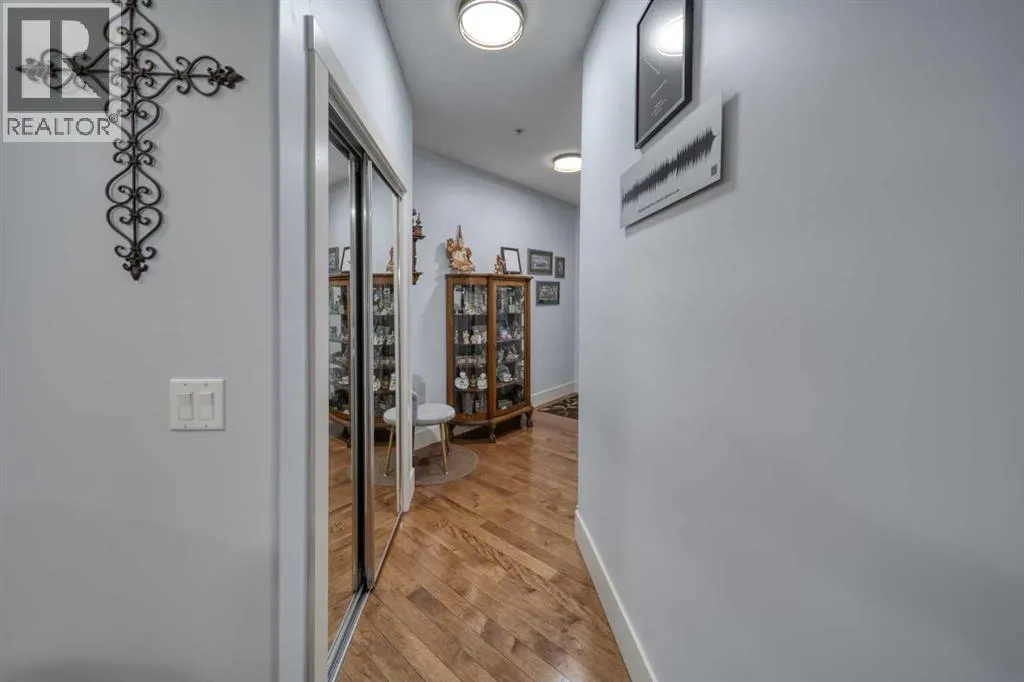 Welcome to Cochrane's most prestigious condo complex. Situated along George Fox Trail, Lofts on the Bow overlooks soccer fields, a playground area, the Bow River and the Big Hill. This two bedroom, two bathroom condo plus a Den is an end unit and features a private patio adjoining the 7,000 square foot Courtyard. The patio comes with a gas hookup for your BBQ and also has a storage room included. Inside, this unit features Hardwood floors throughout except in the bathrooms and Laundry room. The Kitchen has Gleaming granite counter tops and lots of cabinets . The lower cabinets have pullout shelving. The ceilings are 9 feet tall . New lighting throughout and unit has all new paint. All appliances are included and are just 1 year old with 3 years of extended warranty transferable to the NEW OWNER. This condo is secluded and sheltered and great for bird watching. This complex is a 55+ building and has many amenities including a pool table for those who like that, a workout room with various machines, a meeting room/ quilting room, a full kitchen and banquet facilities. There are also two guest suites that can be rented for your guests comfort. One Titled and heated underground parking space is included and there is a car wash in the Parkade. There are also lots of outside parking spaces on either side of the condo building and extra ones at the back of the building for those oversized vehicles. With easy access you can enter this PRESTINE property showing PRIDE OF OWNERSHIP THROUGHOUT . (id:27476)
