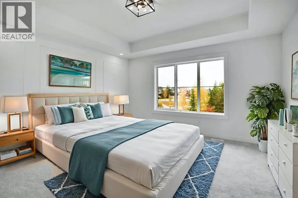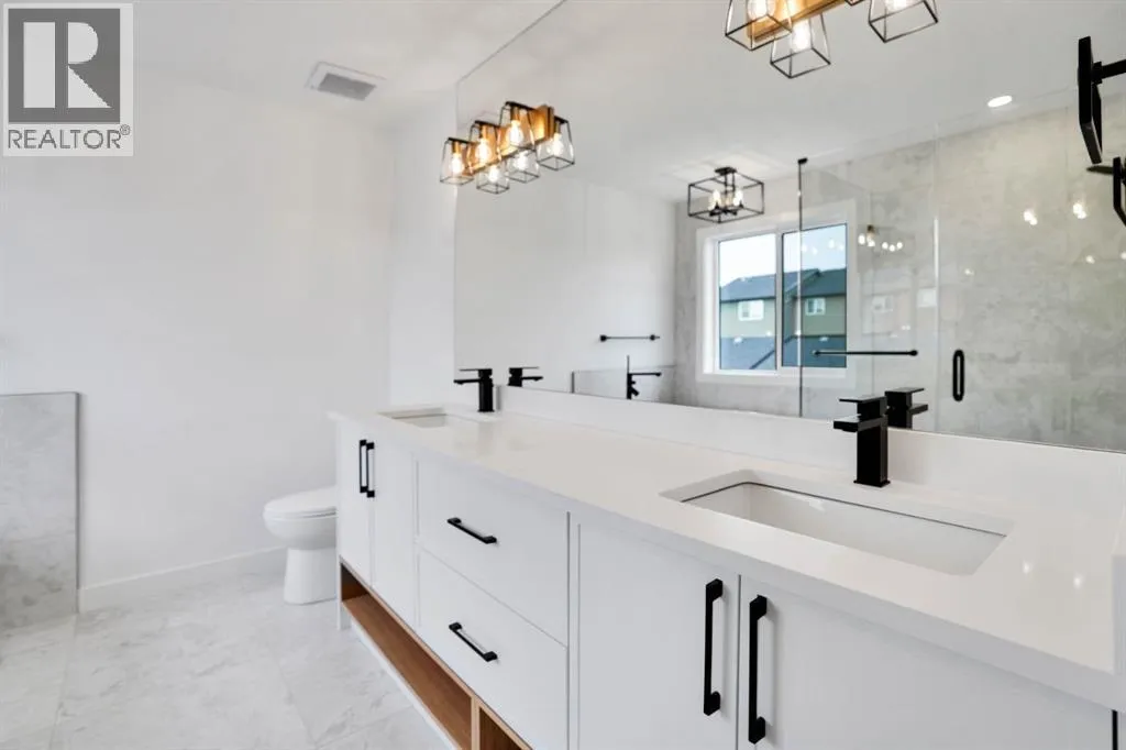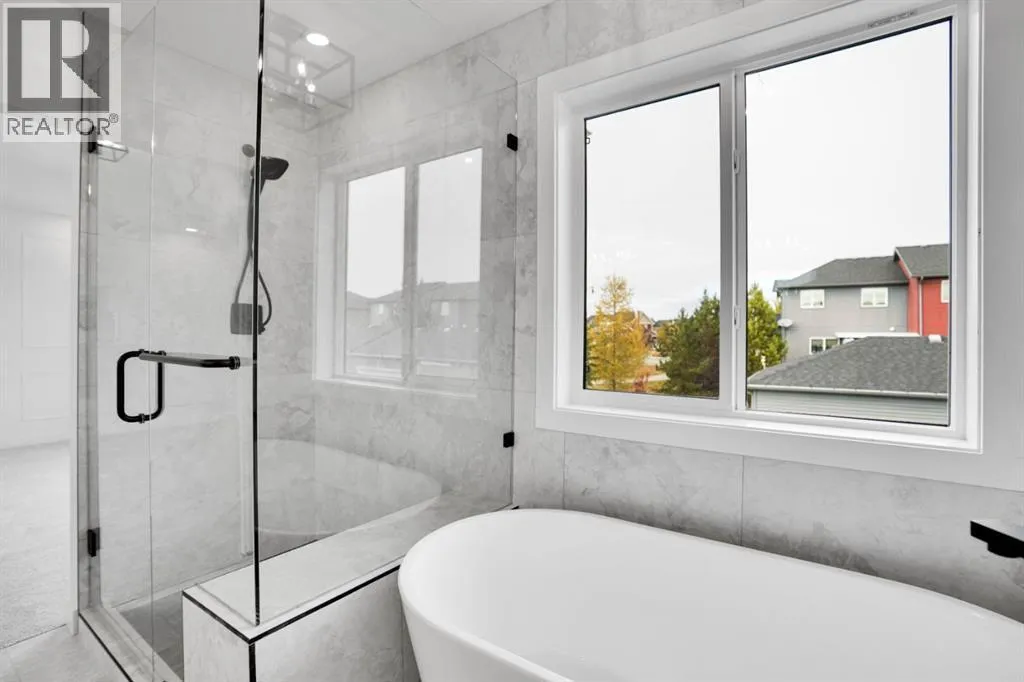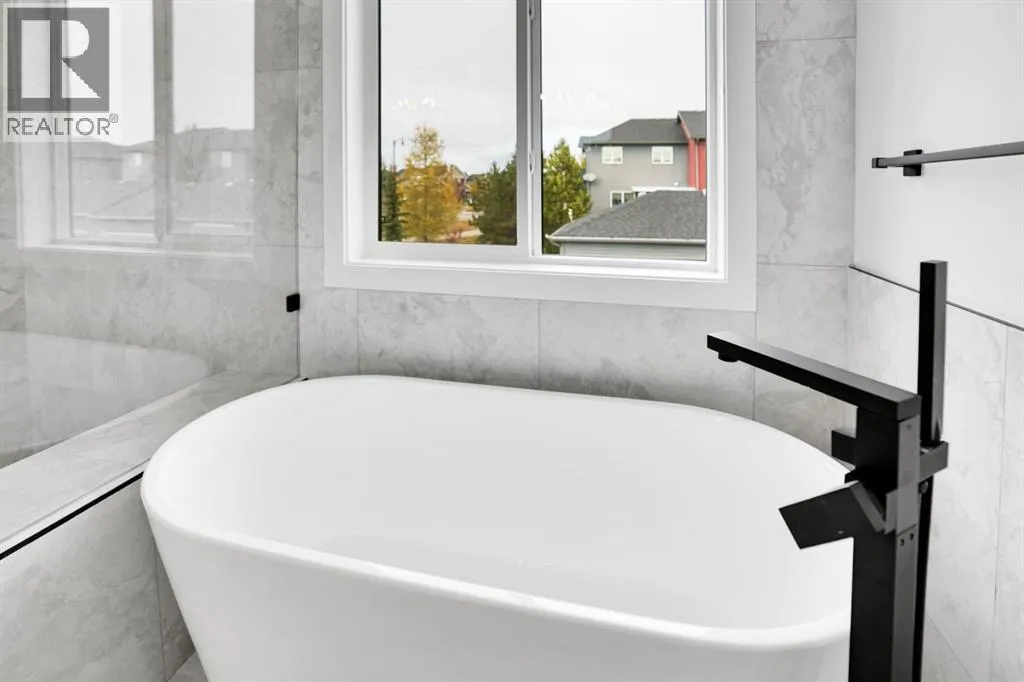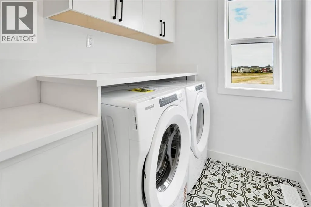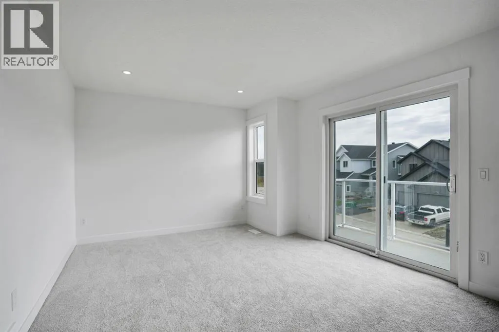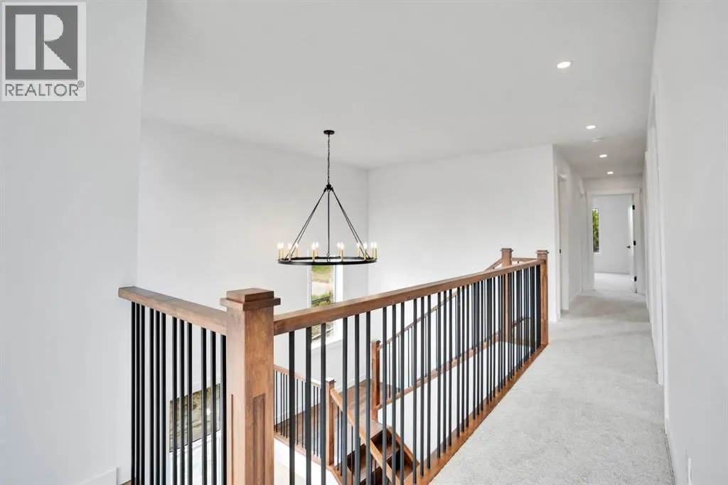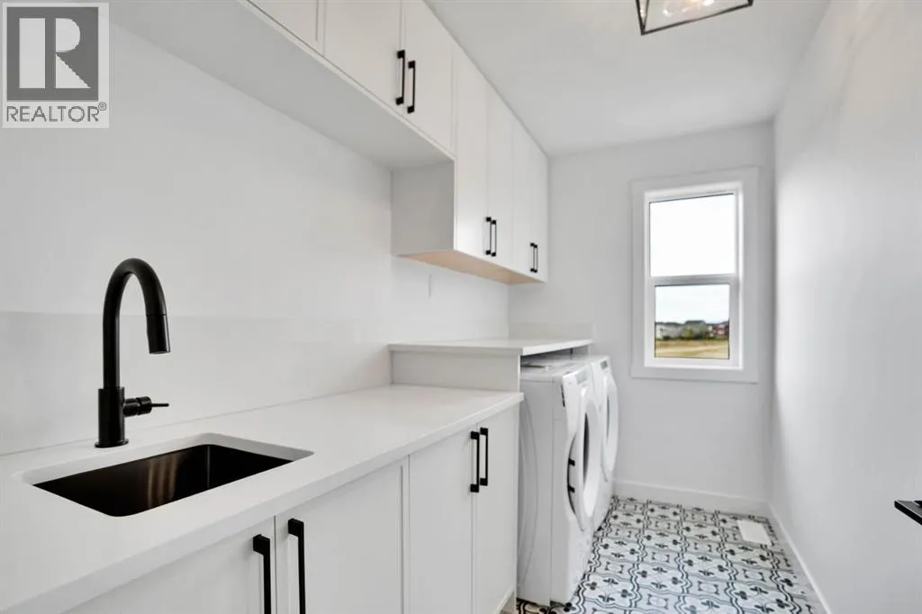 Welcome to this stunning 2200+ sq. foot home in the heart of Pinnacle in Sunset Ridge, Cochrane, where modern design meets natural beauty. Just 45 mins from the majestic Rocky Mountains and 30 mins from downtown Calgary, this home is surrounded by serene ravine and mountain views, offering the perfect balance between peaceful retreat and urban convenience. Built with every detail in mind, the home features a timeless neutral colour palette and large windows that fill each room with natural light. The open-concept great room centers around a cozy fireplace, seamlessly connecting to a spacious dining area and chef inspired kitchen. The kitchen boasts elegant white oak cabinetry with under-cabinet lighting, a large central quartz island ideal for entertaining, and high-end stainless steel KitchenAid appliances, including a gas stove, built in wall oven, and microwave. A Blanco granite sink adds both functionality and style to this beautiful space. Upstairs a central bonus room opens onto a private balcony where you can take in the sweeping views of the ravine and mountains. The primary suite is a tranquil retreat with a soft accent wall and a decorative barn door leading to the luxurious 5-piece ensuite complete with a stand-up shower, freestanding soaker tub, dual vanity, and large walk in closet with custom built in shelving. The upper floor also features a convenient laundry room with washer and dryer, built in sink, and additional cabinetry, as well as 2 spacious secondary bedrooms designed fo comfort and flexibility. Thoughtful details are found throughout the home, including a wide front entrance with built in bench, a mudroom with organized shoe racks and coat hooks, and balconies at both front and back of the house that offer 360-degree views. Additional conveniences include AC, blinds, gas line to the garage, a separate side entrance, and a large back deck with a BBQ gas hookup, perfect for outdoor gatherings. This exceptional property is ideally located nea r scenic walking trails, schools, restaurants, and shopping, making it the perfect place to call home. Combining modern craftsmanship, elegant finishes, and breathtaking surroundings, this Cochrane residence offers the best of luxury living with a touch of mountain tranquility. Call for your private showing today. (id:27476)
