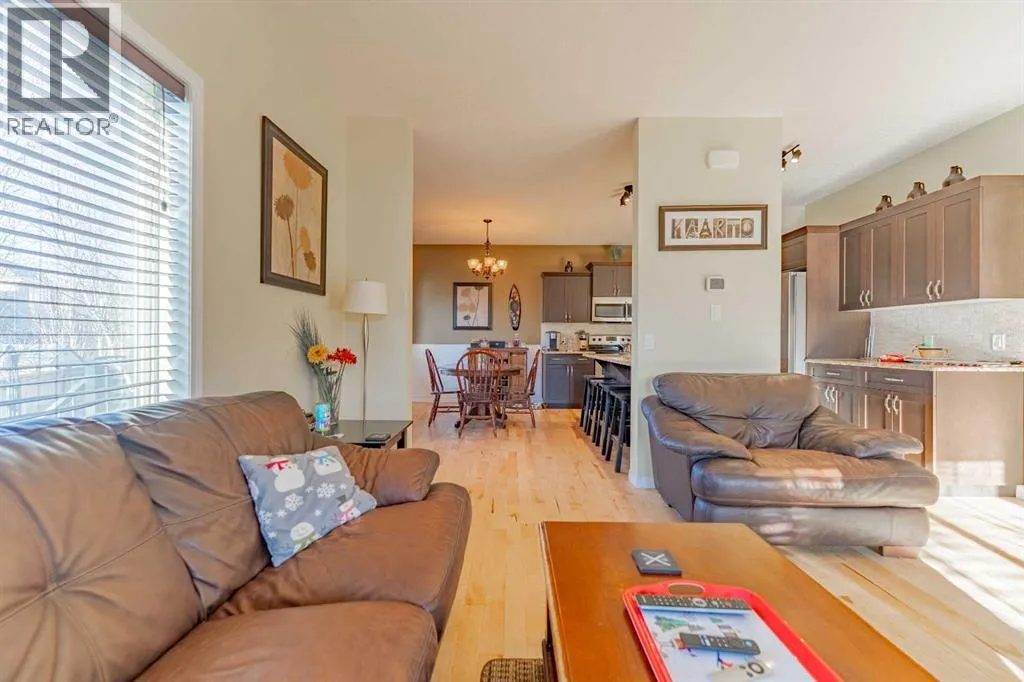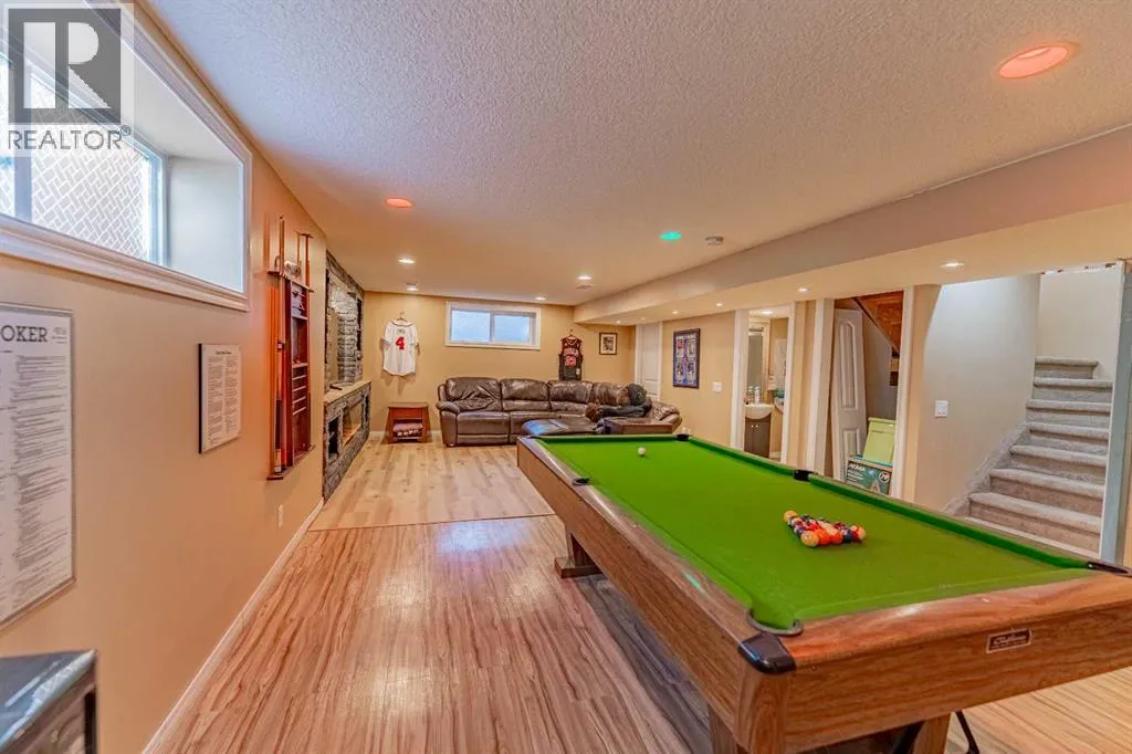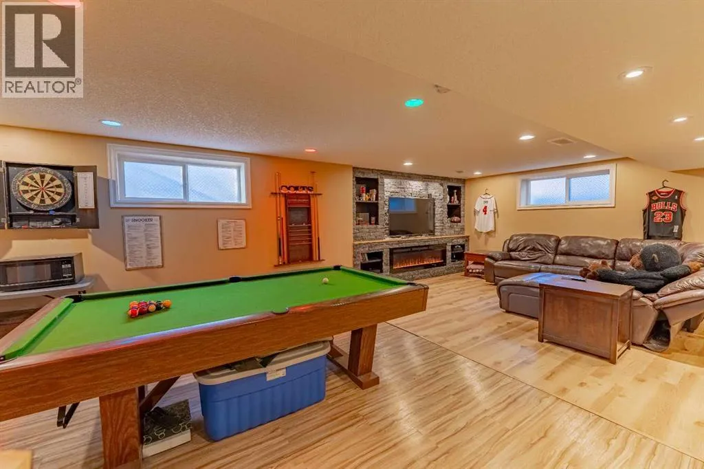 Welcome to 142 West Pointe Circle, a charming detached family home tucked away on a quiet cul-de-sac just steps from the Bow River. Located in one of Cochraneâs most sought-after neighbourhoods, this home offers the perfect blend of retreat, convenience and entertaining. The West Pointe community is known for its gorgeous walking trails, riverfront scenery, and ideal proximity to elementary schools and daycares â all while feeling just far enough removed from downtown to offer a peaceful, nature-connected lifestyle. Inside, the main level features a thoughtful layout with a warm, natural flow between the living room, kitchen, and laundry room. While not fully open-concept, each space is connected in a way that feels comfortable and intuitive for everyday family living. Upstairs, the staircase splits into two inviting wings. To the right, a bright and spacious family room awaits â flooded with natural light from large windows and offering the perfect spot for movie nights, a play area, or a cozy second living room. To the left are the homeâs three bedrooms, including the primary suite overlooking the front of the property. This retreat features a generous walk-in closet and a well-appointed 4-piece ensuite with a soaking tub and separate shower. The basement is a true standout, designed for those who love to entertain and relax. A custom stone feature wall anchors a built-in entertainment area complete with a Napoleon electric fireplace for cozy atmosphere and visual appeal. On the opposite end, the same stonework ties into an impressive wet bar, creating a stylish, cohesive âman-caveâ vibe. Thereâs ample space for a comfortable TV seating area as well as room for a full-sized pool table â the perfect setup for game nights, gatherings, or unwinding in your own private retreat. Outside, the backyard continues to elevate the lifestyle this home offers, with a spacious hot tub and stone sitting area ideal for evening fires and outdoor entertaining. A double attached gar age and built-in dog run/kennel add convenience for both owners and pets. Beautifully located, thoughtfully designed, and loaded with character, 142 West Pointe Circle is a true gem for families seeking comfort, community, and Cochraneâs natural beauty right at their doorstep. (id:27476)