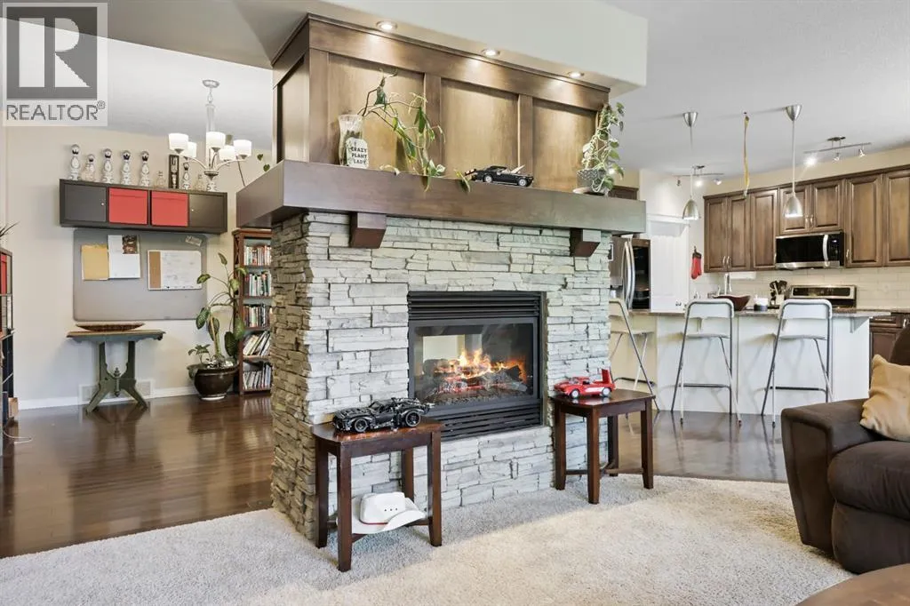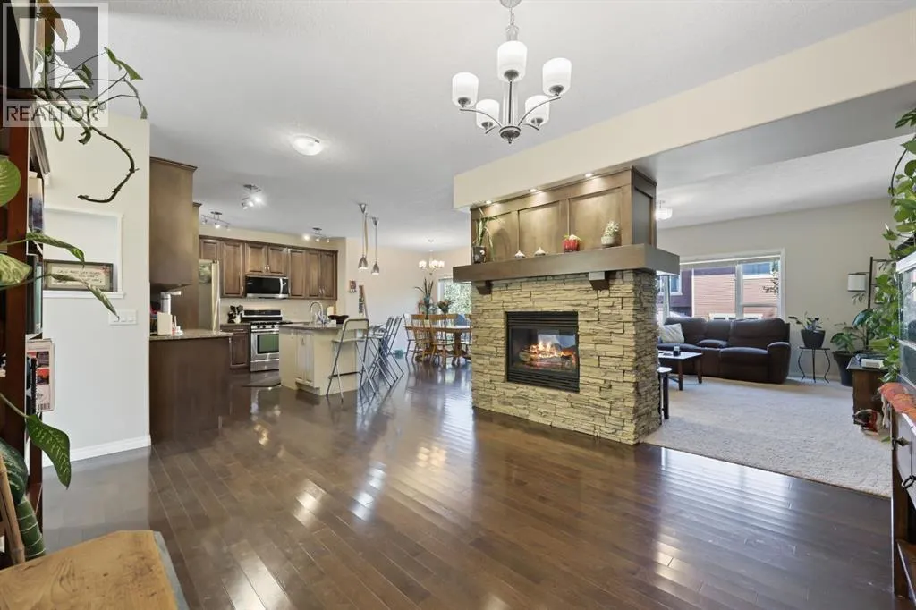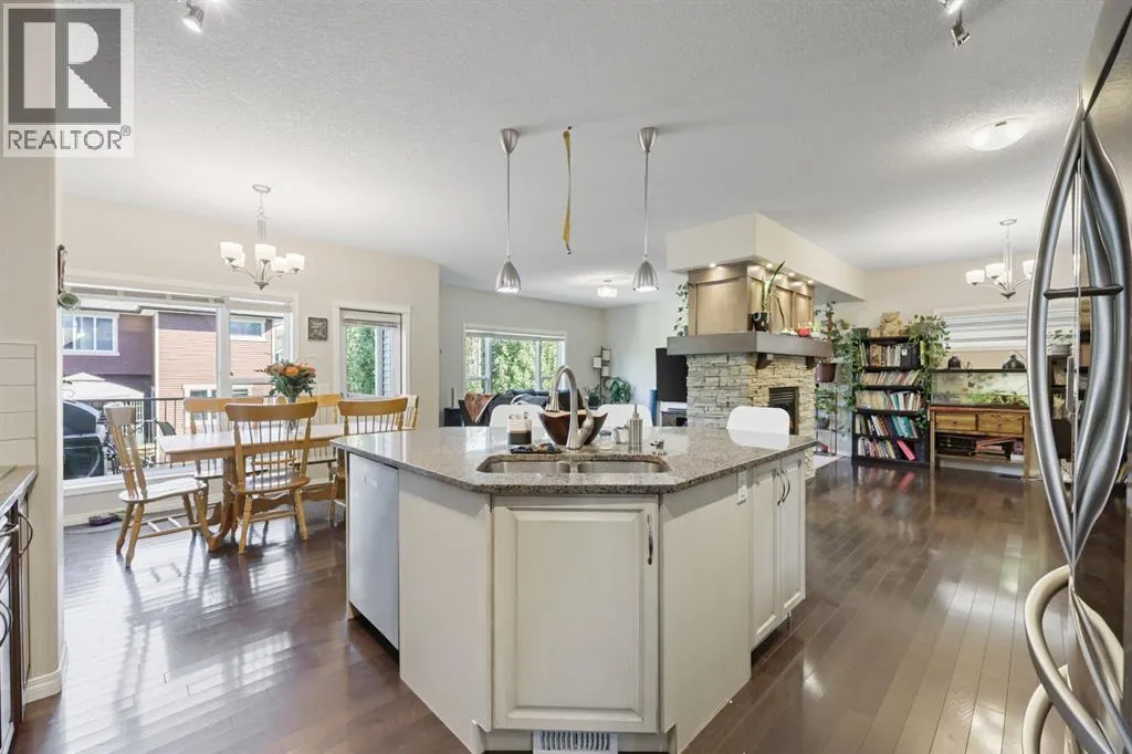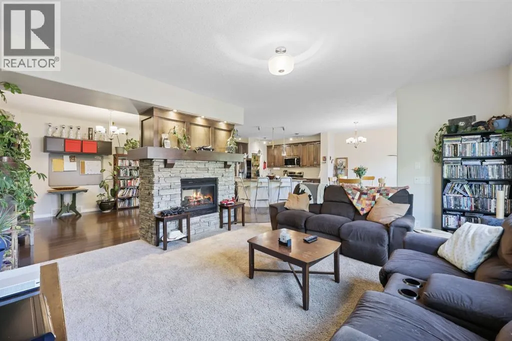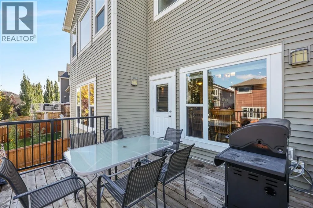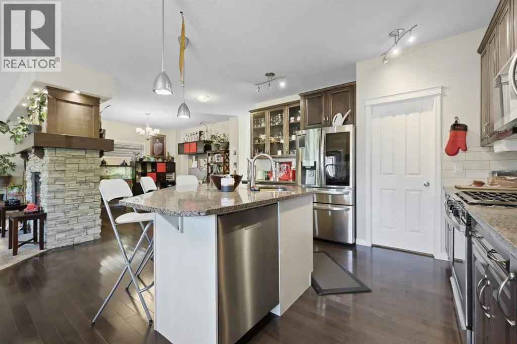 This executive two story WALK OUT home has 3 bedrooms, laundry, and a family room on the upper level with large windows to let in lots of natural light. The main floor features an open concept layout with a kitchen hosting granite countertops, a walk though pantry a spacious living room and a formal dining room, all enhanced by a double sided gas fireplace framed in exquisite stonework. A deck adjacent to the kitchen suitable for an outdoor patio, includes a gas BBQ hook up. The kitchen is equipped with a gas stove, refrigerator featuring a water/ice dispenser with an illuminated front door, and a newly installed dishwasher. The basement contains a private "mother in law" living area with its own laundry facilities, private entrance and privacy door from upstairs. The residence is warmed with forced air heating and cools you with AC! It also offers an attached heated double car garage with spacious back entry coat area and a significant storage room in the basement. The lower patio brings some privacy space, and a cozy sitting area Nearby walking path lead to Jumping Pound Creek, and paths to downtown. (id:27476)