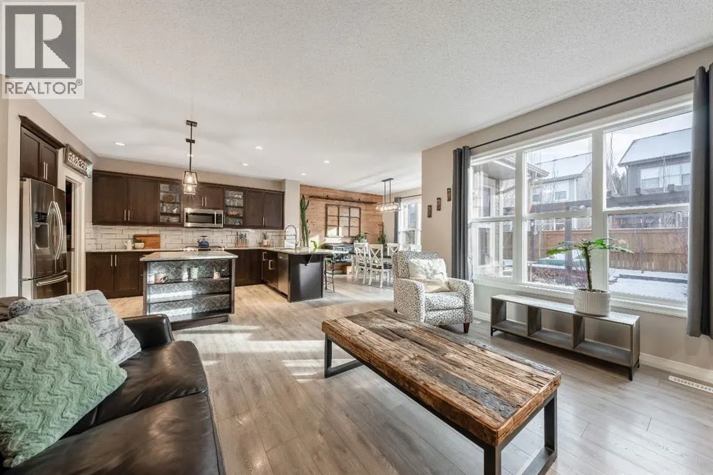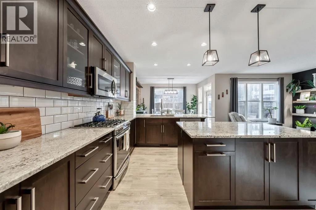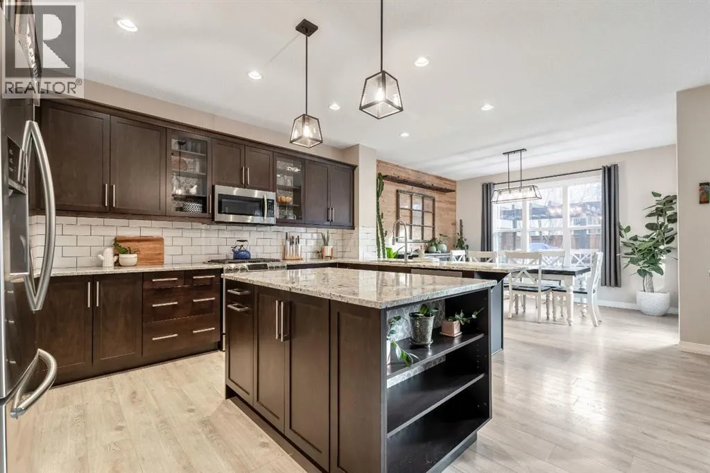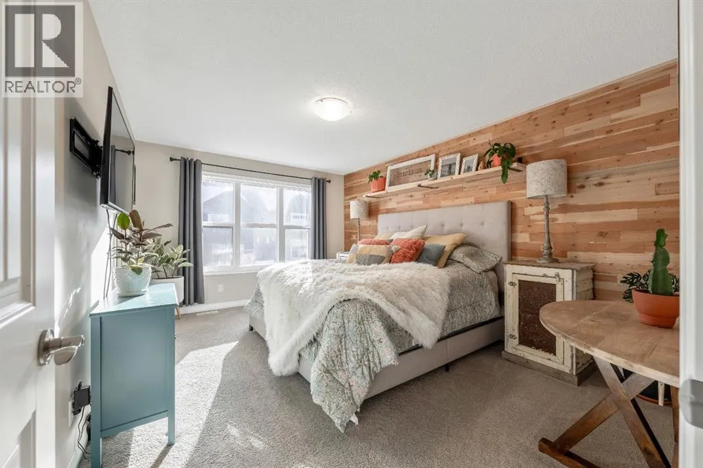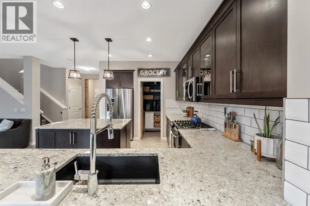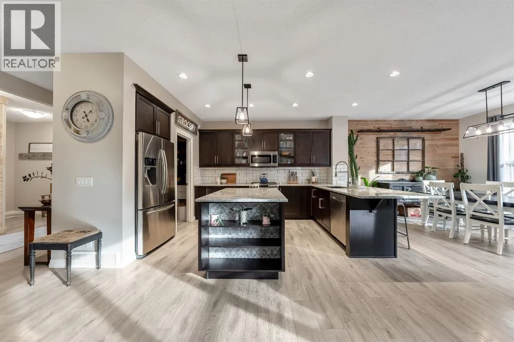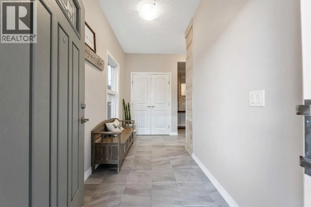 ** OPEN HOUSE, Sunday, February 15th 1-3PM ** Just steps from the Bow River pathway, this thoughtfully upgraded home offers a rare combination of everyday functionality with some standout design upgrades. The oversized double attached garage has been extensively customized with a 15â ceiling, radiant heating, and professional-grade finishingâmaking it a true showpiece. Quality craftsmanship, purposeful upgrades, and exceptional outdoor living come together seamlessly here. The main floor offers a warm and inviting living room highlighted by a gas-tiled fireplace, feature walls, custom shelving, and a charming custom barn door at the rear entry adding character and versatility. The kitchen is both stylish and practical, featuring granite countertops, a large island with built-in garbage and recycling pull-outs, espresso cabinetry with glass doors, stainless steel appliances, and a gas cooktop. A custom pantry door and electrical in the pantry complete the space. Upstairs, the spacious primary bedroom offers a relaxing retreat with a large soaker tub, his-and-hers sinks and vanity spaces, and his-and-hers walk-in closets. Two additional generous-sized bedrooms, a full four-piece bathroom, and convenient upper-floor laundry complete the upper level.The unfinished basement is ready for your design ideas and includes a bathroom rough-in and provides excellent potential for future customization. Additional highlights include a rough-in for air conditioning and a recently serviced tankless hot water heater.The oversized double attached garage is truly a standout feature, measuring approximately 20â x 23â with an impressive 15â ceiling height. Professionally finished, this space has been extensively customized with an epoxy-coated floor, hot and cold water with additional shut-off valves conveniently located in the basement, and frost-free taps in the garage for added peace of mind. Heating is provided by a Schwank 40,000 BTU radiant tube heater with thermostat ($10k valu e), complete with a permitted fresh air intake. A dedicated 220V outlet on its own breaker has also been installed, offering excellent flexibility for future use. Tire hangers mounted beside the wall-mounted black cabinet are included. The backyard has been thoughtfully designed to create a private and inviting outdoor retreat, framed by mature trees for natural privacy. A custom cedar deck anchors the space, complemented by a covered pergola featuring substantial Douglas fir beams and a solid fir structure. Carefully planned landscaping and a structured drainage system enhance both the beauty and long-term functionality of the yard and a structured drainage system designed to prevent water issues. Additional features include reflective tint on all windows to help keep the home cool in summer months, and a transferable business permits. Riviera is the upscale community you will love to call home, just steps from the gorgeous Bow River and a short drive to Calgary and the Rocky Mountains. (id:27476)