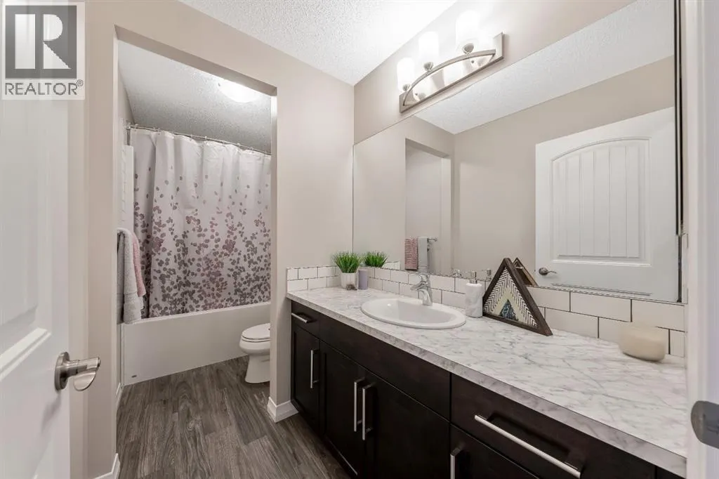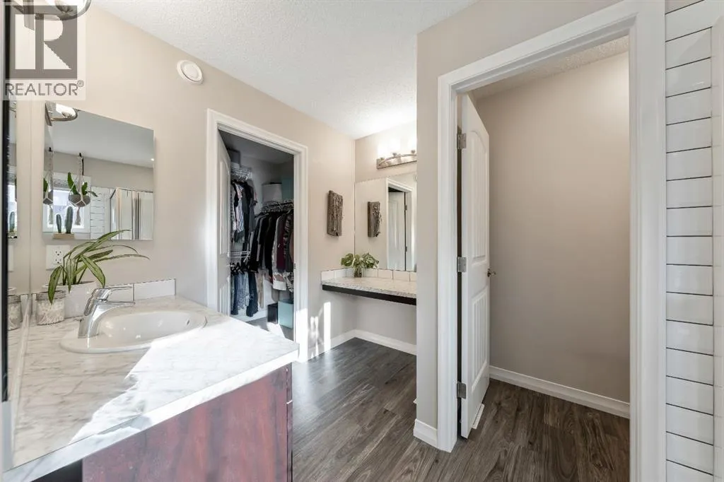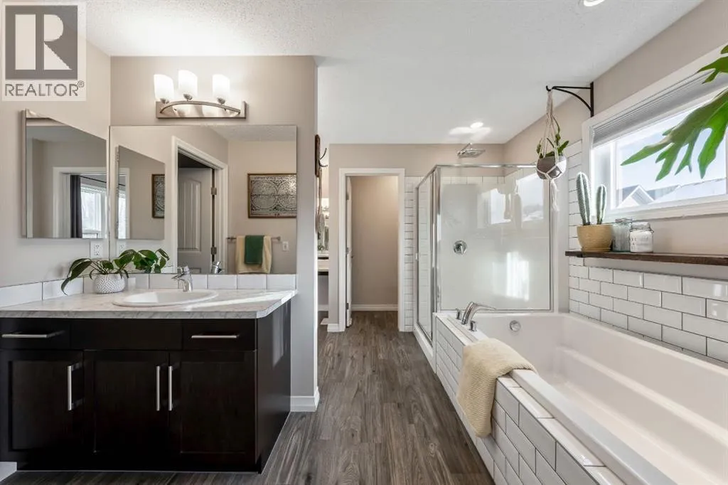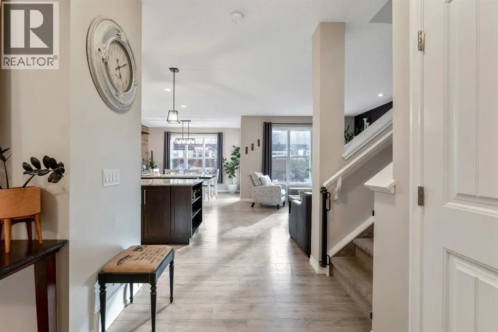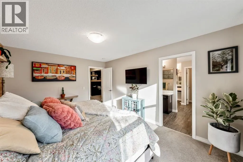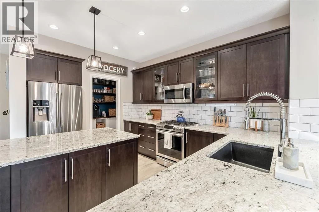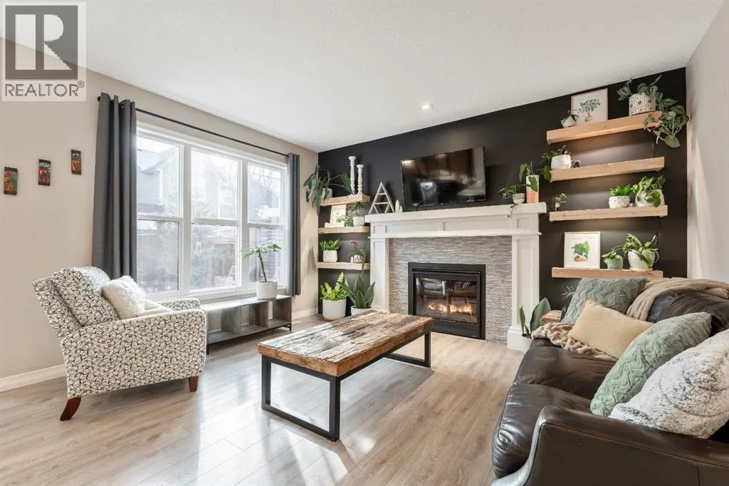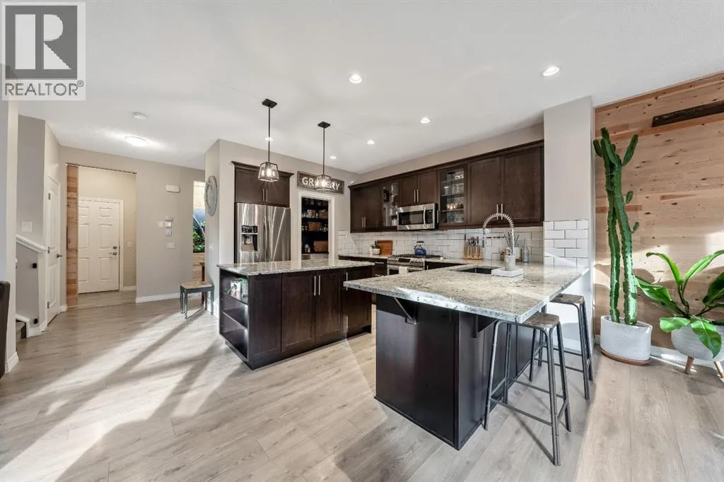 ** OPEN HOUSE, Sunday, February 15th 1-3PM ** Just steps from the Bow River pathway, this thoughtfully upgraded home offers a rare combination of everyday functionality with some standout design upgrades. The oversized double attached garage has been extensively customized with a 15â ceiling, radiant heating, and professional-grade finishingâmaking it a true showpiece. Quality craftsmanship, purposeful upgrades, and exceptional outdoor living come together seamlessly here. The main floor offers a warm and inviting living room highlighted by a gas-tiled fireplace, feature walls, custom shelving, and a charming custom barn door at the rear entry adding character and versatility. The kitchen is both stylish and practical, featuring granite countertops, a large island with built-in garbage and recycling pull-outs, espresso cabinetry with glass doors, stainless steel appliances, and a gas cooktop. A custom pantry door and electrical in the pantry complete the space. Upstairs, the spacious primary bedroom offers a relaxing retreat with a large soaker tub, his-and-hers sinks and vanity spaces, and his-and-hers walk-in closets. Two additional generous-sized bedrooms, a full four-piece bathroom, and convenient upper-floor laundry complete the upper level.The unfinished basement is ready for your design ideas and includes a bathroom rough-in and provides excellent potential for future customization. Additional highlights include a rough-in for air conditioning and a recently serviced tankless hot water heater.The oversized double attached garage is truly a standout feature, measuring approximately 20â x 23â with an impressive 15â ceiling height. Professionally finished, this space has been extensively customized with an epoxy-coated floor, hot and cold water with additional shut-off valves conveniently located in the basement, and frost-free taps in the garage for added peace of mind. Heating is provided by a Schwank 40,000 BTU radiant tube heater with thermostat ($10k valu e), complete with a permitted fresh air intake. A dedicated 220V outlet on its own breaker has also been installed, offering excellent flexibility for future use. Tire hangers mounted beside the wall-mounted black cabinet are included. The backyard has been thoughtfully designed to create a private and inviting outdoor retreat, framed by mature trees for natural privacy. A custom cedar deck anchors the space, complemented by a covered pergola featuring substantial Douglas fir beams and a solid fir structure. Carefully planned landscaping and a structured drainage system enhance both the beauty and long-term functionality of the yard and a structured drainage system designed to prevent water issues. Additional features include reflective tint on all windows to help keep the home cool in summer months, and a transferable business permits. Riviera is the upscale community you will love to call home, just steps from the gorgeous Bow River and a short drive to Calgary and the Rocky Mountains. (id:27476)