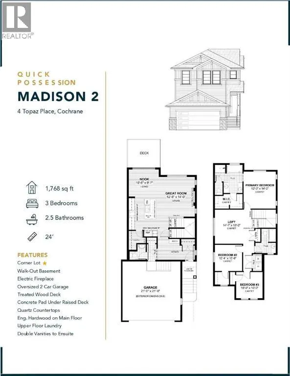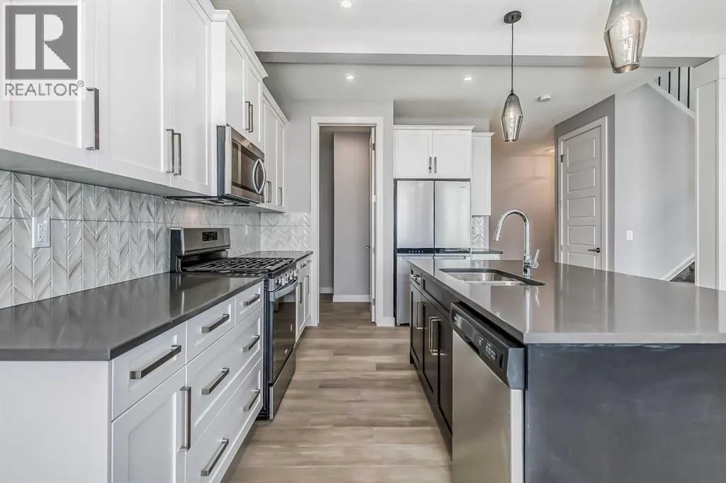BRAND NEW HOME by Douglas Homes, Master Builder in central Greystone, short walking distance to parks, the Bow River, major shopping & interconnected pathway system. Featuring the Madison 2 on a corner lot, south facing back yard, walkout basement, deck off the main floor accented by built out columns on an R-MX zoned lot for POTENTIAL future lower level suite. NOTE: a secondary suite would be subject to approval and permitting by the city/municipality. Located on a quiet street, very close two Children's Play Parks & paved back lane. This gorgeous 3 bedroom, 2 & 1/2 half bath home offers over 1760 sq ft of living space. Loads of upgraded features in this beautiful, open floor plan. The main floor greets you with a grand glazed 8' front door, soaring 9' ceilings, oversized windows , & 8' 0" passage doors. Distinctive Engineered Hardwood floors flow through the Foyer, Hall, Great Room, Kitchen & Nook adding a feeling of warmth & style. The Kitchen is completed with an oversized entertainment island (7'0" single level island) & breakfast bar, roomy closet pantry with 8'0" French Door , Quartz Countertops, 42" Cabinet Uppers accented drop bulkhead, Pots & Pans Drawers, soft close doors & drawers throughout, new stainless appliance package including Side by Side Fridge with Ice and Water, Gas Range, Chimney Hood Fan, Built-In Microwave in the island & Built-In Dishwasher. The main floor is completed with an expansive, open Great Room & Nook finished with over height windows & Napoleon "Entice" fireplace. Ascending the second floor there is a large "U" shaped staircase complimented by black metal spindle railing naturally light by a large window. Upstairs you'll find a generous Primary Bedroom with 5 piece Ensuite including dual, separate, Quartz vanities with undermounted sinks, oversized 4'0" x 3'0" shower, 6'0" soaker tub with large window above, private water closet, & ceramic tile flooring. There is also a generous sized walk-in closet accessed from the Ensuite. T he 2nd floor is completed by a spacious, centralized Family Loft & two additional, good size bedrooms, one with WIC. The 2nd & 3rd bedrooms have the convenient access to the main bath with Quartz countertop, undermounted sink & tile flooring. You're certain to love the convenience of the 2nd Laundry completed with large access doors, light & tile flooring. This is a very popular plan, great for young families or for the upsizing crowd. Spacious, Beautiful and Elegant! The perfect place for your perfect home. Call today! Photos are from prior build & are reflective of fit, finish & included features. Note: Front elevation of home & interior photos are for illustration purposes only. Actual elevation style, interior colors/finishes, & upgrades may be different than shown & the Seller is under no obligation to provide them as such. Directions: Come to the Show Home first at 500 River Avenue. THIS HOME IS UNDER CONSTRUCTION. (id:27476)