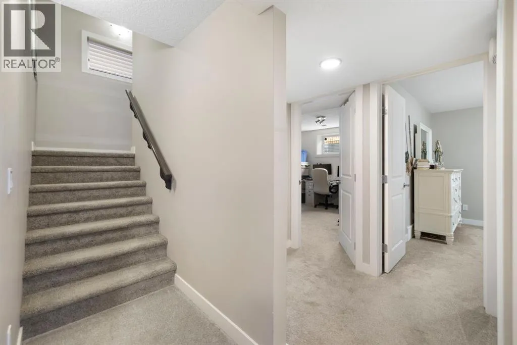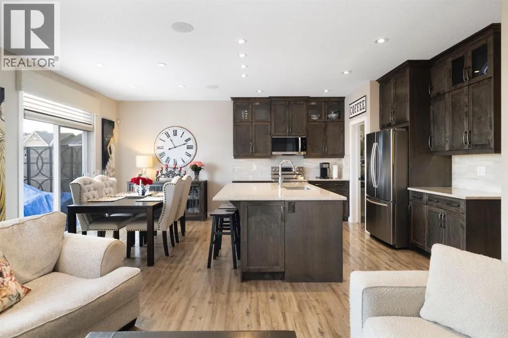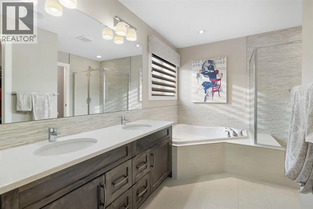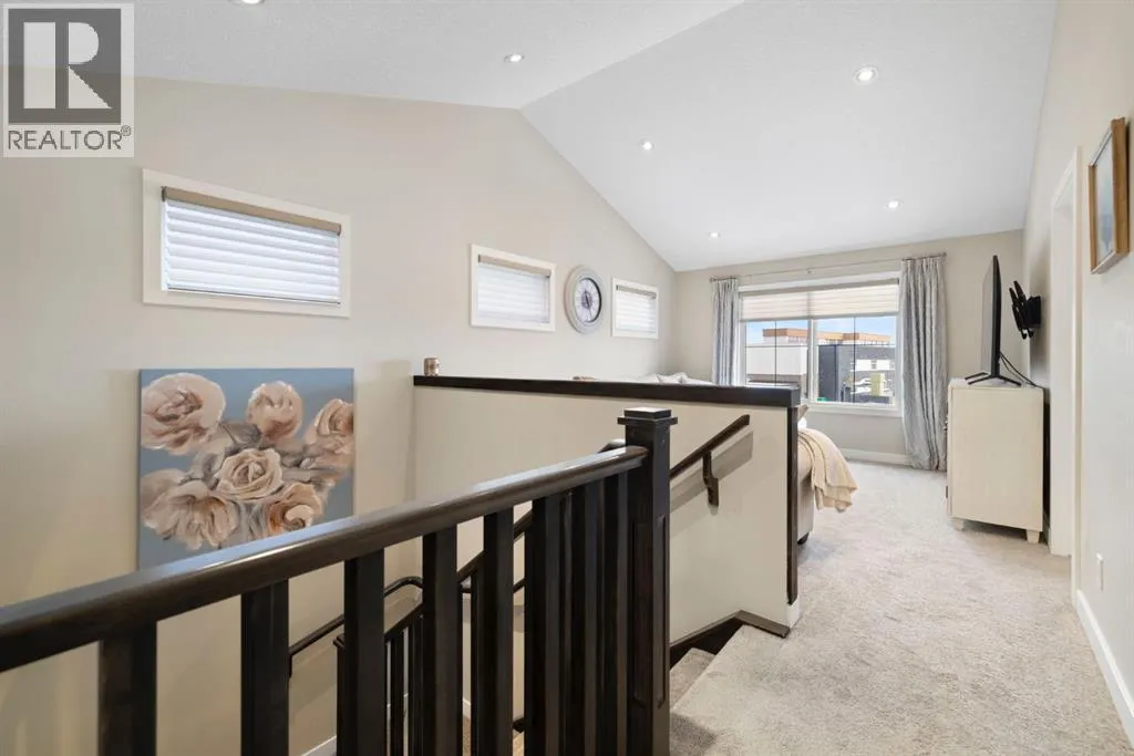 Welcome to 8 Emberside Glen! This beautifully finished two-storey former show home offers style, functionality, and an unbeatable family-friendly location backing directly onto the Holy Spirit Catholic School grounds. Stepping inside you are greeted by a spacious front entry and striking open-riser staircase that anchors the main level. The open-concept layout features durable hardwood flooring and a warm, inviting living room centered around a stone-surround gas fireplace with rich wood mantle. Some of the upgrades include a built in speaker system outfitted across the main level, upgraded tile backsplashes, and Hunter Douglas blinds adorning the windows throughout the home. The kitchen is a true standout â showcasing ceiling-height cabinetry complete with display windows, quartz countertops, stainless steel appliances, tile backsplash, and a large central island. A walk-through pantry provides exceptional storage and connects conveniently to the double attached garage Upstairs, youâll find a bright vaulted bonus room ideal for relaxing or family movie nights. The primary suite offers a walk-in closet and a well-appointed ensuite complete with dual vanity, a corner soaker tub, and separate glass shower. Two additional bedrooms each with their own walk-in closets and a full bathroom complete the upper level. The fully finished basement adds even more living space with a recreation room, an additional bedroom, office, full bathroom, and generous storage. The backyard is designed for both privacy and enjoyment, featuring a spacious upper deck with stairs leading down to a fully fenced yard with in-ground sprinkler system and private lower patio with hot tub. Backing directly onto the school means no rear neighbours and convenient access to playgrounds and green space. Close to parks, pathways, shopping, and everyday amenities â this move-in-ready home checks all the boxes for growing families. (id:27476)