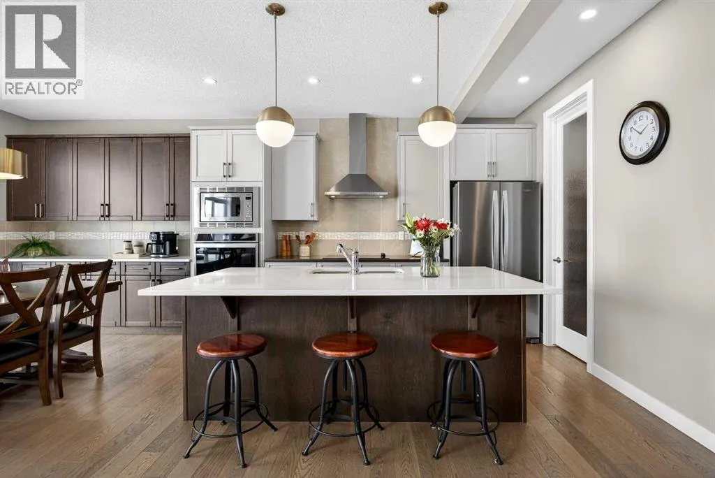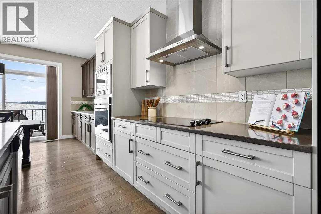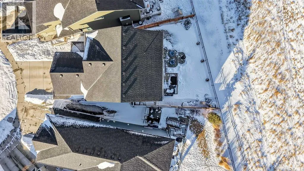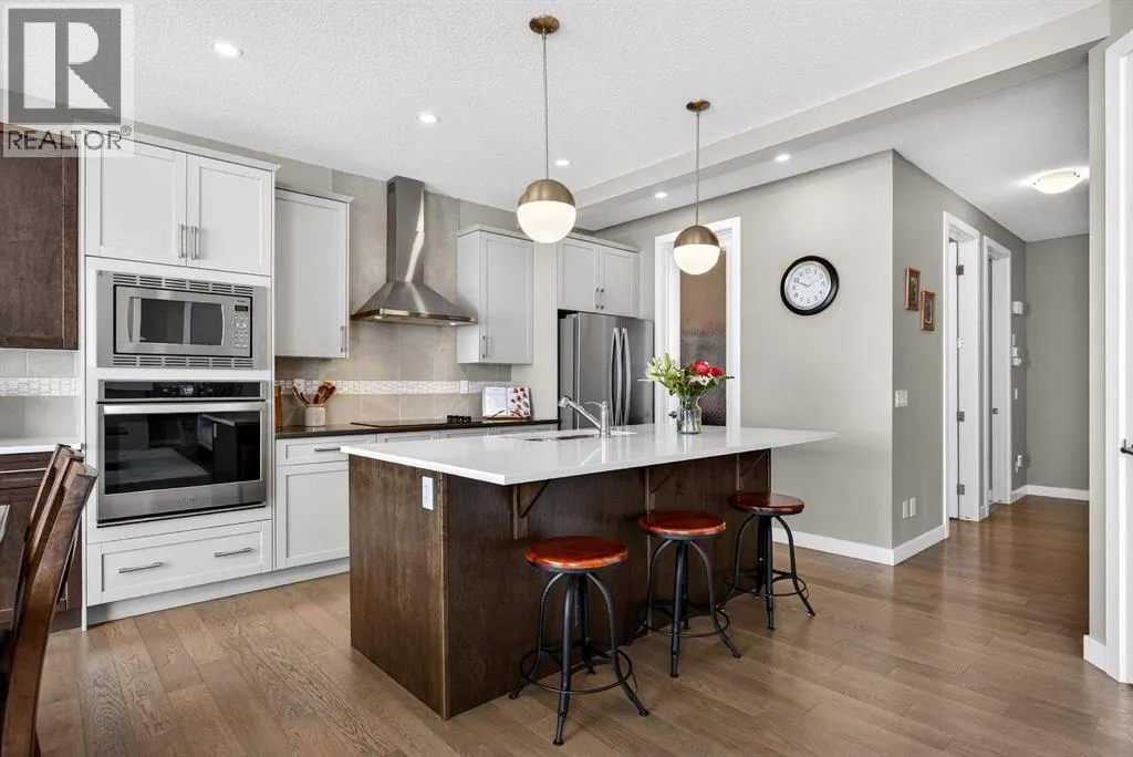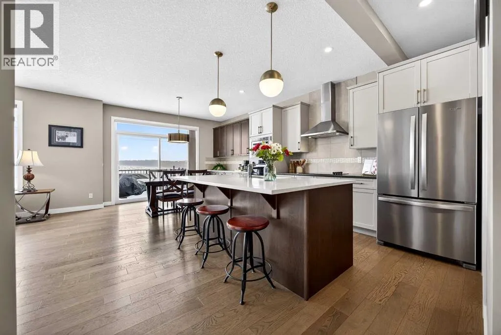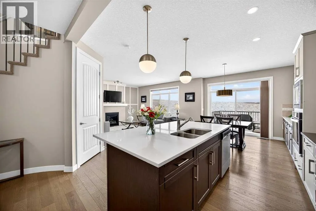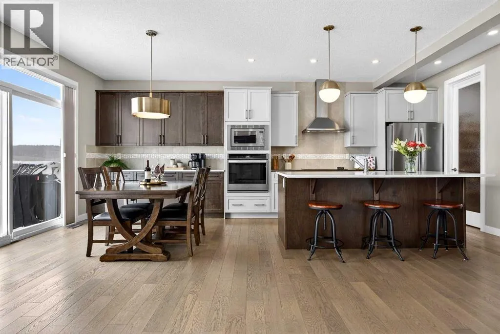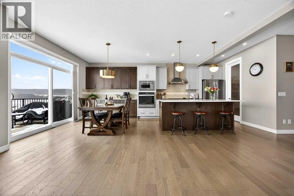 Welcome to the best value in Sunset Ridge! As you step into this beautiful home, youâre welcomed by gleaming hardwood floors and an abundance of natural light. The open-concept floor plan is perfect for entertaining and extends seamlessly to an east-facing balcony and a fenced, irrigated backyard that backs onto expansive green spaceâoffering the privacy of no rear neighbours. The main floor features a private den with glass French doors, ideal for working from home. The chef-inspired kitchen showcases a large island with quartz countertops and bar seating, a stainless steel French-door refrigerator, and built-in microwave and oven. Extended cabinetry into the dining area provides exceptional storage, while the convenient walkthrough pantry connects the mudroom directly to the kitchen. The inviting living room features a cozy gas-burning fireplace, and a two-piece powder room completes the main level. Up the elegant curved staircase with wrought-iron spindles, is the primary bedroom This retreat offers a luxurious five-piece ensuite with dual sinks and a stand-alone soaker tub, along with a walk-through closet that leads directly to the laundry room for ultimate convenience. Two additional bedrooms, a generous bonus room and a four-piece bathroom complete the upper floor. The fully finished walkout basement is designed for entertaining, featuring two additional bedrooms, a four-piece bathroom, and beautiful views of the backyard and surrounding green space. Additional highlights include a double attached garage and central air conditioning. Ideally situated close to schools, parks, scenic walking trails, and shopping, this exceptional home combines comfort, style, and an unbeatable location. (id:27476)