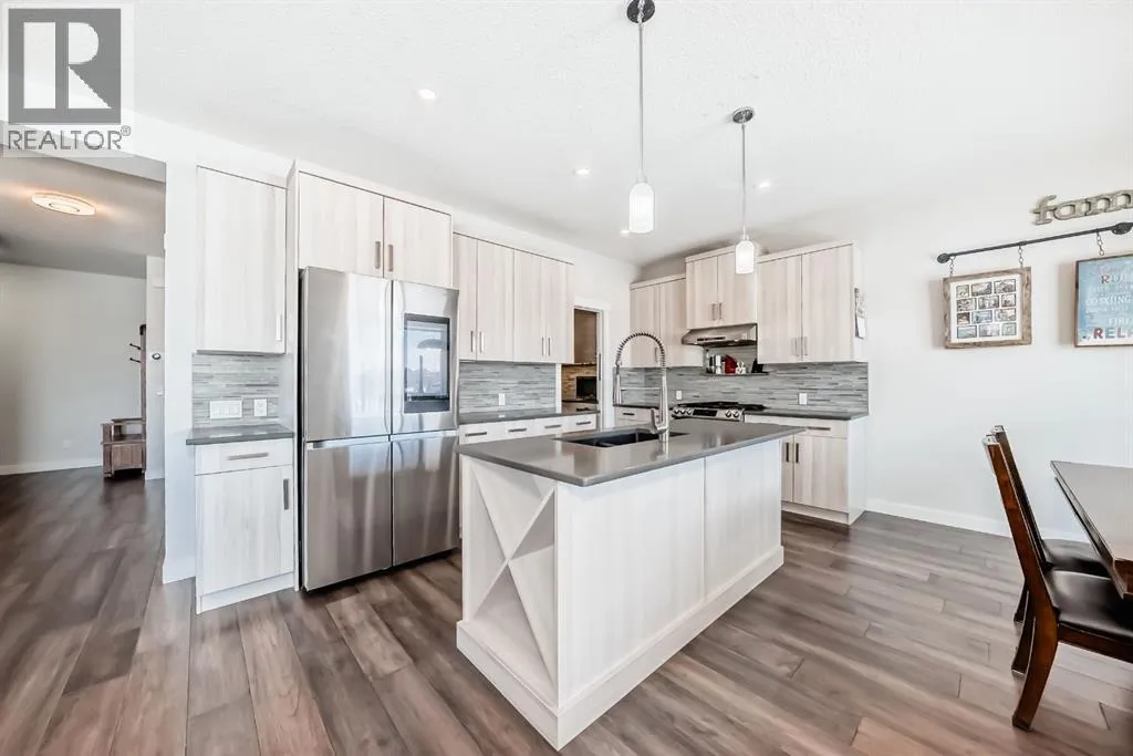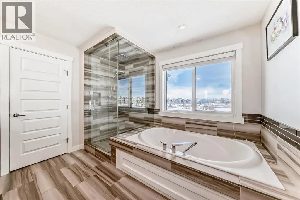 Welcome to this exceptional two-storey walkout home in the sought after community of Sunset Ridge in Cochrane, offering over 3000 sq. ft. of developed living space and panoramic mountain views that perfectly balances natures beauty and everyday living. From the moment you enter, youâre welcomed by a bright, open layout featuring a dedicated main floor office, ideal for working from home. The stunning kitchen is the heart of the home, showcasing quartz countertops and stainless steel appliances that were updated just one year ago including a gas range with hood fan and a large walk through butlers pantry with plenty of built in custom storage and a coffee bar. The double attached garage is fully finished, heated with appoxy flooring and storage space for all your tools and toys. The kitchen area seamlessly flows into the sun filled dining and living area with cozy gas fireplace with stacked stone surround and built in shelving framed by expansive triple pain windows with breathtaking MOUNTAIN VIEWS. Step out onto the full length upper deck with a convenient gas line for your BBQ and take in the peaceful setting backing onto scenic walking paths and the beautiful Sunset Ridge pond. Upstairs, a spacious bonus room offers the perfect spot for movie nights or a kidsâ retreat, while the primary suite provides a luxurious escape with panoramic mountain views, a spa inspired 5 piece ensuite, soaker tub, dual vanities, and a generous walk in shower with rainfall shower head. Two additional large bedrooms and a generous sized full bathroom complete the upper level. The fully finished walkout basement is designed for entertaining, featuring a large family room, wet bar, gas fireplace, fourth bedroom, and a 3 piece bathroom, ideal for guests or extended family. Outside, over $120,000 has been invested in creating a backyard oasis, highlighted by a fully enclosed, year-round swim spa with electric blinds for privacy and incredible cedar deck and pergola. (swim spa has been addi tionally insulated on all sides for efficiency). The swim spa area also features LED lighting, projector and screen so you can watch your favourite shows or the game while relaxing. A truly one of a kind backyard making you feel like you are on vacation every day! Sunset Ridge is known for its active, family friendly lifestyle, offering over 5 km of scenic pathways, parks, playgrounds, a central park, a 6 acre freshwater pond, and access to excellent nearby schools including walking distance to RancheView School(Kâ8) and St. Timothy's High School. With its premium location, incredible views, and impressive upgrades, this home truly has it all, an outstanding opportunity in one of Cochraneâs most desirable communities and locations. Book a showing today! (id:27476)
