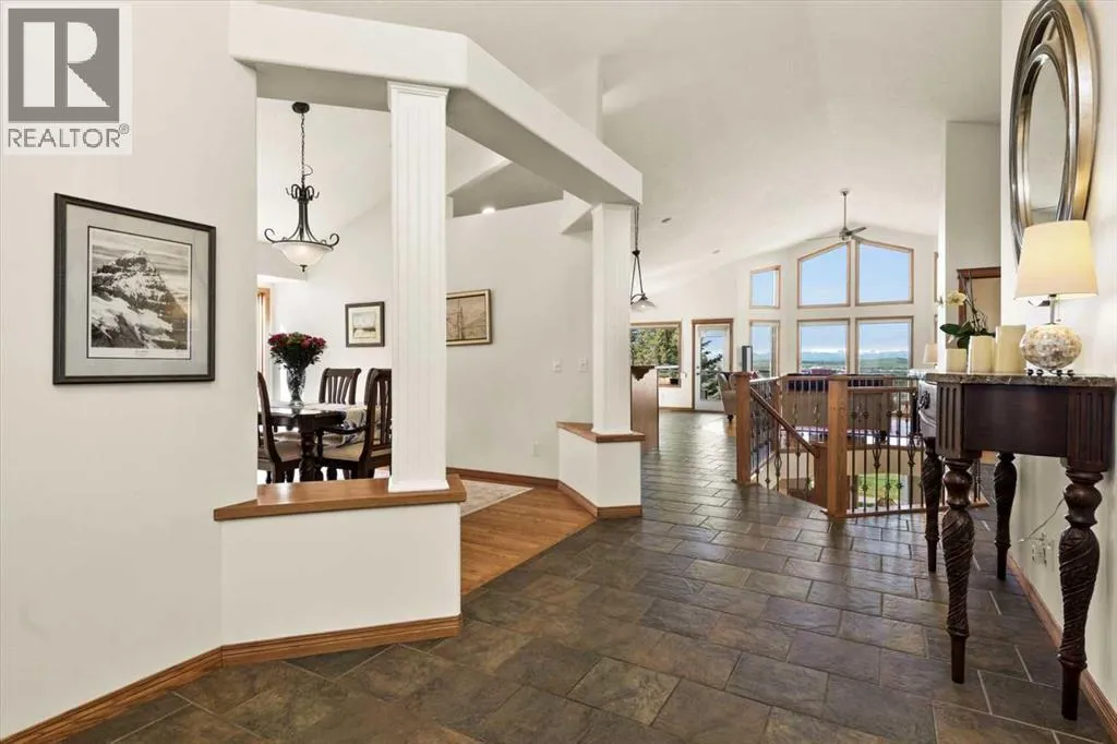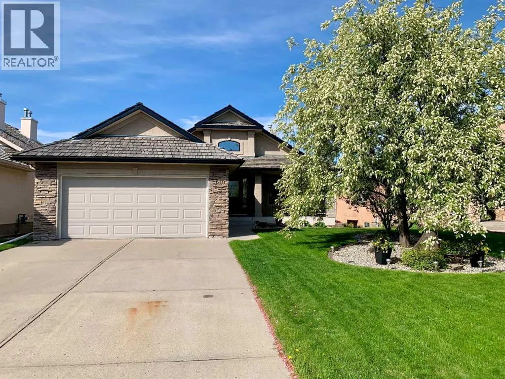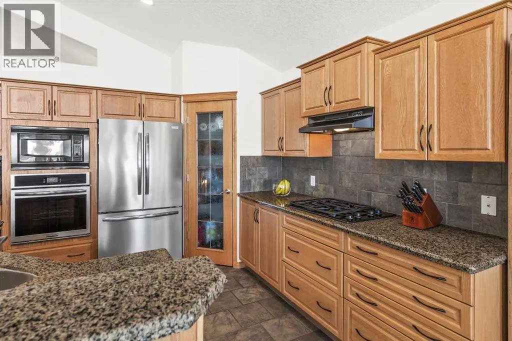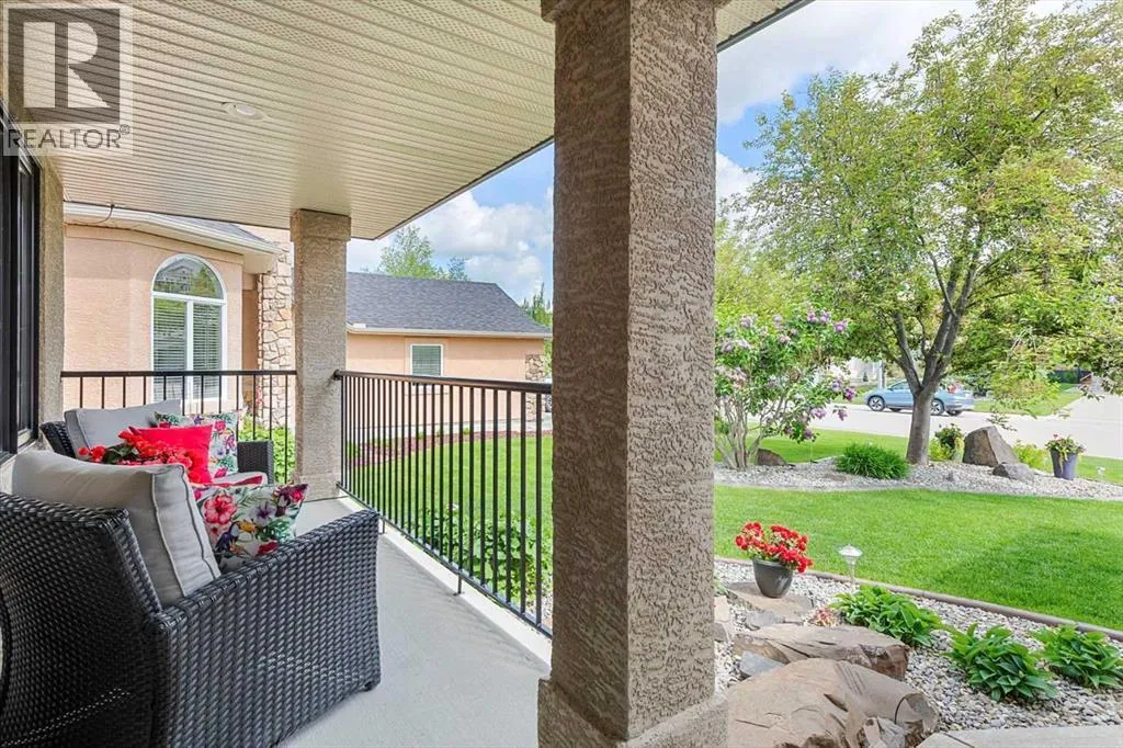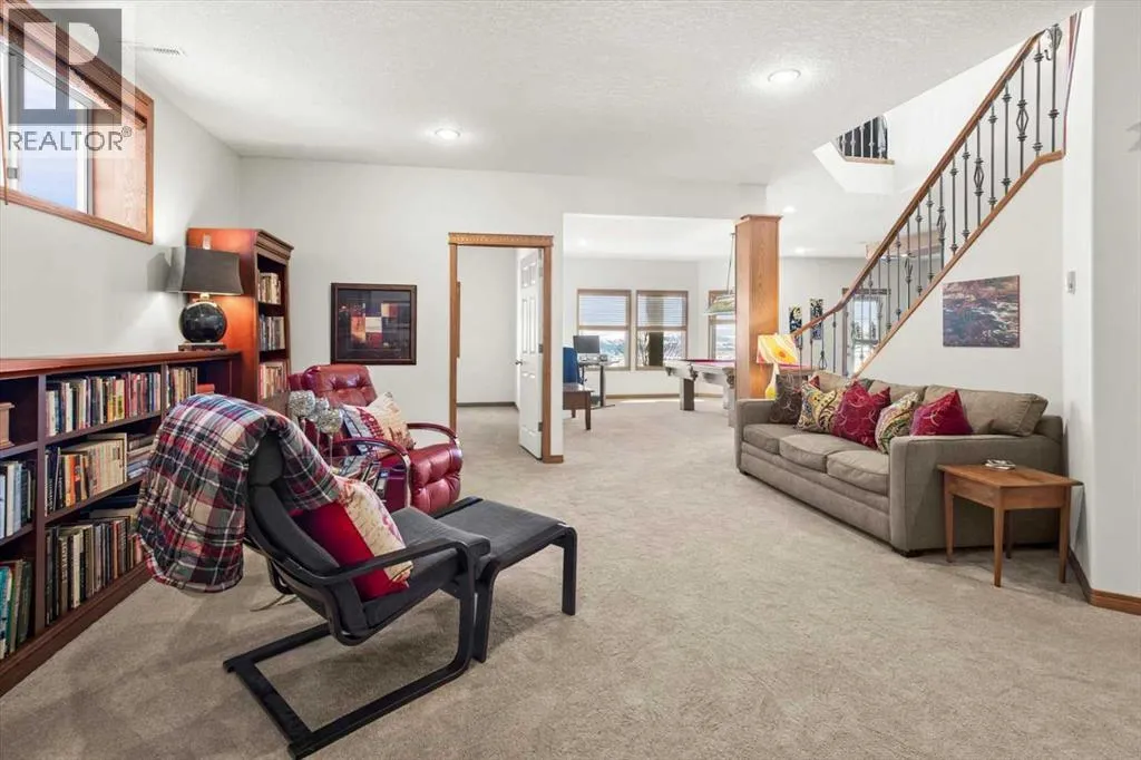 Perched in a prime southwest facing location, this traditionally designed executive walkout bungalow offers unparalleled views of the surrounding mountains and valleys, with no obstructions to spoil the scenic beauty. Impeccably maintained and boasting 1,713 square feet of living space, this home blends classic charm with modern comforts, making it an ideal retreat for both relaxation and entertainment.The spacious entry flows into the open-concept main floor and features a light, neutral interior that enhances the spacious feel of the home. Off the entry is a separate home office or den with French doors for privacy. Opposite the office is the main floor laundry and mud room with lots of storage space and access to the oversized double car garage. The elegant, formal dining room is a perfect location for hosting small or large gatherings. Floor to ceiling windows and soaring high ceilings flood the space with natural light, creating an inviting and airy ambiance. A central fireplace in the living room offers warmth and coziness, perfect for cooler evenings. Sliding doors lead out to a deck, where you can enjoy the stunning views while sipping your morning coffee or hosting gatherings. The chef-inspired kitchen is outfitted with high-end stainless steel appliances, granite countertops, and a large island for additional workspace. New refrigerator, oven, washer and dryer this year and dishwasher 2024. A walk-in pantry provides ample storage, while the adjacent dining area flows effortlessly into the living room, making it perfect for both intimate dinners and entertaining larger groups.The master suite, conveniently located on the main floor, is a true sanctuary. It features a luxurious 5-piece ensuite bath and offers easy access to the main living areas. The walkout lower level is an entertainerâs dream, with in-floor heating and a media room complete with theater seating for an immersive viewing experience. A games room with a full bar and pool table is id eal for hosting friends, while the custom library offers a quiet spot for reading or relaxation. Two additional bedrooms are located on the lower level, along with a spacious 3-piece bath. The lower level also opens onto a patio, offering seamless access to the beautifully landscaped yard with a terraced garden and full irrigation system. For added comfort, the home is equipped with central air conditioning and surround sound throughout, ensuring the perfect atmosphere year-round. Whether you're enjoying a cozy evening by the fire, hosting a game night, or unwinding on the deck with a glass of wine, this home offers an exceptional lifestyle. (id:27476)