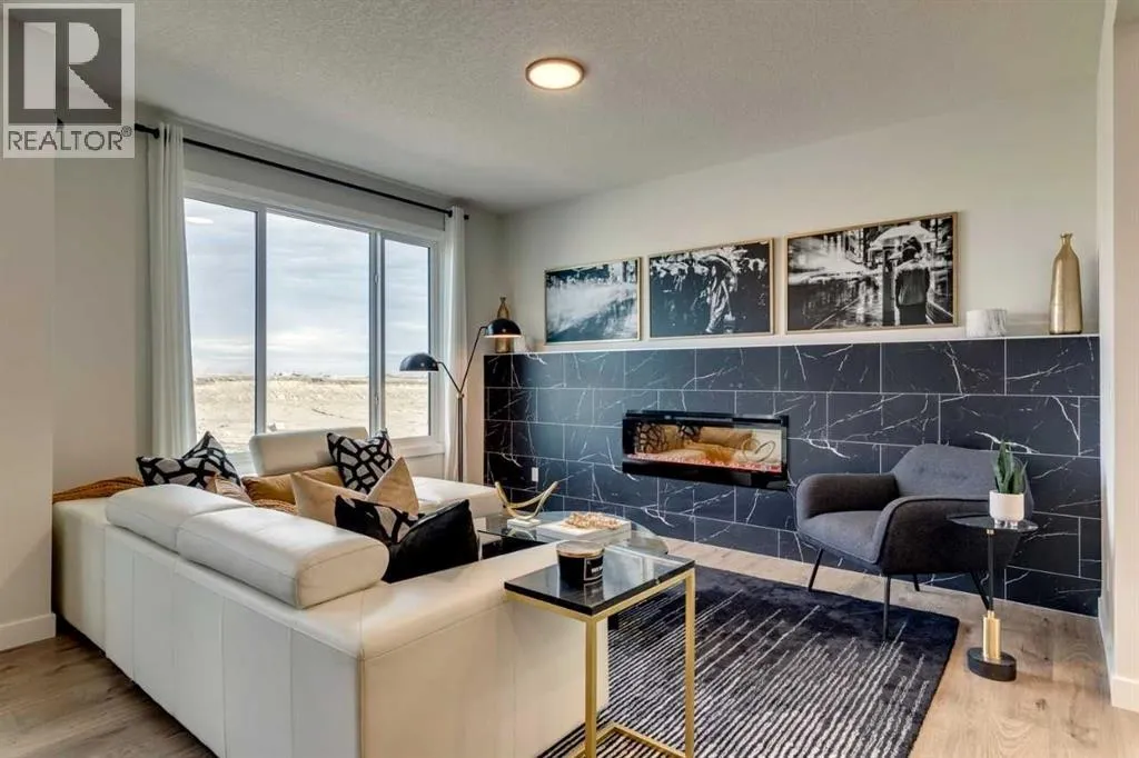 Welcome to the Hogan 4 by Sterling Homes Calgary! Built by a trusted builder with over 70 years of experience, this home showcases on-trend, designer-curated interior selections tailored for a home that feels personalized to you. Energy efficient and smart home features, plus moving concierge services included in each home.This 2025 walkout home features a 5-piece ensuite with pocket door, soaker tub with tiled skirt, and fiberglass base shower with tiled walls, niche, and barn-style glass door, plus a bank of drawers and LVP flooring in the ensuite, upper bath, and laundry. The executive kitchen offers a chimney hoodfan, built-in microwave tower, waterline to fridge, pots and pan drawers, waterfall granite edge island with dishwasher, and walk-through pantry with broom closet. Enjoy a 9' basement wall, rear deck with BBQ gas line rough-in, electric fireplace with tile capped ledge, paint grade railing with iron spindles, and additional windows throughout. This energy-efficient home is Built Green certified and includes triple-pane windows, a high-efficiency furnace, and a solar chase for a solar-ready setup. With blower door testing, plus an electric car charger rough-in, itâs designed for sustainable, future-forward living. Featuring a full range of smart home technology, this home includes a programmable thermostat, ring camera doorbell, smart front door lock, smart and motion-activated switchesâall seamlessly controlled via an Amazon Alexa touchscreen hub. Photos are a representative. (id:27476)