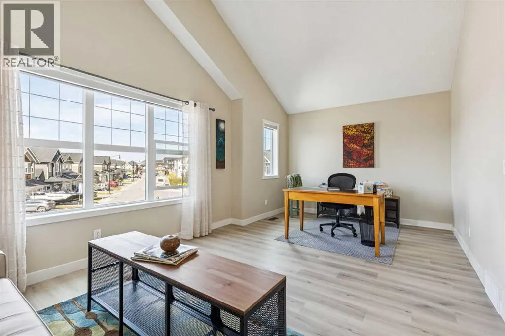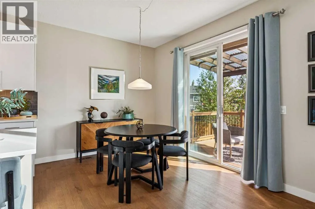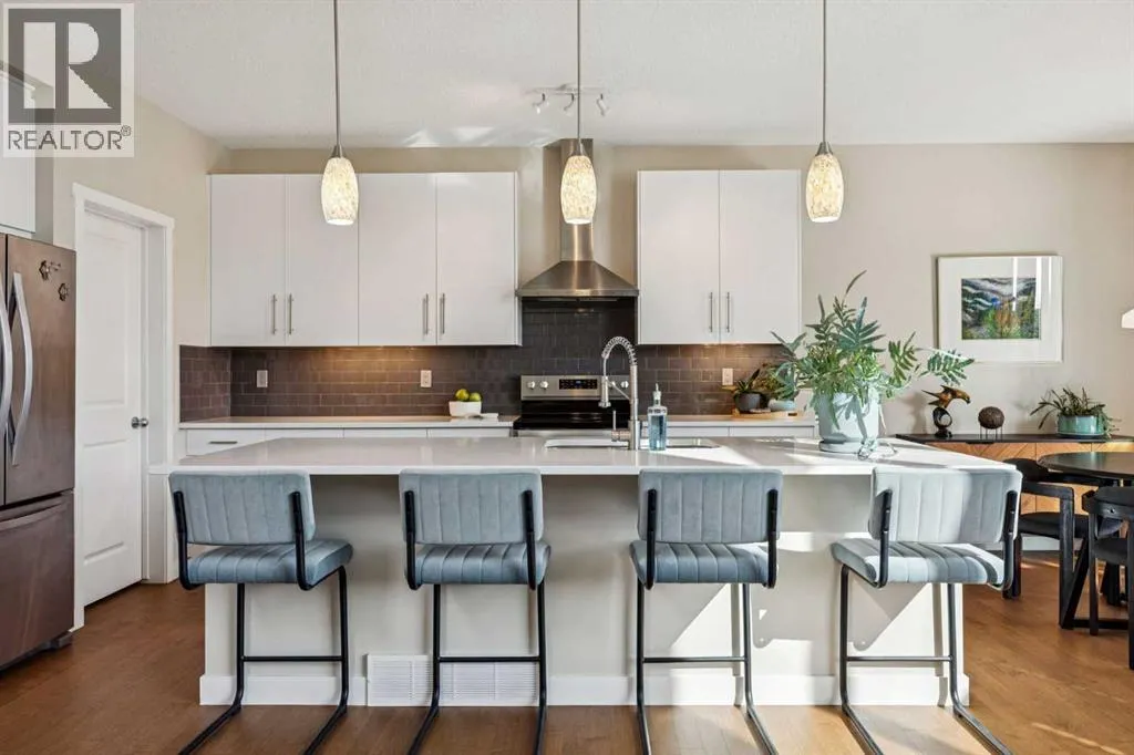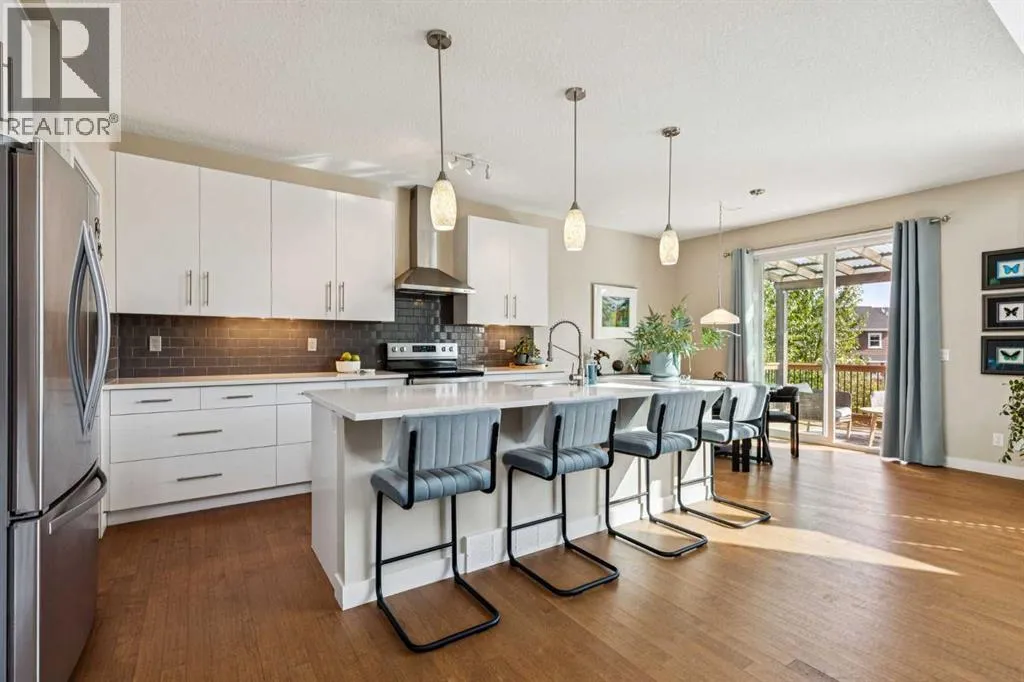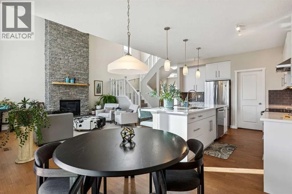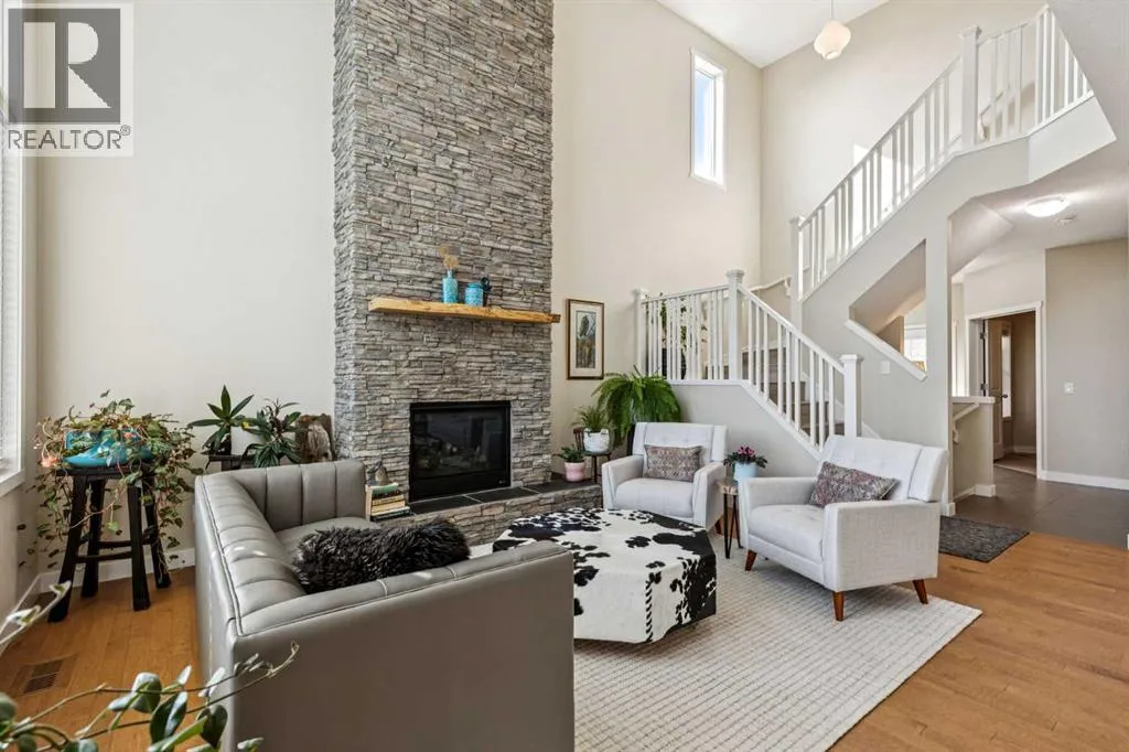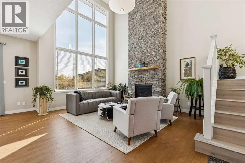 This beautifully updated two-storey with a fully developed basement offers over 3,000 sq ft of living space and an exceptional lifestyle. Perfectly situated on a spacious pie-shaped lot backing onto an alley, the property stands out with refreshed landscaping, raised garden beds framed in black iron, flourishing perennials, and a treated wood two-tier deck overlooking the yard. Patio doors open to the deck and are equipped with a retractable screen, allowing fresh air to flow through the home during warmer months. With plenty of space for summer BBQs, gardening, or even the potential for RV parking, the backyard is built for entertaining and family fun. Step inside and you are welcomed by a bright and inviting layout with 9-foot ceilings, hardwood, luxury vinyl plank, tile flooring, upgraded lighting, and thoughtful finishes throughout. The show-stopping great room boasts 18-foot ceilings, large windows that flood the space with natural light, and a dramatic gas fireplace surrounded by a wall of floor-to-ceiling stone. The chefâs kitchen offers sleek cabinetry, stainless steel appliances, a large central island, modern fixtures, and a walkthrough pantry conveniently connected to the mudroom and laundry. The open flow into the dining area makes this level ideal for both casual family meals and formal entertaining. A private office/den with French doors provides the perfect spot for working from home, and a stylish two-piece bath completes the main floor. Upstairs, youâll find three spacious bedrooms including a primary suite with mountain views, a large walk-in closet, and a spa-inspired 5-piece ensuite with dual sinks, a soaker tub, and a separate shower. A bonus room with vaulted ceilings offers the perfect gathering place for family movie nights, a playroom, or simply a quiet retreat. A full 4-piece bathroom completes the upper level. The fully developed basement extends your living space with endless possibilities, featuring a spacious fourth bedroom and a 4-piec e bathroom with tub/shower combination, making it ideal for guests, teens, or extended family. The remainder of the basement offers flexible space for a home gym, recreation area, or media room, along with generous storage. Additional highlights include LVP flooring on all three levels, gas stove hookup, custom blinds, a heated garage, upgraded interior and exterior lighting, a 75-gallon hot water tank, and a beautifully maintained exterior with a stained fence and deck. This move-in ready home combines style, comfort, and practicality in a highly sought-after community, an ideal fit for families looking to enjoy both space and modern upgrades. (id:27476)