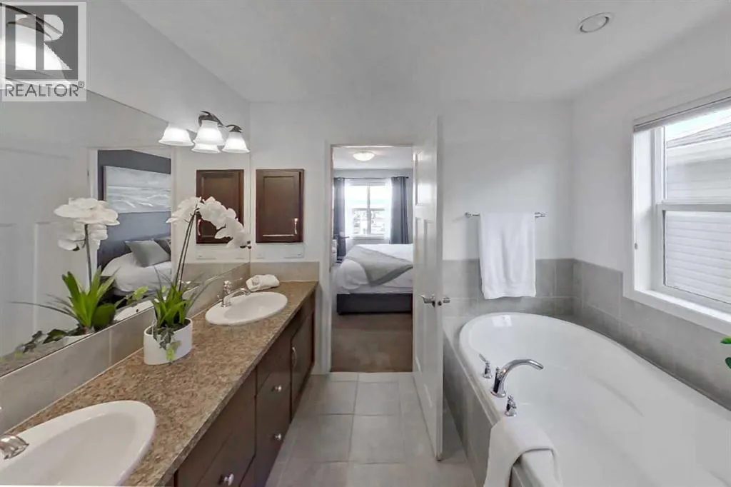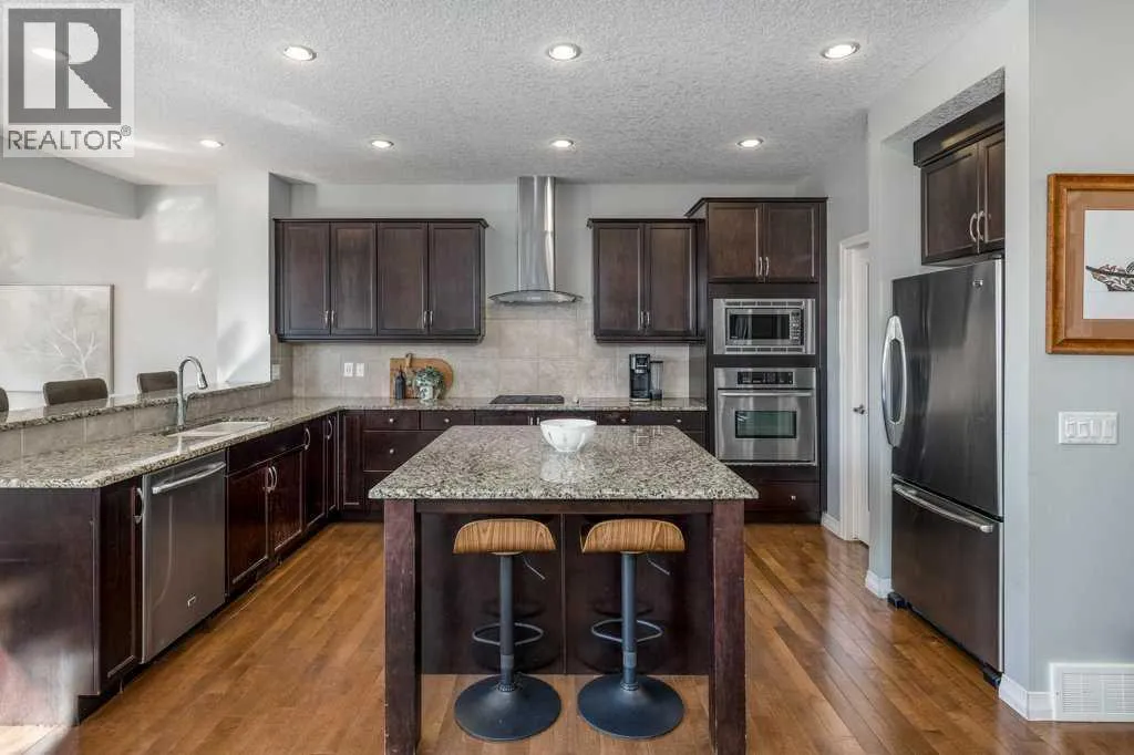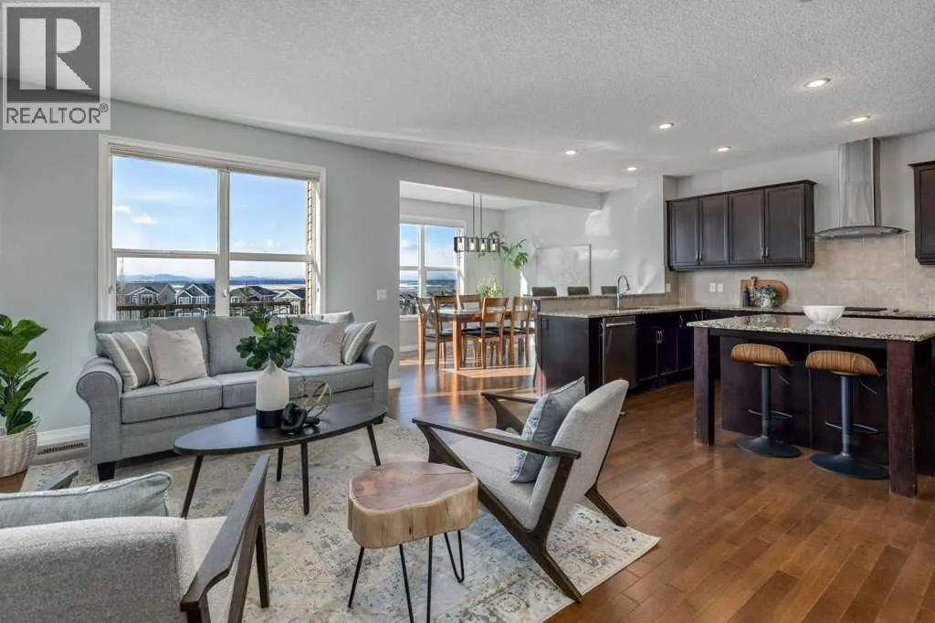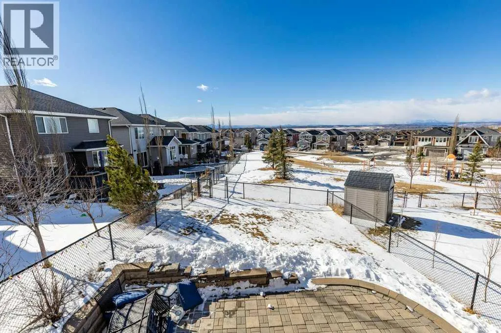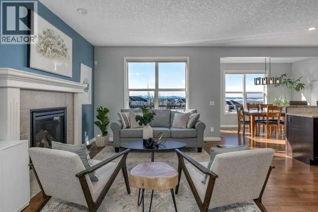 {Open House Saturday April 4 1-3pm} BEAUTY BACKED BY EFFICIENCY || MOUNTAIN VIEWS + SOLAR POWERED LIVING. Welcome to this exceptional walkout home in the highly sought-after community of Sunset Ridge in Cochrane, offering breathtaking mountain views from all three levels and backing directly onto a parkâan ideal setting for families who value space, serenity, and community. From the moment you arrive, the expansive views set the tone for this special property. Inside, a large foyer with ceramic tile welcomes you and leads into a bright open-concept main floor featuring warm hardwood flooring throughout the kitchen, dining, and living areas. Designed for both everyday living and entertaining, the spacious kitchen offers abundant cabinetry, a large island, and raised breakfast bar seating. The dining area opens onto the back deck where you can soak in the panoramic mountain vistas, watch the kids play in the park behind, or enjoy grilling with friends using the natural gas BBQ hookup. The inviting living room features a gas fireplace, creating a warm and comfortable gathering space while taking in the spectacular views. Upstairs, the home continues to impress with a thoughtfully designed layout. The upper level includes three bedrooms, a huge bonus room with soaring 10-foot ceilings, a convenient laundry room, and a dedicated tech desk with two workspacesâperfect for homework, remote work, or family organization. The primary suite is a true retreat, featuring breathtaking mountain views, ample space for a king-sized bed, and a practical five-piece ensuite bathroom that leads to your walk-in closet.The fully developed walkout basement provides additional living space and flexibility with vinyl plank flooring throughout. This level includes a fourth bedroom, a full bathroom, office or flex space (a rough-in behind the wall allows for easy future installation of a bar or craft sink), and a bright recreation room with endless possibilities. Step outside to the beautiful ly finished lower patio with paver stones and rough-in wiring for a future hot tub. The yard is generously sized and opens directly toward the park, enhancing the sense of space and enjoyment of your outdoor living area. This home also offers thoughtful upgrades for comfort and efficiency, including a Zeno solar panel system to help reduce energy costs and environmental impact. The system includes a microgeneration permit, allowing the homeowner to sell excess electricity back to the utility grid. A radon mitigation system is also installed to help reduce indoor radon levels. A double attached garage and extra-deep driveway provide ample parking and convenient space for larger vehicles or loading up before a weekend of camping. Sunset Ridge is one of Cochraneâs most desirable family communities, known for its scenic pathways, parks, and mountain views. (id:27476)