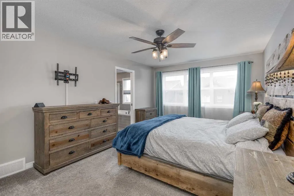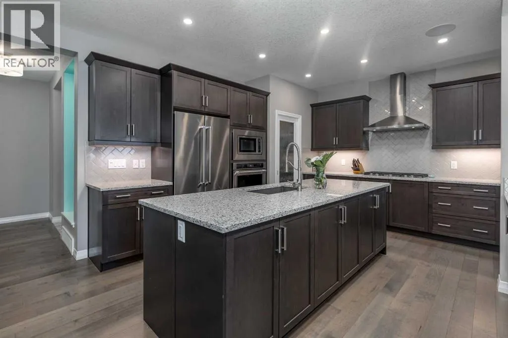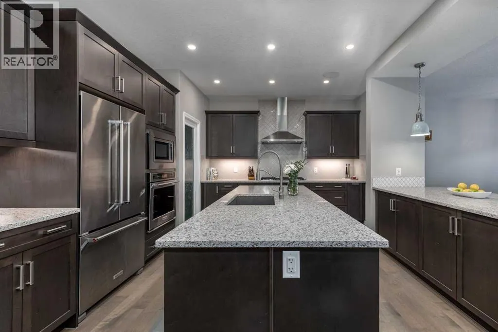 Steps from the Bow River Pathway System and surrounded by green space, this beautifully developed Riviera home offers a rare combination of privacy, nature, and space. Tucked into one of Cochraneâs most peaceful pockets in the community of River Song, this sought-after neighbourhood is known for its scenic walking trails, abundant wildlife, and quiet streets while remaining just minutes from schools, parks, shopping, and everyday amenities.Built in 2018 and offering over 3,600 sq ft of developed living space, this spacious home features 6 Bedrooms and 4 Bathrooms, creating an ideal layout for growing families, guests, or multiple Home Offices.A welcoming Foyer opens into the bright and open Great Room, where oversized windows flood the Main Floor with natural light. The chef-inspired Kitchen is thoughtfully designed for both everyday living and entertaining, featuring KitchenAid Chef Series Appliances, including a Gas Cooktop, Built-In Oven, Hood Fan, and Dishwasher. Dual Islands provide exceptional prep space, storage, and seating, making this Kitchen the natural gathering place for family and friends.The Dining Area flows into the inviting Living Room, where a cozy Gas Fireplace creates the perfect setting for quiet evenings or larger gatherings. Built-In Speakers throughout the home, along with Outdoor Speakers on the deck, enhance the atmosphere for entertaining.Step outside to the impressive 20â x 18â Composite Deck, overlooking the treed backyard that provides privacy and a peaceful outdoor setting. Designed for relaxing evenings and summer gatherings, the deck is also wired for a future Hot Tub.Upstairs, the Primary Bedroom offers a spacious retreat with room for a King-sized bed and seating area. The spa-inspired Ensuite features Dual Vanities, a Makeup Counter, Large Soaker Tub, Stand-Up Shower, and two generous Walk-In Closets.A centrally located Bonus Room provides the perfect space for movie nights or a family lounge. Two additional Bedrooms, a Full Bathroom, and convenient Upper-Level Laundry complete the second floor.The Fully Developed Basement expands the home to six Bedrooms, adding three additional Bedrooms and a Full Bathroomâperfect for larger families, teenagers, guests, or flexible space such as a Gym, Office, or Hobby Room. Basement bedroom windows were replaced in 2025 with Triple-Pane Units, improving comfort and efficiency.Additional highlights include Central Air Conditioning installed in 2024, Tankless Hot Water, Built-In Sound System, Permanent Soffit Lighting, durable James Hardie Fiber-Cement Siding, and an Oversized Double Attached Garage with Epoxy-Coated Floors.Enjoy Rivieraâs pathway lifestyle while living just minutes from schools, shopping, and Cochraneâs vibrant downtown. (id:27476)