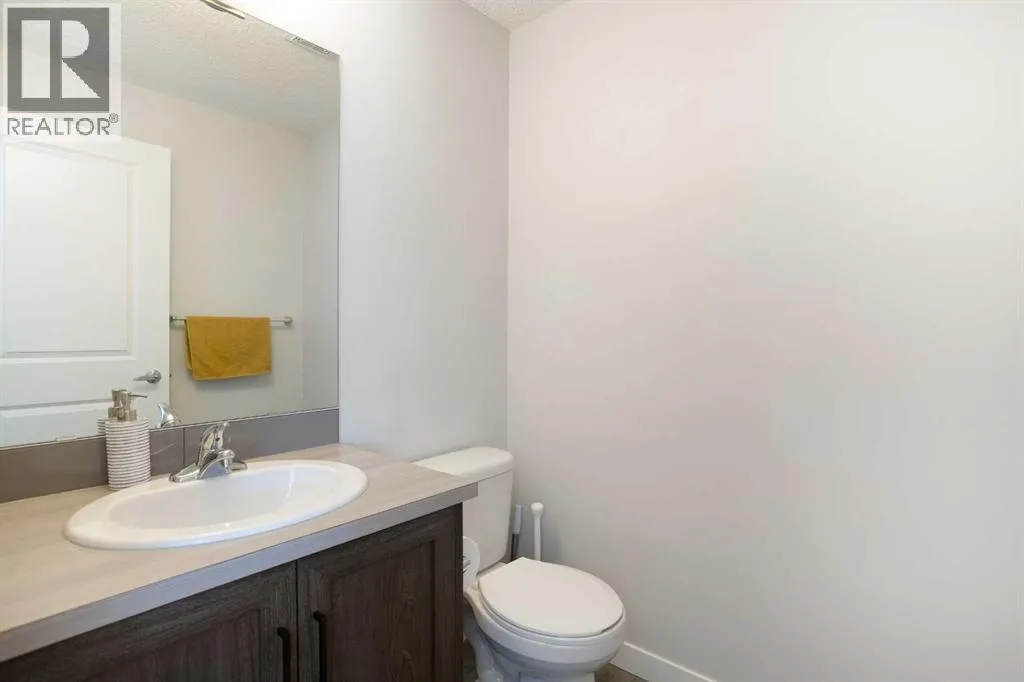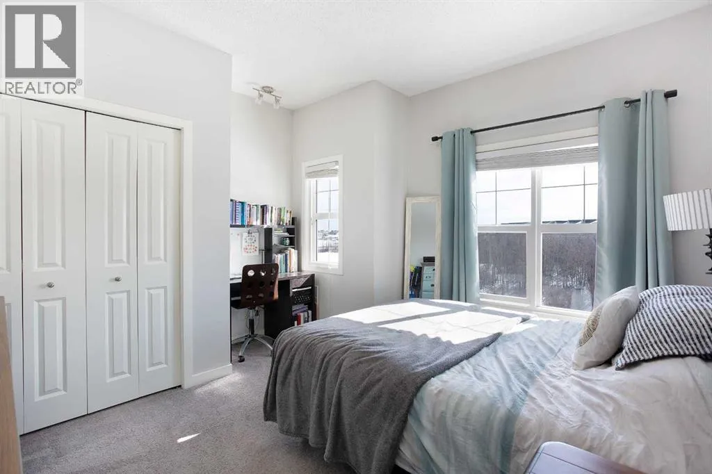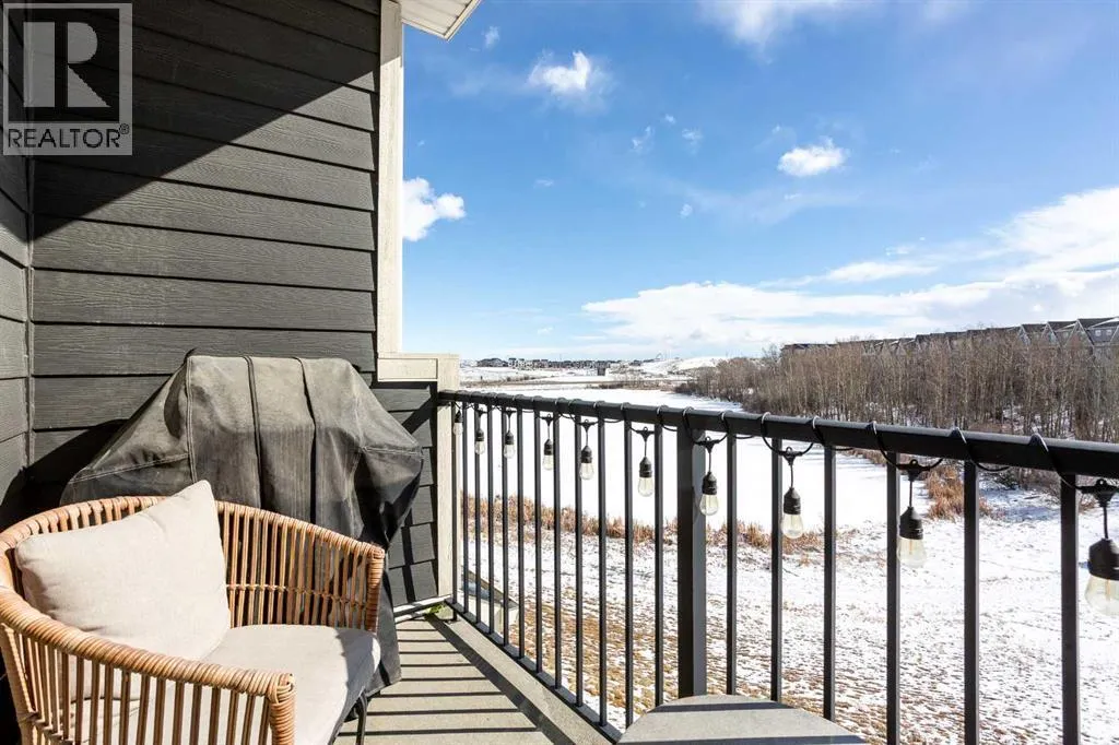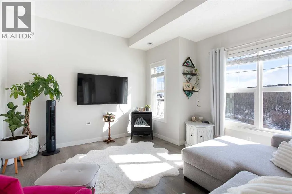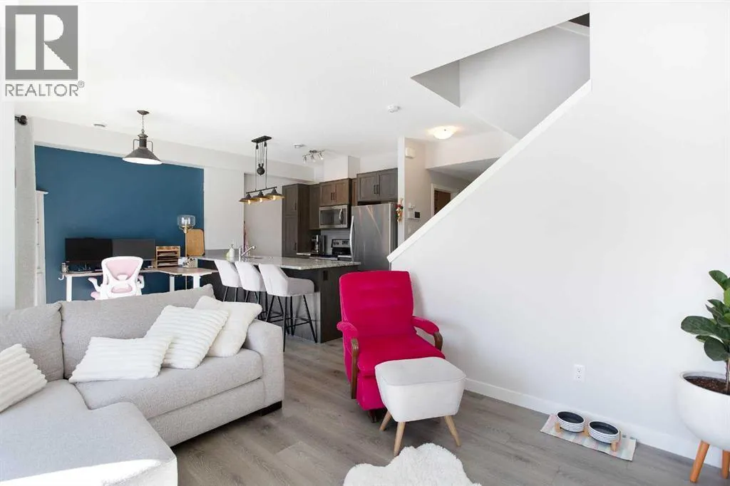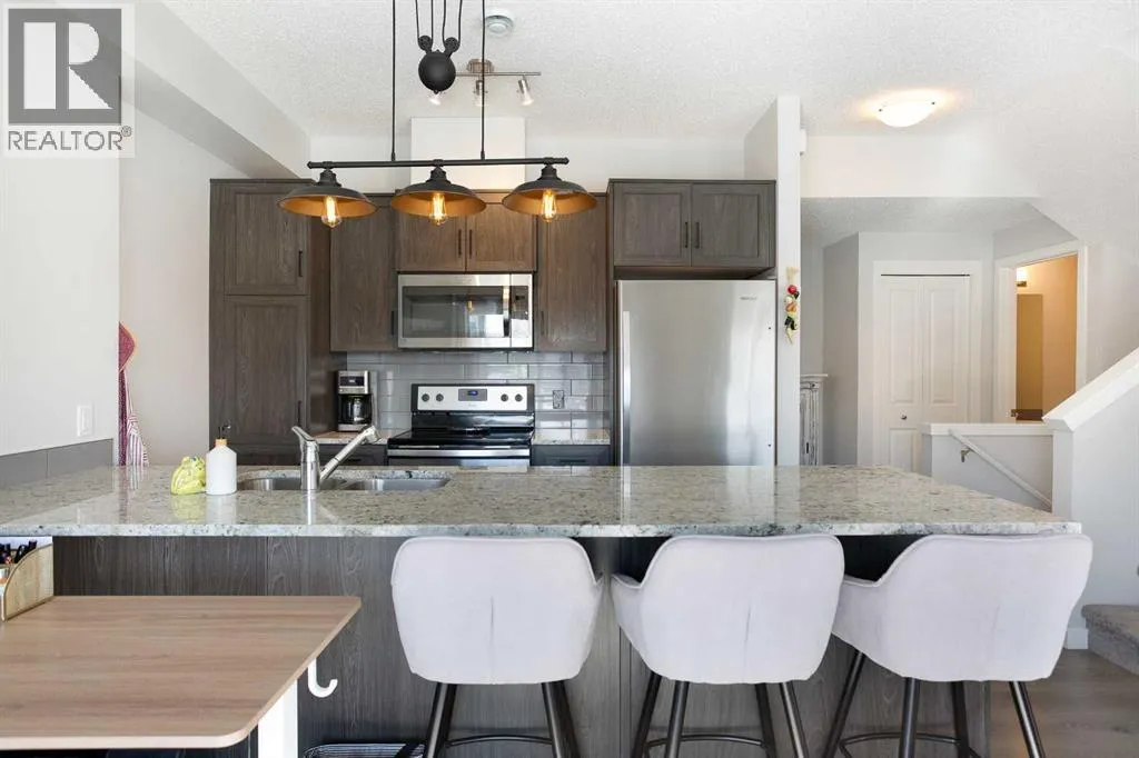 Enjoy breathtaking pond and wetland views from this like-new 2-storey townhome offering over 1,000 sq ft of bright, modern living space. Tucked away at the quiet back of the complex, this beautifully finished home combines peaceful surroundings with convenient access to everyday amenities.Step inside through your private entrance to an open and thoughtfully designed floor plan featuring gorgeous laminate flooring, upgraded lighting, and large windows that fill the home with natural light.The stylish U-shaped kitchen is perfect for entertaining with granite countertops, subway tile backsplash, stainless steel appliances including an upgraded full-size fridge, and an oversized island with flush eating bar. The kitchen flows seamlessly into the spacious dining and living areas, creating a warm and inviting space to gather.Patio doors off the dining area lead to a generous balcony overlooking the serene pond and surrounding wetlandsâan ideal place to enjoy morning coffee or evening sunsets.Upstairs offers two spacious bedrooms, including a primary retreat with its own private balcony, plus a full bathroom and convenient upper-floor laundry with a washer and dryer.Additional features include titled parking, dedicated storage, visitor parking, and low condo fees, making this home ideal for low-maintenance living.Located just minutes from local amenities with quick highway access for easy in-and-out of town, this home is perfectly position for both convenience and adventure-only about an hour's drive to Canmore, and within easy reach of Calgary, Ghost Lake, and the breathtaking Rocky Mountains. Move-in ready and beautifully maintained â this one is not to be missed. (id:27476)