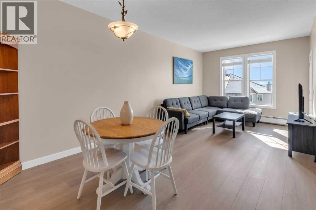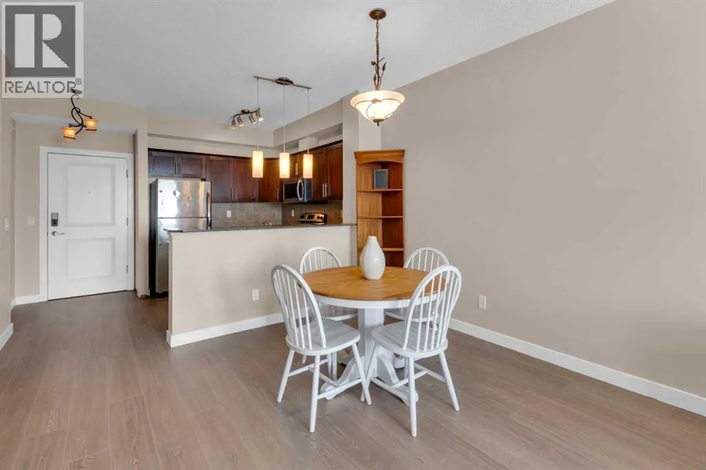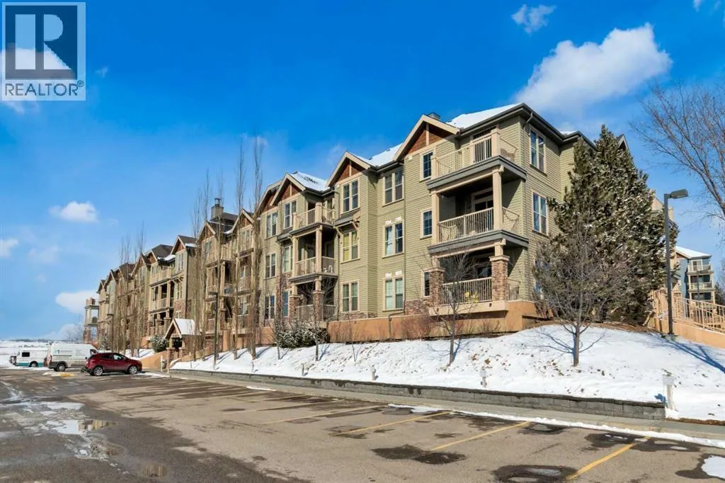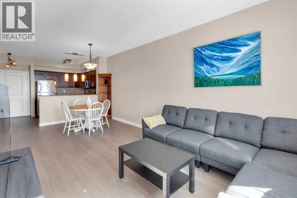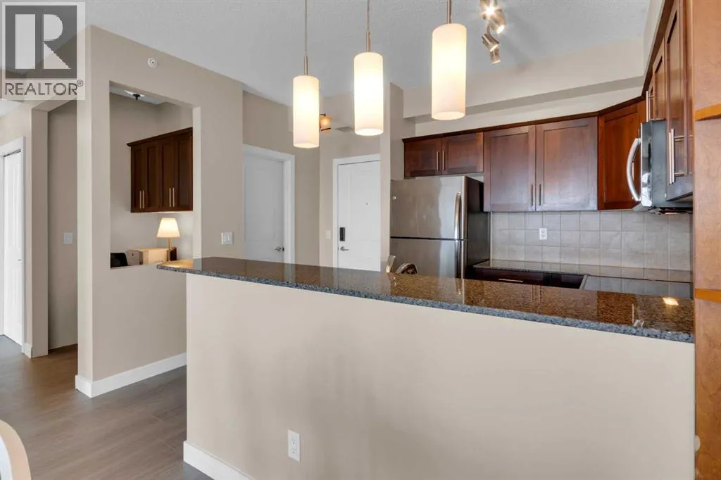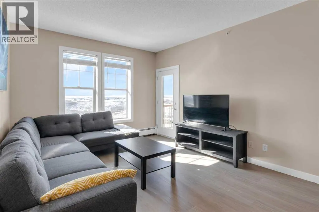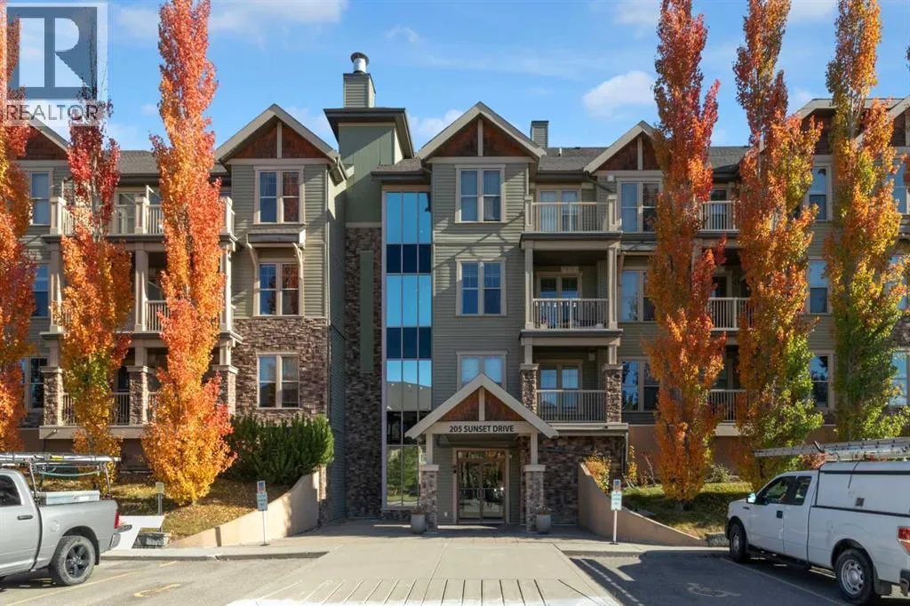 HOME SWEET HOME! Calling all first-time home buyers and investor's, welcome to this stunning, FRESHLY UPDATED TOP FLOOR CONDO with 2 PARKING STALLS in the sought-after community of Sunset Ridge in Cochrane! This chic unit offers 2 bedrooms, 1 bathroom, 858 exquisite SQFT that has been freshly updated with FRESH PAINT, NEW CARPET and LUXURY VINYL PLANK FLOORING (2026). Walking in to the unit you are greeted by the contemporary kitchen complete with stainless steel appliances, granite countertops, granite island with an eating bar, tiled backsplash, warm maple cabinetry and stylish light fixtures. Next to the kitchen you will find the bright formal dining room, spacious sun-drenched living room with access to the massive deck to enjoy your breathtaking views of the mountains. Completing the unit are an office nook, a two great-sized bedrooms including the magnificent primary bedroom with a spacious walk-in closet, lavish 4 piece bathroom with a relaxing soaker tub perfect to enjoy after a long day, separate, private shower and in-suite laundy. This unit includes a titled indoor parking stall, outdoor parking stall, assigned storage locker and exclusive access to the amenities featured in the popular, pet friendly 'Alora at Sunset Ridge' building include a fitness facility, guest suites, visitor parking and more. Close to all major amenities including shopping, restaurants, beautiful dog walking trails, schools (St. Timothy Catholic School and Rancheview School), quick drive to Calgary and easy access to escape to the mountains. This unit is a MUST VIEW, book your private viewing today! Please note that the pet rules allow for one pet under 18 pounds. Guest suite is $50/night + $35 janitorial fee if owner wishes to book for visiting guests. (id:27476)