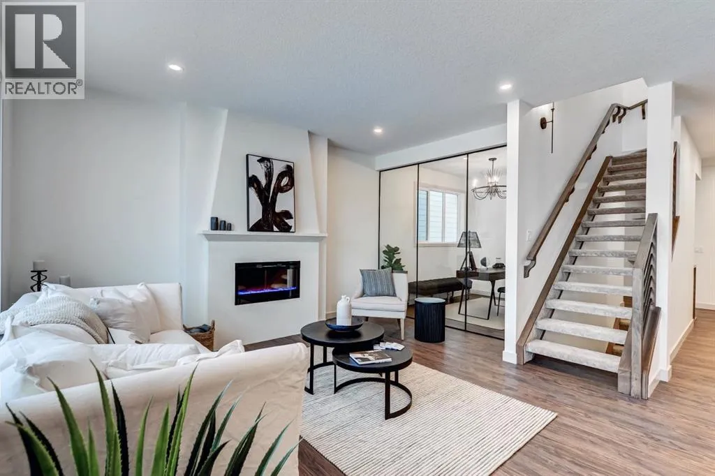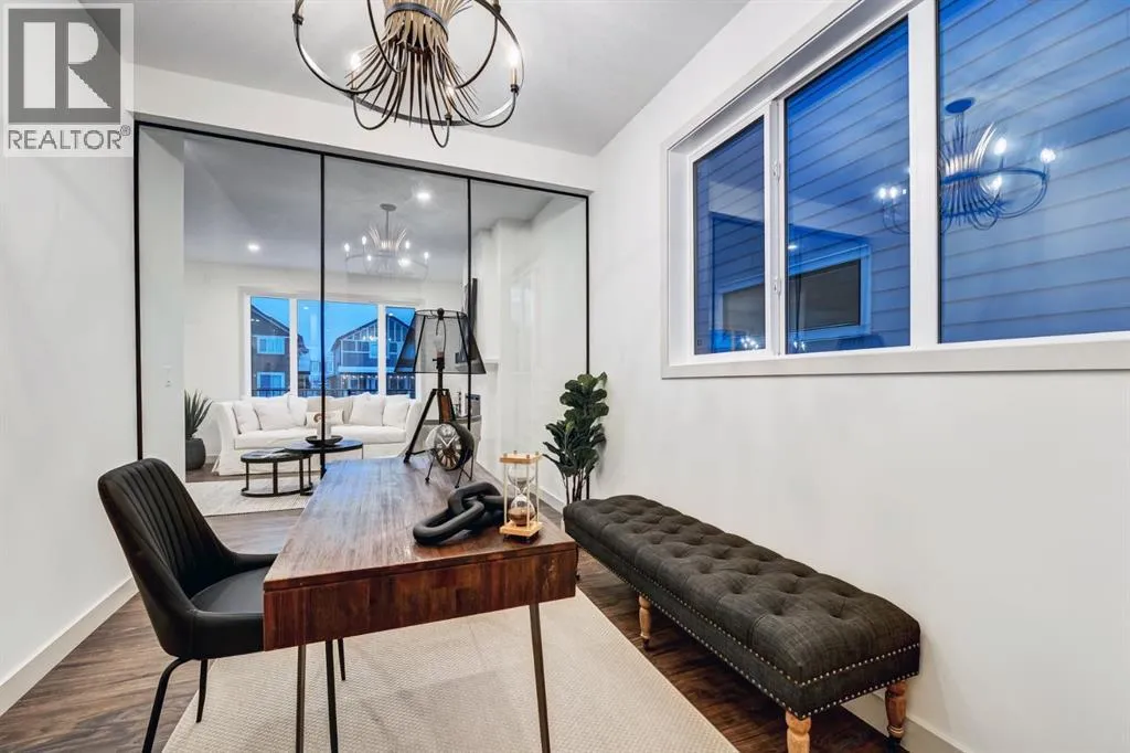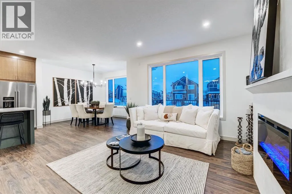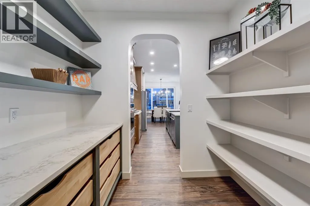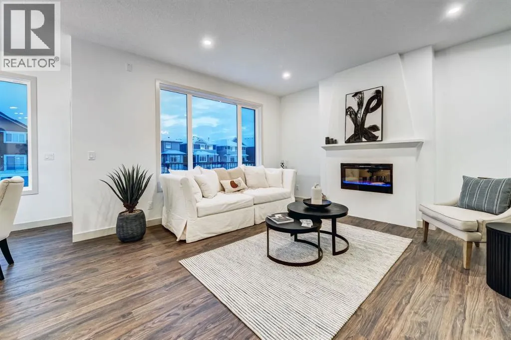 This spectacular walkout showhome by Castellano Custom Homes in the sought after Sunset Ridge community of Cochrane offers the perfect blend of modern luxury and family friendly living. Backing directly onto a peaceful green space with a playground just steps away, this never lived in beauty creates an ideal backyard setting for outdoor relaxation, playtime, and everyday enjoyment. All while providing quick access to walking paths, parks,  schools, shopping, dining, and seamless commutes to Calgary and the Rockies. Step inside this stunning two storey walkout home, and be greeted by an inviting foyer featuring elegant built in shelving, neutral tones, and luxury vinyl plank flooring that flows seamlessly throughout. The open concept main floor is designed for effortless entertaining and family life, highlighted by a gourmet kitchen with a massive island boasting waterfall edge quartz countertops, premium custom cabinetry, high end KitchenAid appliances (including gas range and spacious fridge), a deep farmhouse sink, and stylish arched transitions that frame the adjacent dining and living areas. The living space impresses with soaring ceilings, a custom fireplace with dramatic surround and mantel, chic modern chandelier, and large sliding doors opening to the backyard green space. Perfect for seamless indoor outdoor enjoyment and family gatherings. A versatile den/flex room, and practical mudroom add everyday convenience. Upstairs, retreat to a generous primary suite complete with a luxurious 5-piece ensuite (featuring a freestanding soaker tub, frameless glass shower, dual vanity, and herringbone tile accents), plus an expansive walk-in closet with fully customized white cabinetry, shelving, drawers, and organizers. Which cleverly opens to your own private hidden room tucked behind the shelves looking out onto a beautiful green space. The spacious bonus/family room is a real stunner with vaulted ceilings, tons of light flooding in from the windows and skylights, an d a striking geometric board and batten accent wall ideal for media nights, or relaxation. In addition there are 2 additional large sized bedrooms and laundry room conveniently located upstairs for ultimate family ease. This showhome at 128 Sunrise Heath is more than a display itâs inspiration for your dream home. Visit today to tour this exceptional Castellano Custom build, speak with the team about customizing your own residence in Sunset Ridge (including walkout options), and discover why families choose Castellano for quality, personalization, and lifelong value. (id:27476)