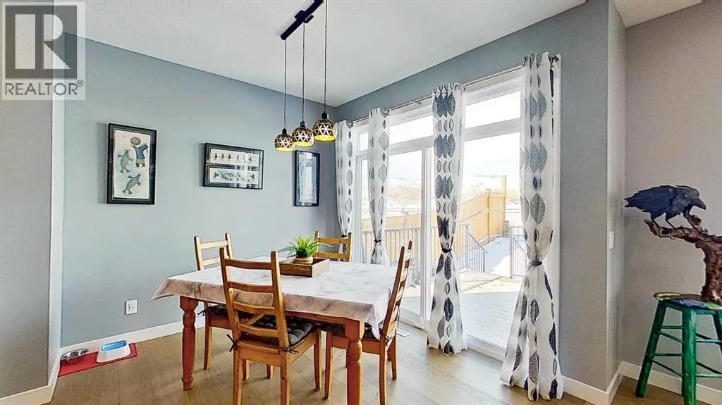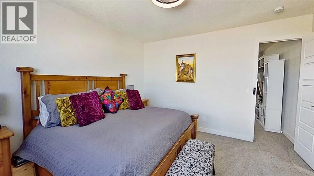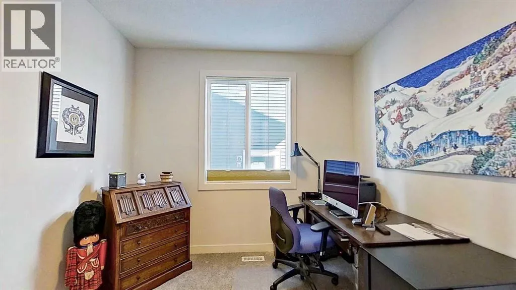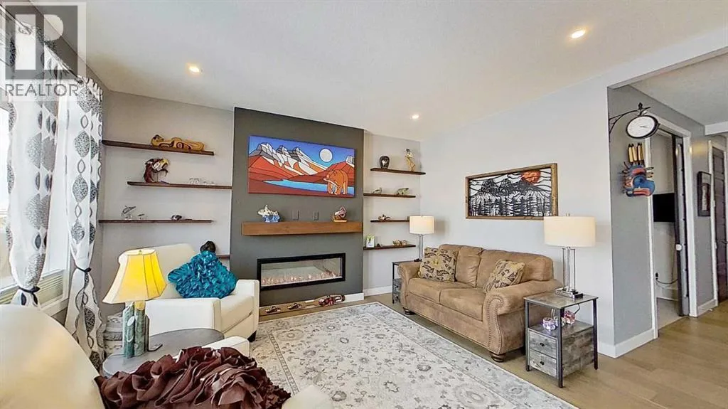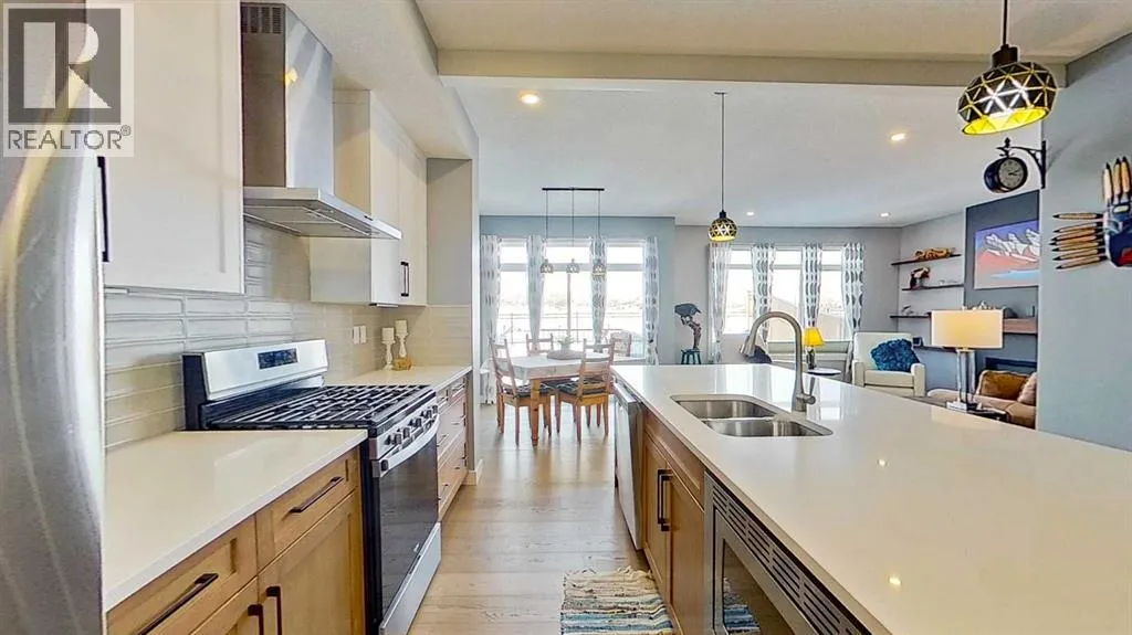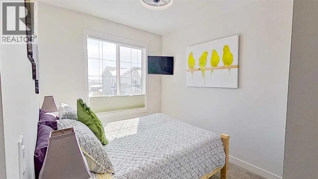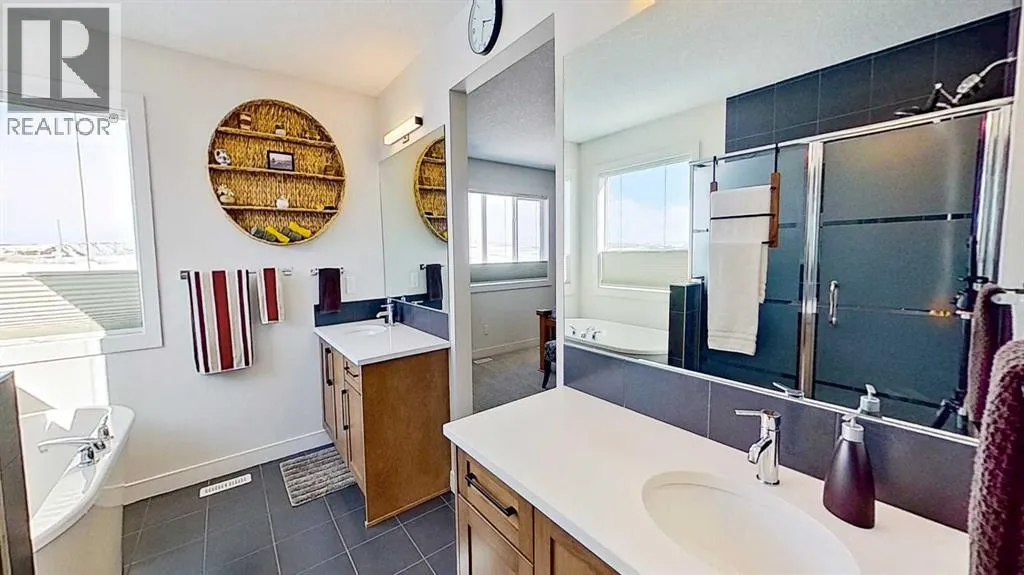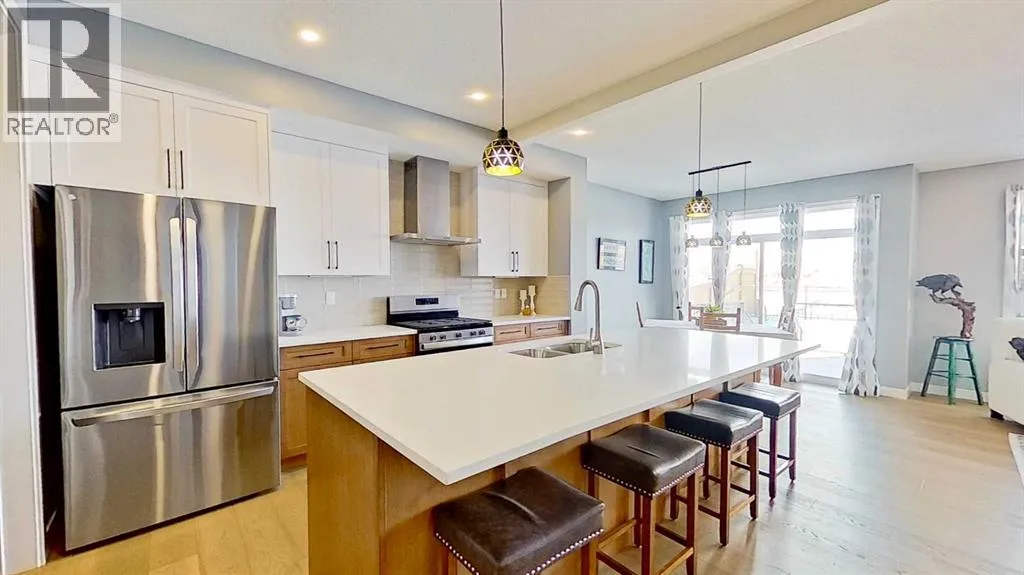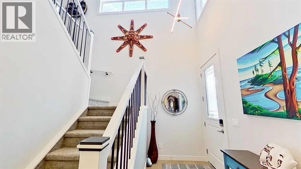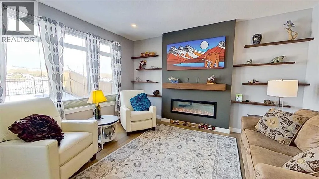 Rocky Mountain views from this 2,016 sq. ft. detached home located in Sunset Ridge, Cochrane. The home features a south-facing front exposure, a fully fenced backyard, and backs onto a planned pathway. Interior features include 9-foot ceilings, engineered hardwood flooring, and large windows providing natural light. The kitchen includes a quartz island, quartz countertops, and upgraded appliances. The great room includes an electric fireplace, and the home is equipped with central air conditioning. Upstairs, the primary bedroom includes a walk-in closet, 5-piece ensuite, and access to the laundry area, along with a loft space. The main floor includes a flex room with double doors suitable for office or hobby use. Additional features include a double attached garage, landscaped and fenced yard, and an unfinished basement. Located within walking distance to a planned community centre and future school, near RancheView Kâ8 School and St. Timothy High School, approximately 30 minutes to Calgary, approximately 40â45 minutes to the Rocky Mountains, and minutes from downtown Cochrane. (id:27476)