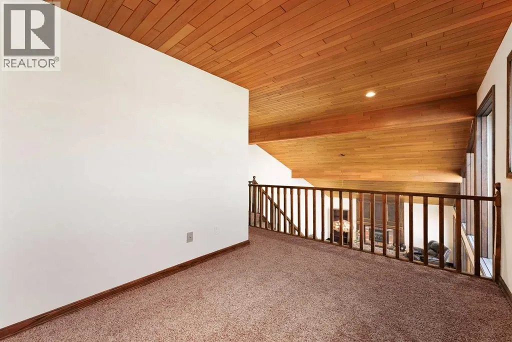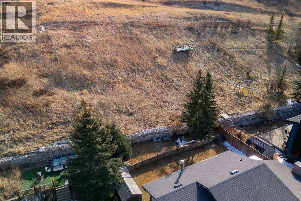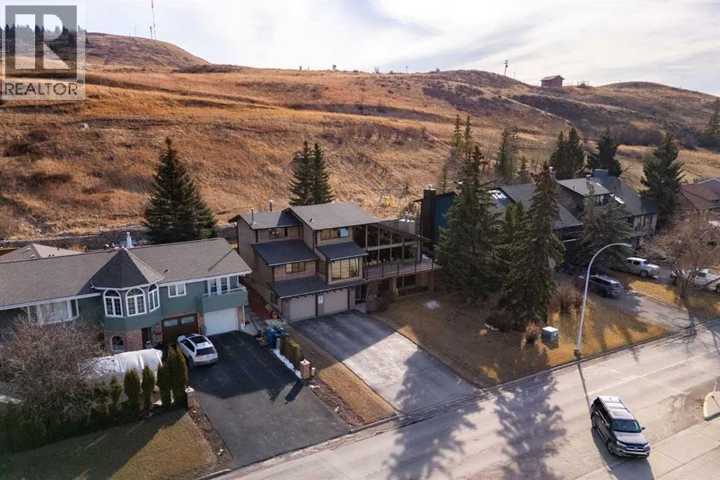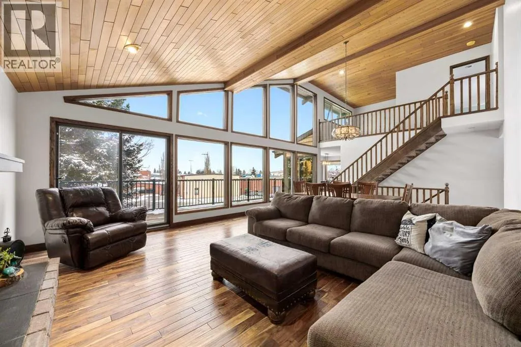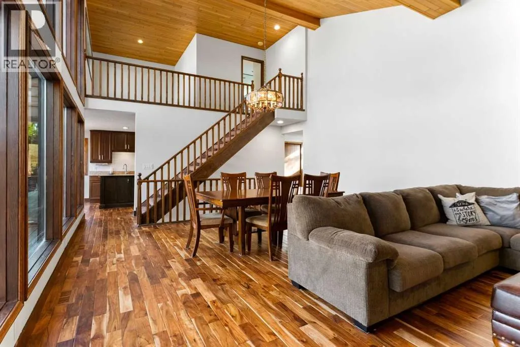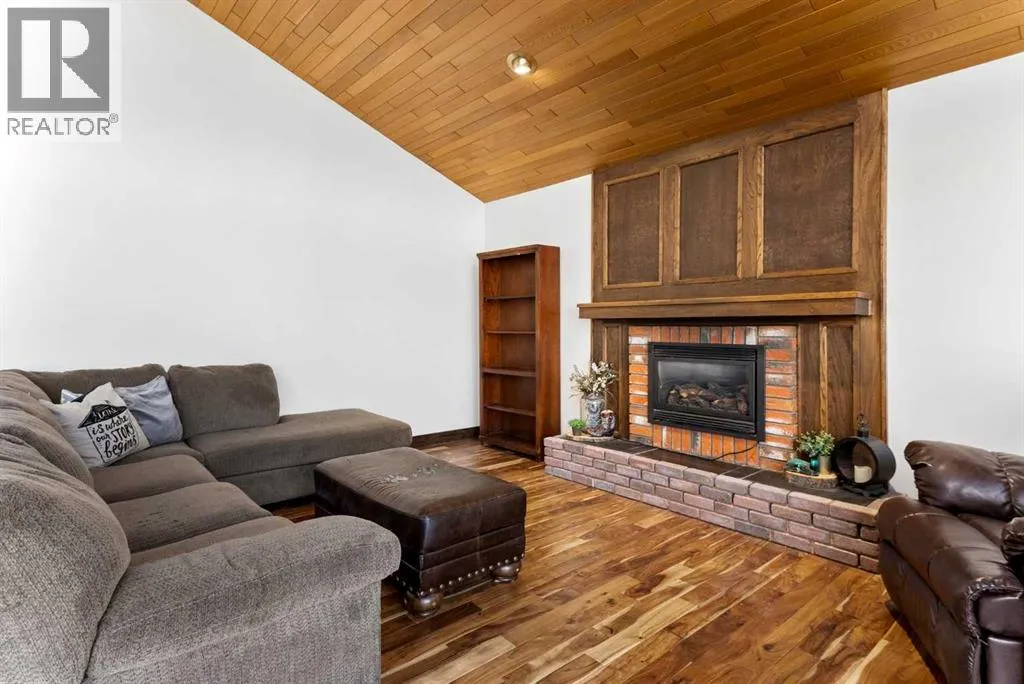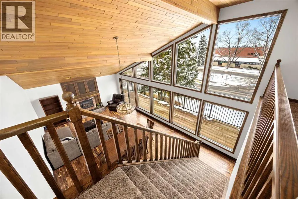 Set on a spacious 0.40-acre lot directly across from Cochraneâs tri-school site and indoor arena. This home is perfectly positioned for families; kids can walk to everything. Unique 1.5-storey reverse walkout offers 3 bedrooms and 2.5 bathrooms, combining comfort with a distinctive layout. The main entry welcomes you with a large, bright family room showcasing new luxury vinyl plank flooring and a cozy gas insert brick fireplace. Additional features include rough-in plumbing for a future wet bar, a convenient half bath with laundry, and direct access to the oversized 23' x 23' double attached heated garage, complete with durable epoxy floors. Upstairs, the main level showcases a spacious living and dining area with vaulted wood ceilings, a second gas fireplace, and a wall of tinted front windows plus sliding doors leading to the newly refurbished, wrap-around deck. Perfect for relaxing, entertaining, and taking in the surrounding mountain views. The kitchen is well-appointed with stainless steel appliances, granite countertops, under-mount lighting, an island, and a cozy breakfast nook with access to the deck, complete with gas line for BBQ. This level also includes two generously sized bedrooms, one featuring a Murphy bed, and a 5-piece bathroom with washer and dryer. A rear exit leads to a beautifully landscaped yard complete with patio, gazebo, and two storage sheds. The upper loft overlooks the main living space and is ideal for a home office, gym, or reading area. Adjacent is the primary suite, offering a walk-in closet, 4-piece ensuite, and lovely front and rear views of the property. Additional highlights include fresh paint and carpet, paved driveway with space for four vehicles, mature trees, and well-maintained landscaping. If you're looking for a home with character, space, and an unbeatable location, this is it. Quick possession available. (id:27476)