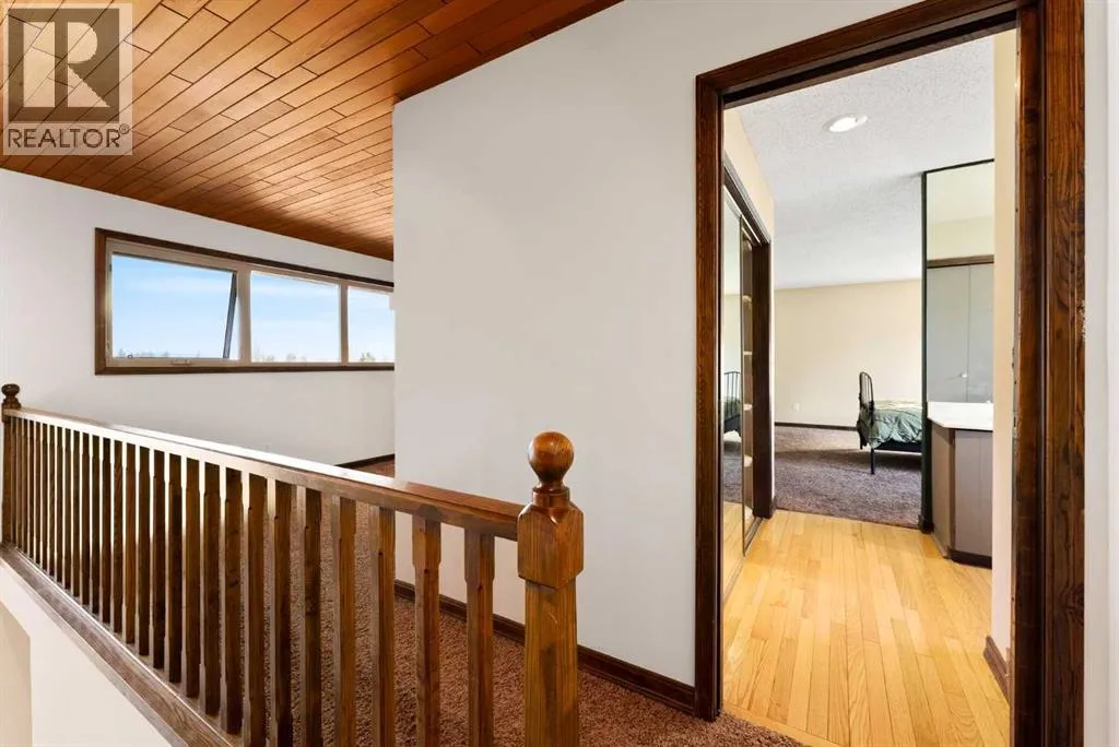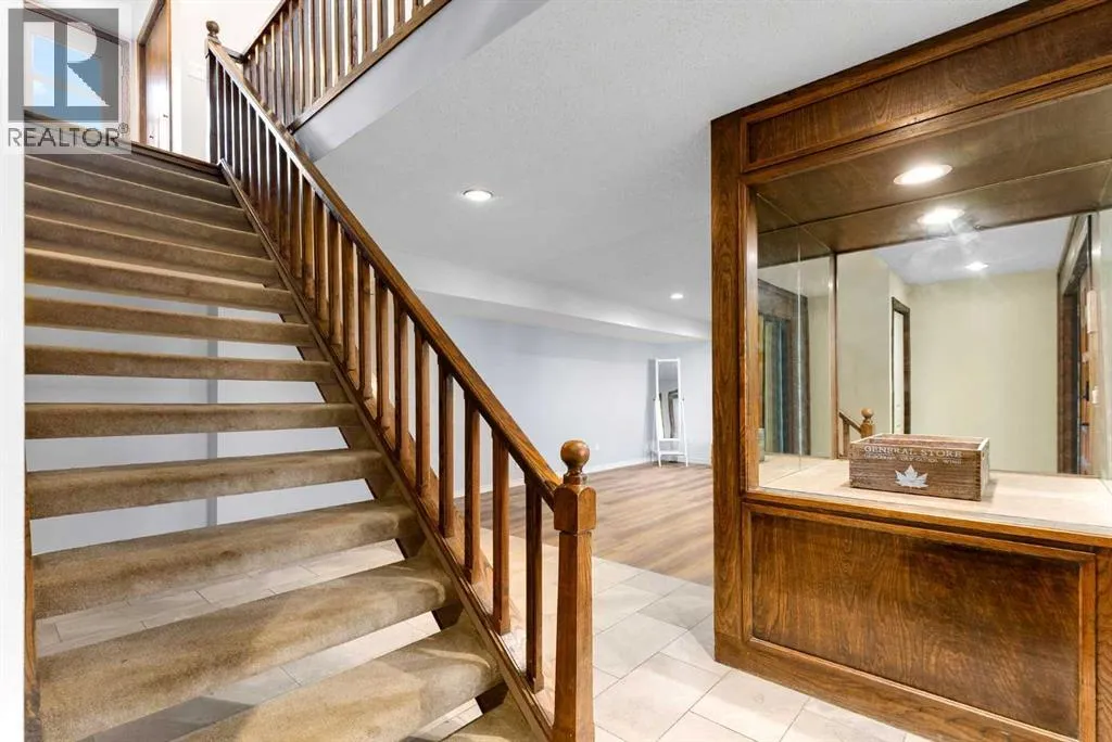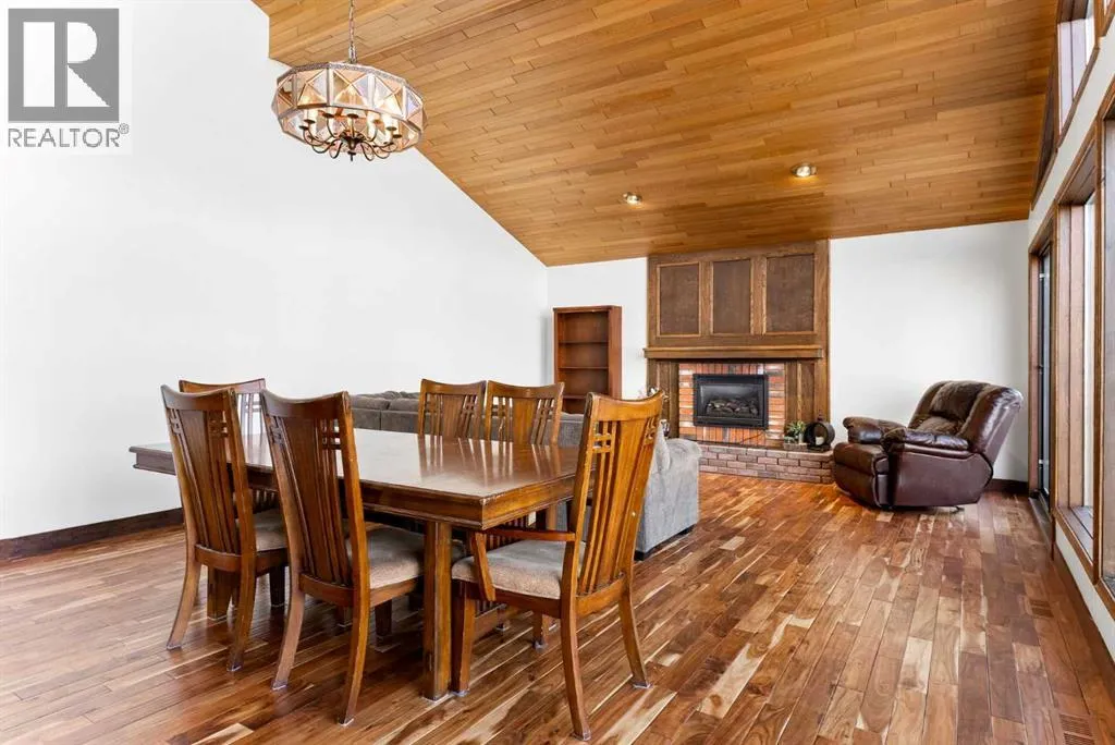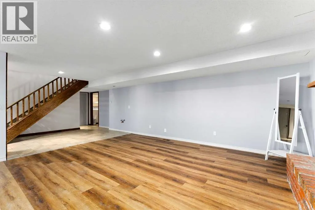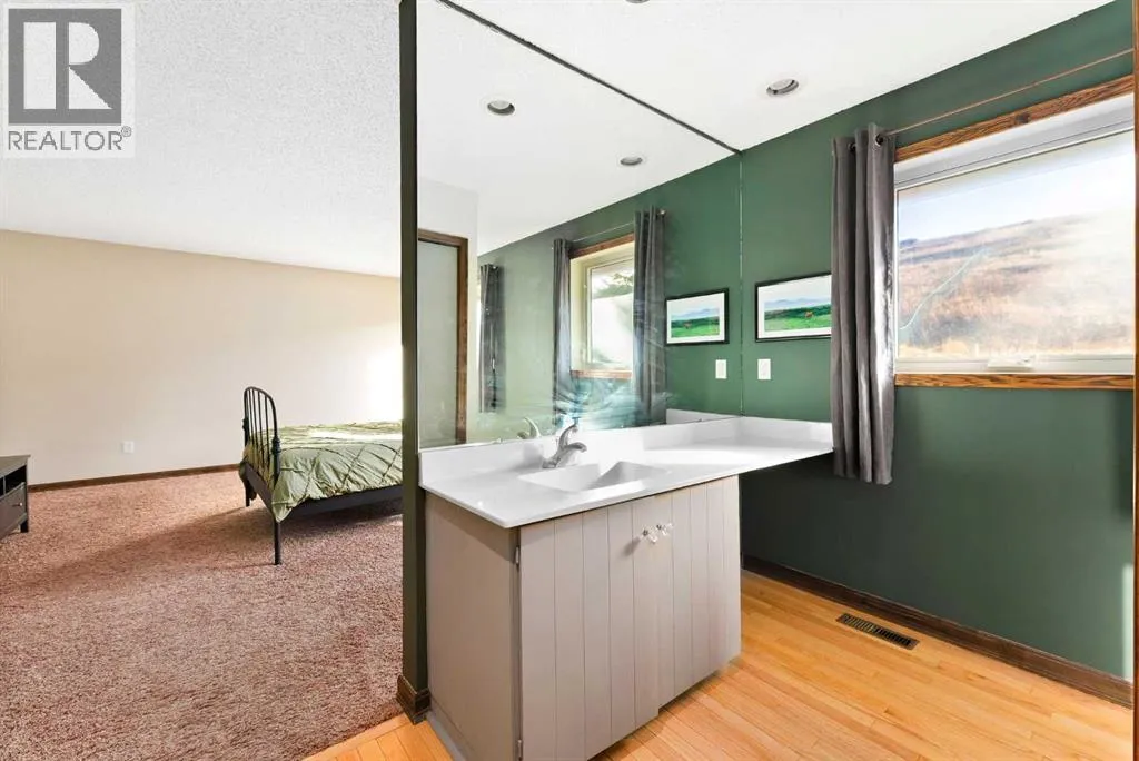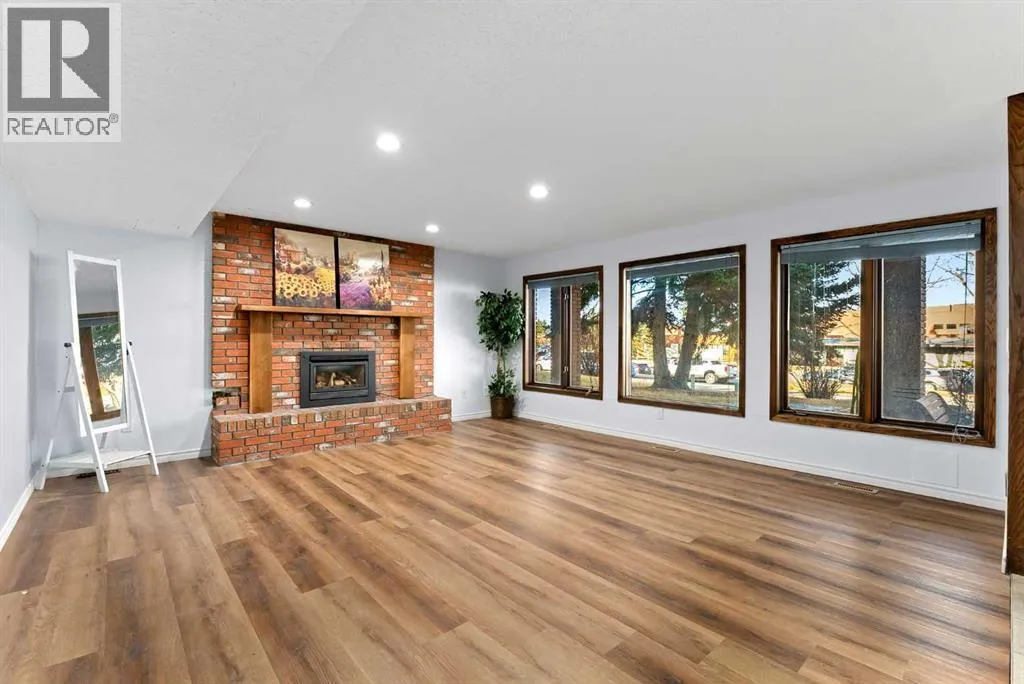 Set on a spacious 0.40-acre lot directly across from Cochraneâs tri-school site and indoor arena. This home is perfectly positioned for families; kids can walk to everything. Unique 1.5-storey reverse walkout offers 3 bedrooms and 2.5 bathrooms, combining comfort with a distinctive layout. The main entry welcomes you with a large, bright family room showcasing new luxury vinyl plank flooring and a cozy gas insert brick fireplace. Additional features include rough-in plumbing for a future wet bar, a convenient half bath with laundry, and direct access to the oversized 23' x 23' double attached heated garage, complete with durable epoxy floors. Upstairs, the main level showcases a spacious living and dining area with vaulted wood ceilings, a second gas fireplace, and a wall of tinted front windows plus sliding doors leading to the newly refurbished, wrap-around deck. Perfect for relaxing, entertaining, and taking in the surrounding mountain views. The kitchen is well-appointed with stainless steel appliances, granite countertops, under-mount lighting, an island, and a cozy breakfast nook with access to the deck, complete with gas line for BBQ. This level also includes two generously sized bedrooms, one featuring a Murphy bed, and a 5-piece bathroom with washer and dryer. A rear exit leads to a beautifully landscaped yard complete with patio, gazebo, and two storage sheds. The upper loft overlooks the main living space and is ideal for a home office, gym, or reading area. Adjacent is the primary suite, offering a walk-in closet, 4-piece ensuite, and lovely front and rear views of the property. Additional highlights include fresh paint and carpet, paved driveway with space for four vehicles, mature trees, and well-maintained landscaping. If you're looking for a home with character, space, and an unbeatable location, this is it. Quick possession available. (id:27476)