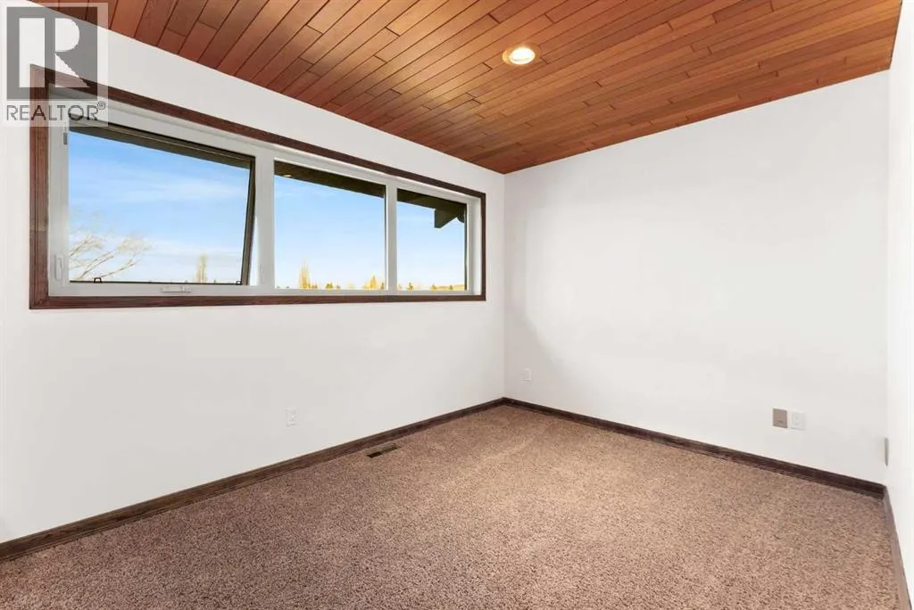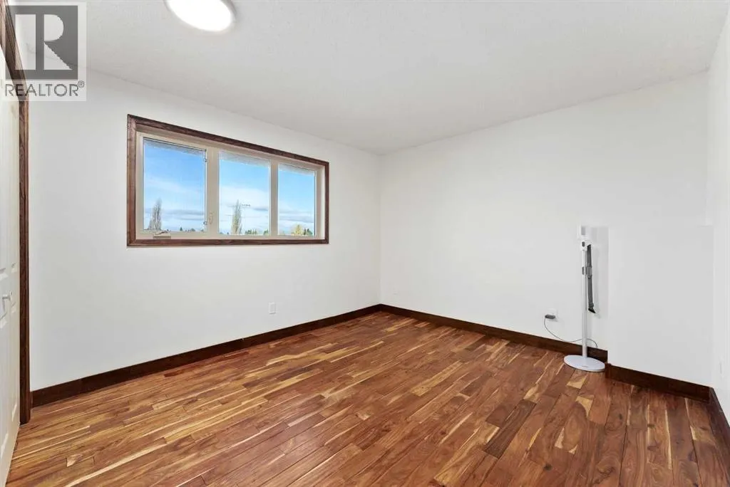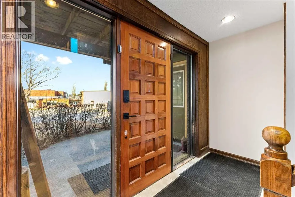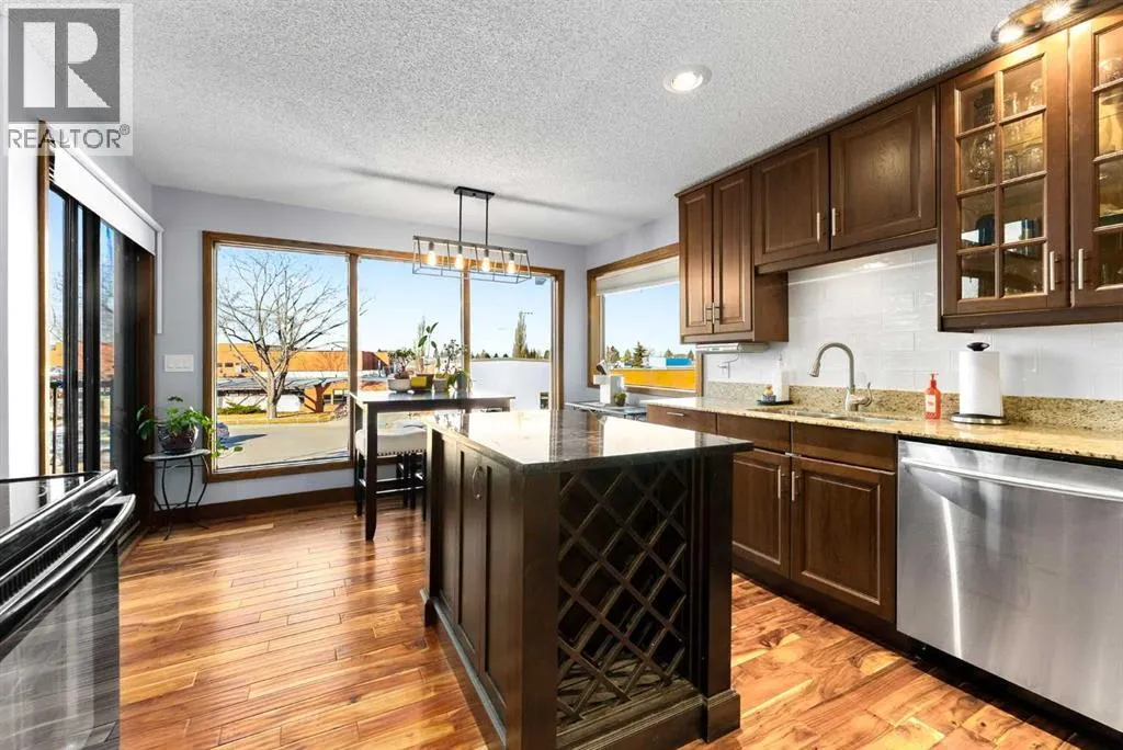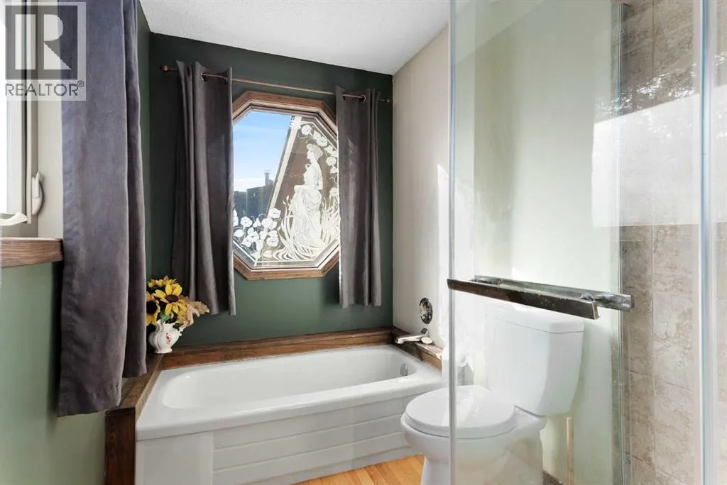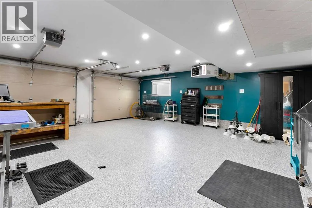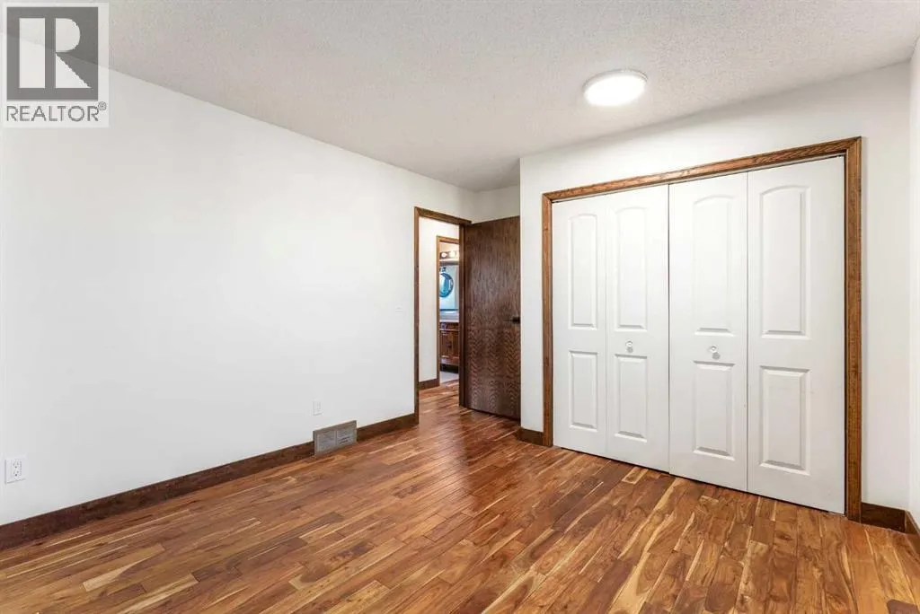 Set on a spacious 0.40-acre lot directly across from Cochraneâs tri-school site and indoor arena. This home is perfectly positioned for families; kids can walk to everything. Unique 1.5-storey reverse walkout offers 3 bedrooms and 2.5 bathrooms, combining comfort with a distinctive layout. The main entry welcomes you with a large, bright family room showcasing new luxury vinyl plank flooring and a cozy gas insert brick fireplace. Additional features include rough-in plumbing for a future wet bar, a convenient half bath with laundry, and direct access to the oversized 23' x 23' double attached heated garage, complete with durable epoxy floors. Upstairs, the main level showcases a spacious living and dining area with vaulted wood ceilings, a second gas fireplace, and a wall of tinted front windows plus sliding doors leading to the newly refurbished, wrap-around deck. Perfect for relaxing, entertaining, and taking in the surrounding mountain views. The kitchen is well-appointed with stainless steel appliances, granite countertops, under-mount lighting, an island, and a cozy breakfast nook with access to the deck, complete with gas line for BBQ. This level also includes two generously sized bedrooms, one featuring a Murphy bed, and a 5-piece bathroom with washer and dryer. A rear exit leads to a beautifully landscaped yard complete with patio, gazebo, and two storage sheds. The upper loft overlooks the main living space and is ideal for a home office, gym, or reading area. Adjacent is the primary suite, offering a walk-in closet, 4-piece ensuite, and lovely front and rear views of the property. Additional highlights include fresh paint and carpet, paved driveway with space for four vehicles, mature trees, and well-maintained landscaping. If you're looking for a home with character, space, and an unbeatable location, this is it. Quick possession available. (id:27476)