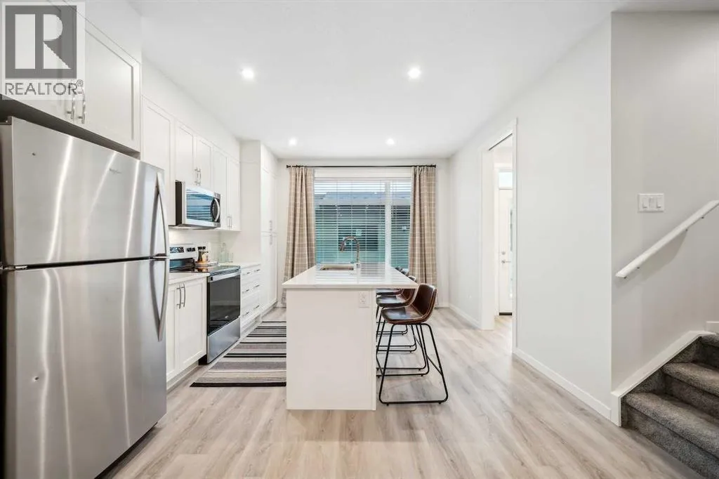 Welcome to ZEN Greystone, a vibrant and walkable community in the heart of Cochrane. This beautifully designed 3-bedroom, 2.5-bath townhome offers 1,434 sq. ft. of modern living space.The open-concept main floor features a spacious kitchen with stainless steel appliances, quartz countertops, and a large island that flows into the dining and living areasâperfect for entertaining.Upstairs, the primary suite includes a walk-in closet and an ensuite with a double vanity, while two additional bedrooms, a full bathroom, and upper-floor laundry provide everyday convenience.Additional highlights include a fenced backyard, parking pad, and optional basement development.Enjoy a walkable lifestyle close to pathways, parks, tennis courts, the Cochrane Pickleball Club, SLS Centre, off-leash dog park, Co-op, Bow RiversEdge Campground, and Downtown Cochrane. Experience the perfect blend of modern living and small-town charm at ZEN Greystone. Photos are from a completed showhome of the same model. Images are for illustrative purposes only. (id:27476)